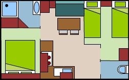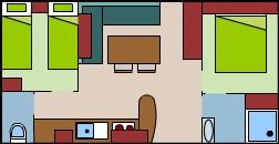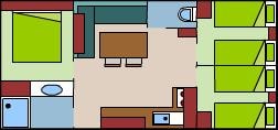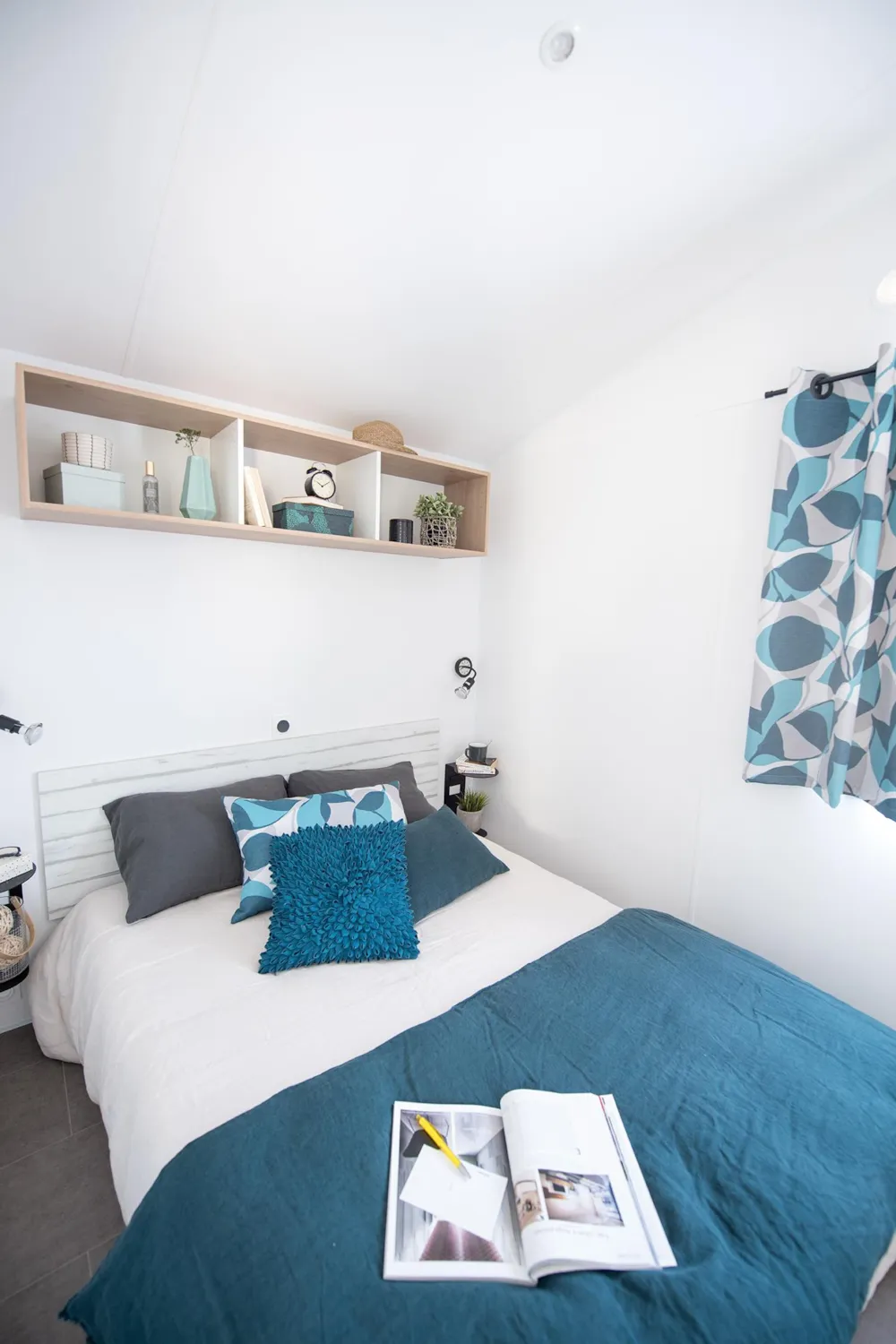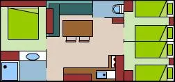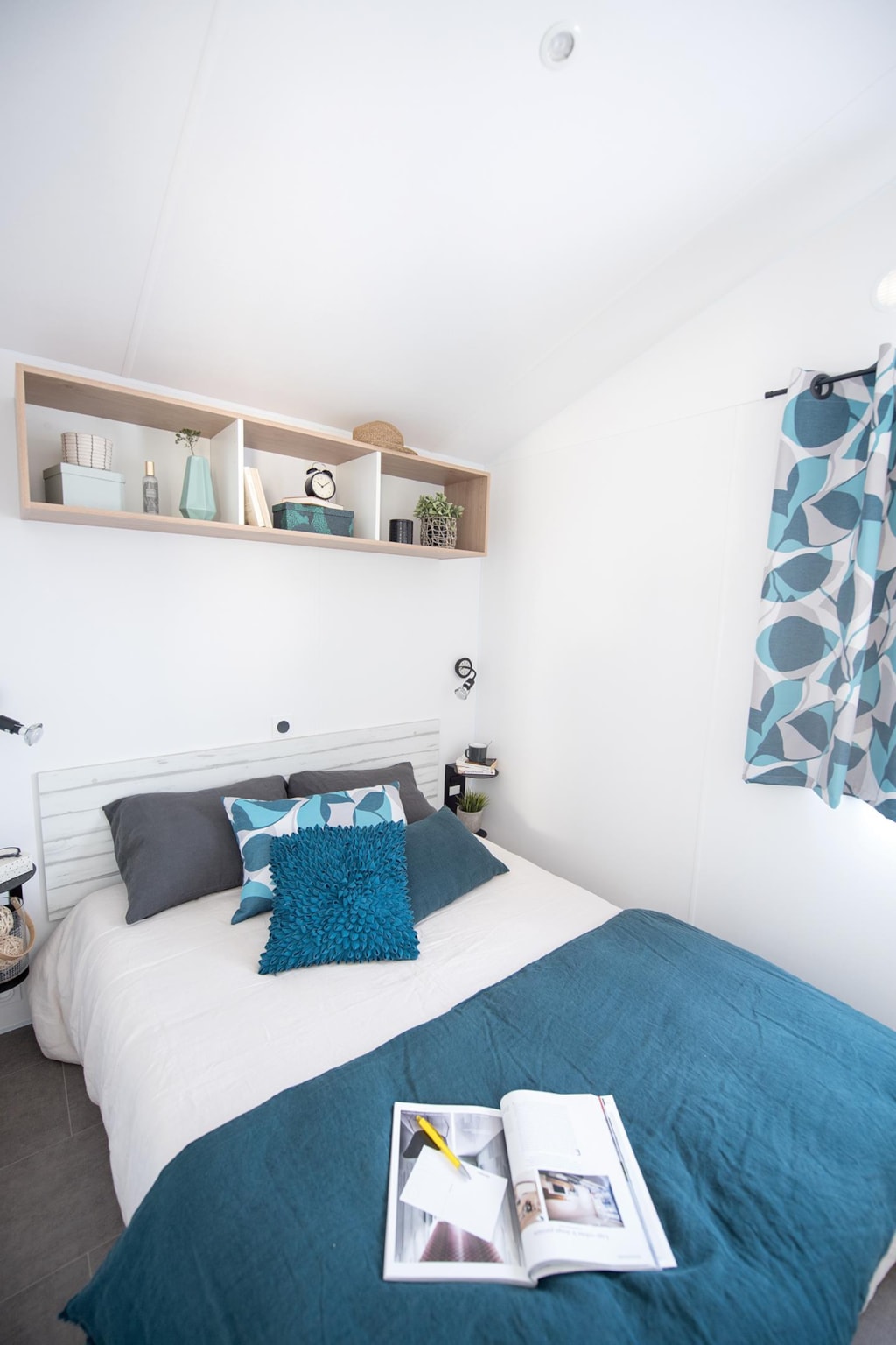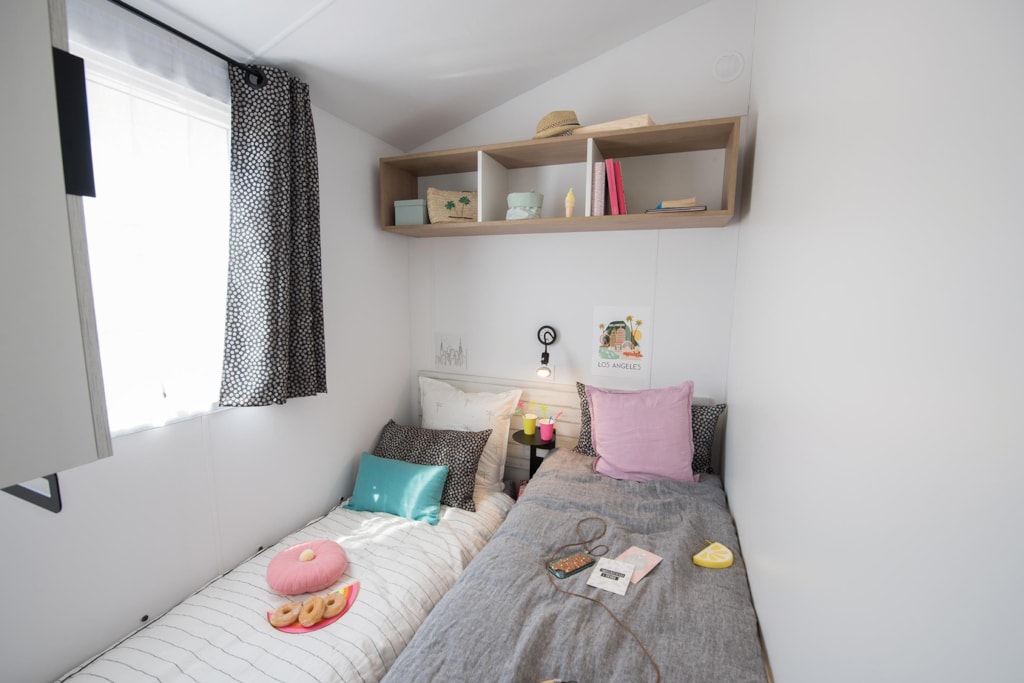 Das Confort Loggia Mobilheim mit einer Fläche von 25 m² eignet sich ideal, um bis zu vier Personen in einem warmen und funktionalen Ambiente unterzubringen. Es besteht aus zwei gut aufgeteilten Schlafzimmern: einem mit einem Doppelbett (140 x 190 cm) und einem Kleiderschrank sowie einem zweiten mit zwei Einzelbetten (80 x 190 cm) und zusätzlichem Stauraum. Für Ihren Komfort werden Decken, Kissen und eine Badematte bereitgestellt.
