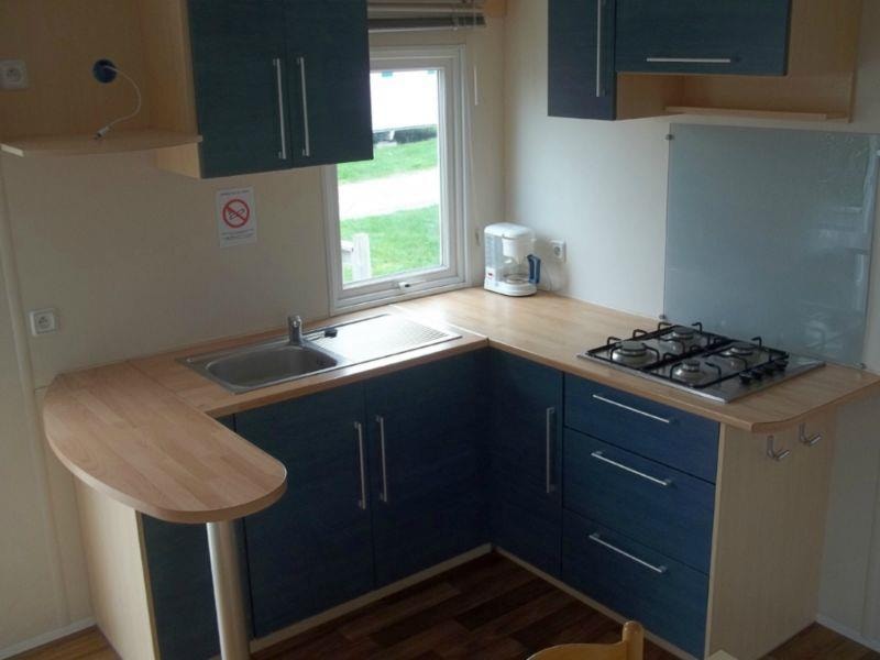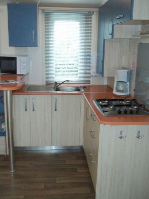 Das helle Wohnzimmer bietet einen freundlichen Bereich für gemeinsame Familienmomente, während die offene, vollständig ausgestattete Küche mit vier Gasfeldern, Kühl-Gefrierkombination, Mikrowelle und Kaffeemaschine die tägliche Essenszubereitung erleichtert. Das Mobilheim verfügt über ein Badezimmer mit Dusche und Waschbecken sowie ein separates WC. Ein Fernseher steht ebenfalls für entspannte Momente zur Verfügung.