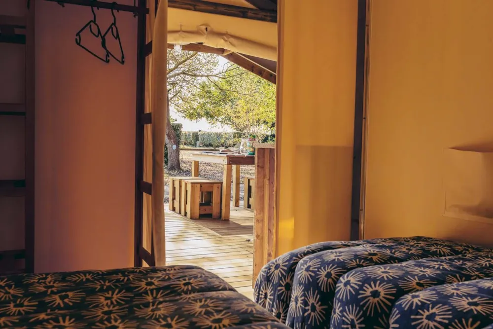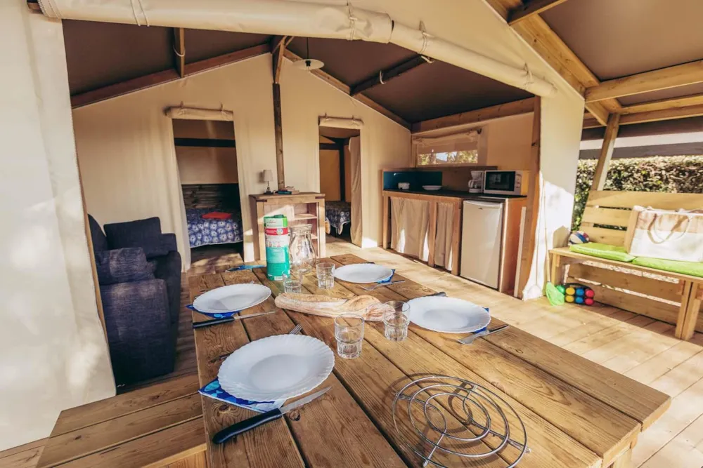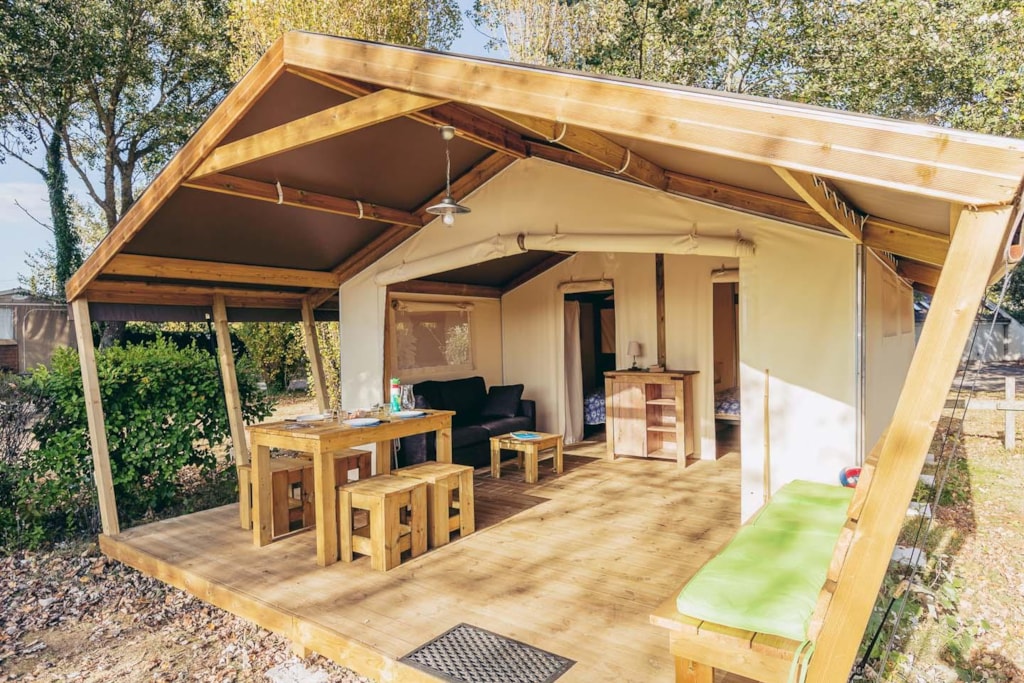 Unser exklusives 37 m² großes Flower-Camping-Zelt (ohne WC, Dusche oder Wasseranschluss: Sanitäranlagen in der Nähe) wird Sie mit seiner Größe, Modernität und seiner Offenheit zur Natur begeistern – mit einer großen Terrasse, auf der Sie Ihren Aufenthalt in vollen Zügen genießen können.