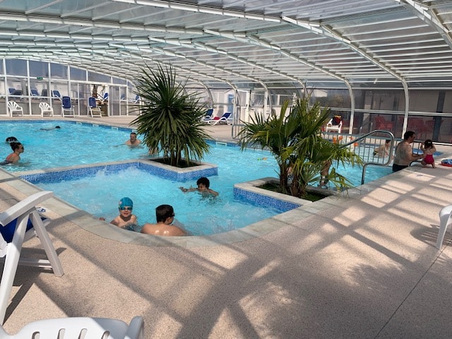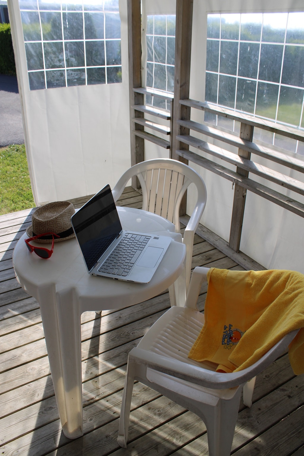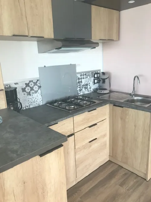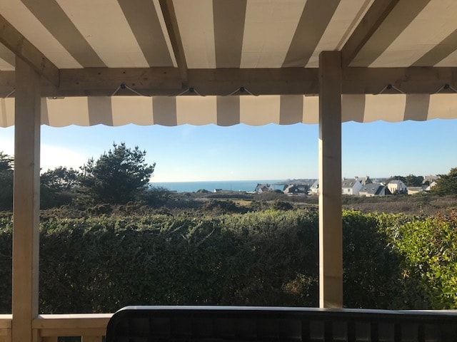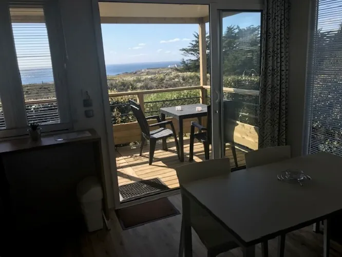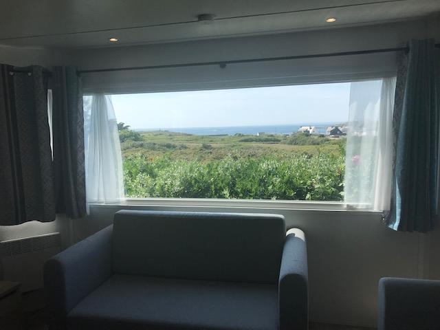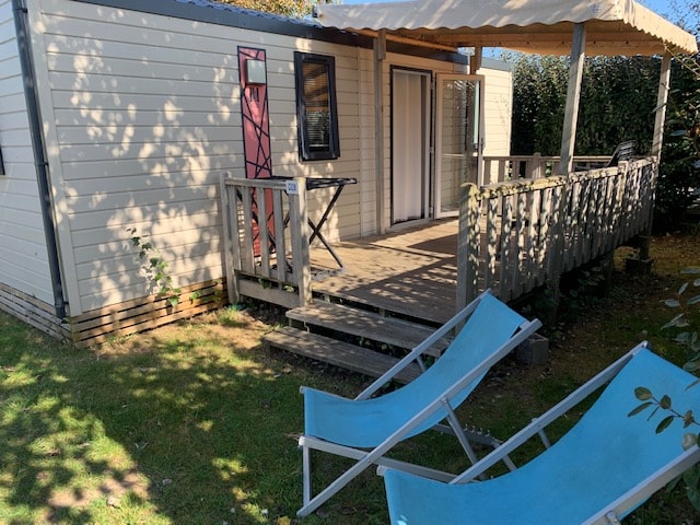 Mobil Home équipé de 2 portes baies sur terrasse couverte, avec vue sur l'océan. Au calme, sur parcelle intime. Lave vaisselle, sèche chevaux, sèche serviettes, cafetière, machine expresso. Draps et linge de Bain inclus Plancha électrique et Transats