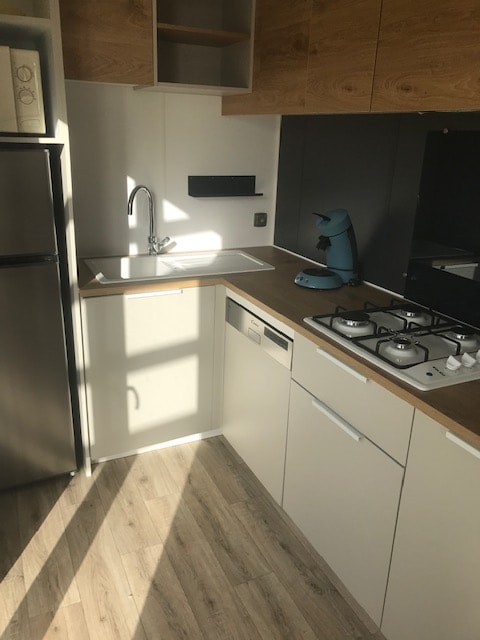 Mobil Home 3 chambres Premium avec baie panoramique vue sur mer. Terrasse semi couverte, modèle tout confort. Lave vaisselle, sèche cheveux, machine expresso, et Barbecue à gaz Draps et linge de Bain inclus
