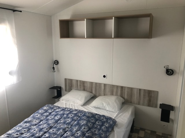 Mobil Home Premium , avec terrasse face à la mer. Lave Vaisselle, sèche cheveux, sèche serviettes, Draps et linge de bain inclus, Plancha électrique, Transats... Idéal pour une famille avec 2 adultes et 2 enfants (1 chambre Gd Lit 160 et 1 chambre avec Lits superposés) (Lits superposés dans la chambre enfant)