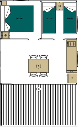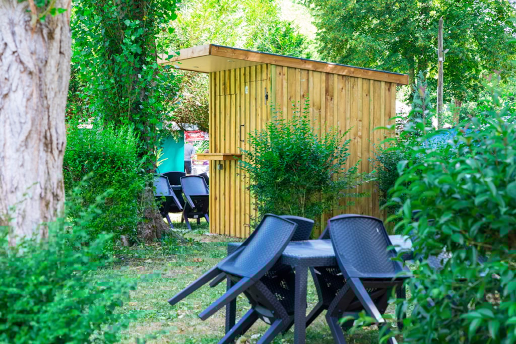 Unsere Stellplätze variieren zwischen 80 und 120 m² und bieten Ihnen Platz für Ihr Zelt, Ihren Wohnwagen oder Ihr Wohnmobil, entweder in voller Sonne oder im Schatten. Diese Stellplätze sind mit einem 5 m² großen Chalet ausgestattet, das mit einem oberen Kühlschrank, einer Mikrowelle, einer Kaffeemaschine, einem 2-Flammen-Gasherd, einem Tisch und 6 Stühlen, Geschirr für 6 Personen und 2 Liegestühlen ausgestattet ist, wäscheständer