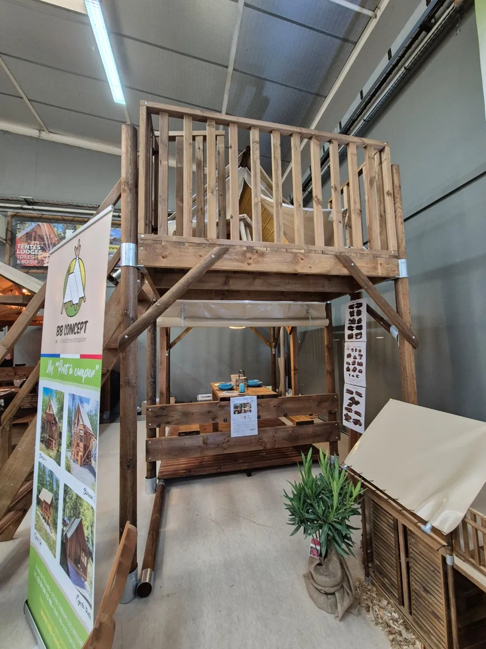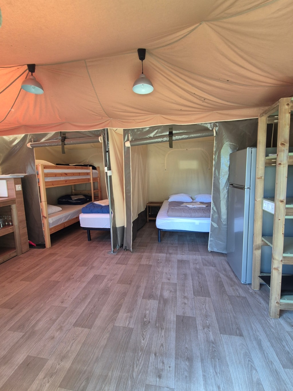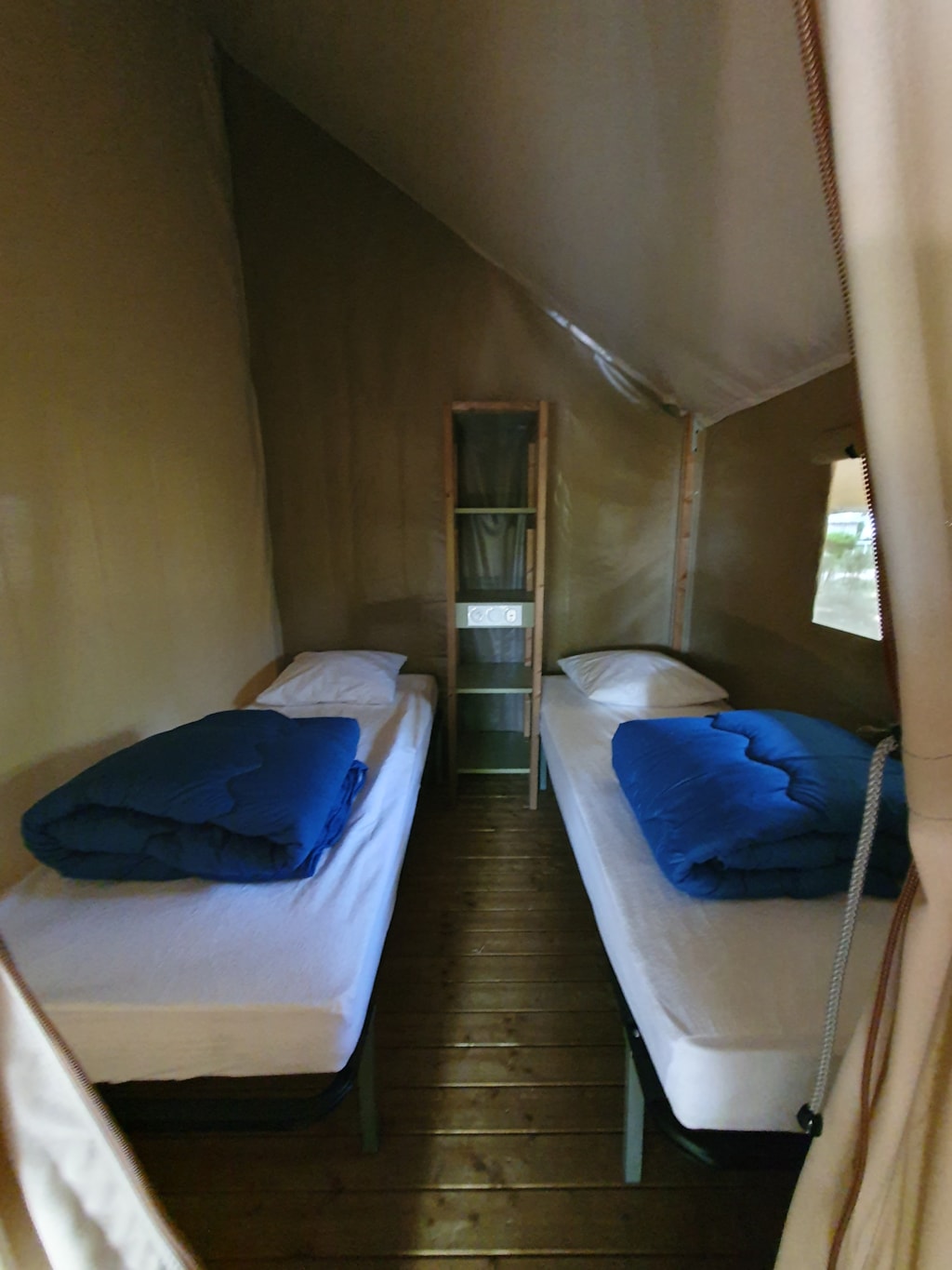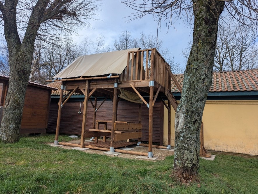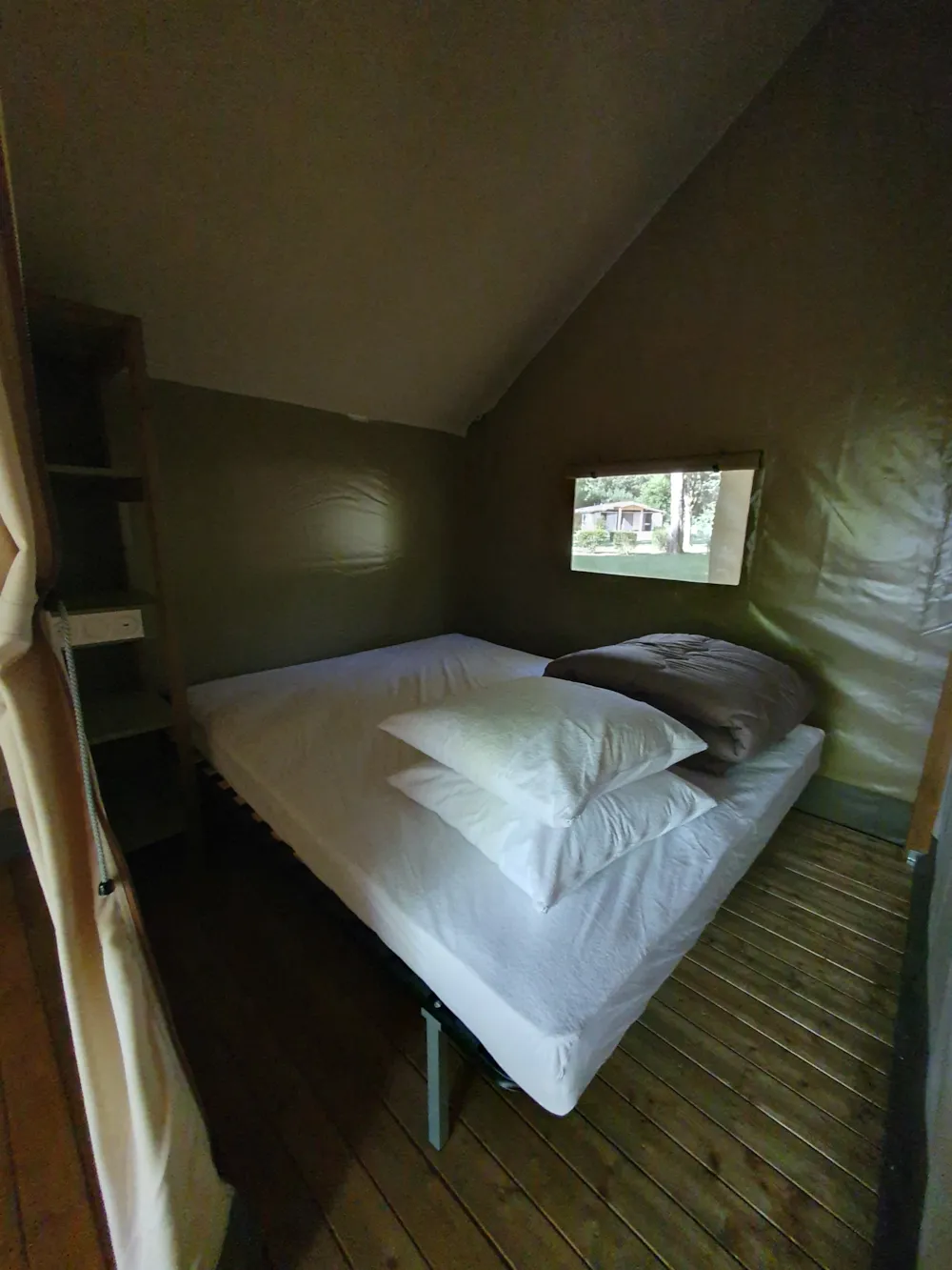 Entdecken Sie unser Biwakzelt auf Stelzen, eine Kombination aus Holz und Segeltuch. Es verfügt über ein 5 m² großes Schlafzimmer mit zwei 80 cm breiten Betten und Zugang zu einer 2 m² großen, schwebenden Terrasse mit Liegestühlen.