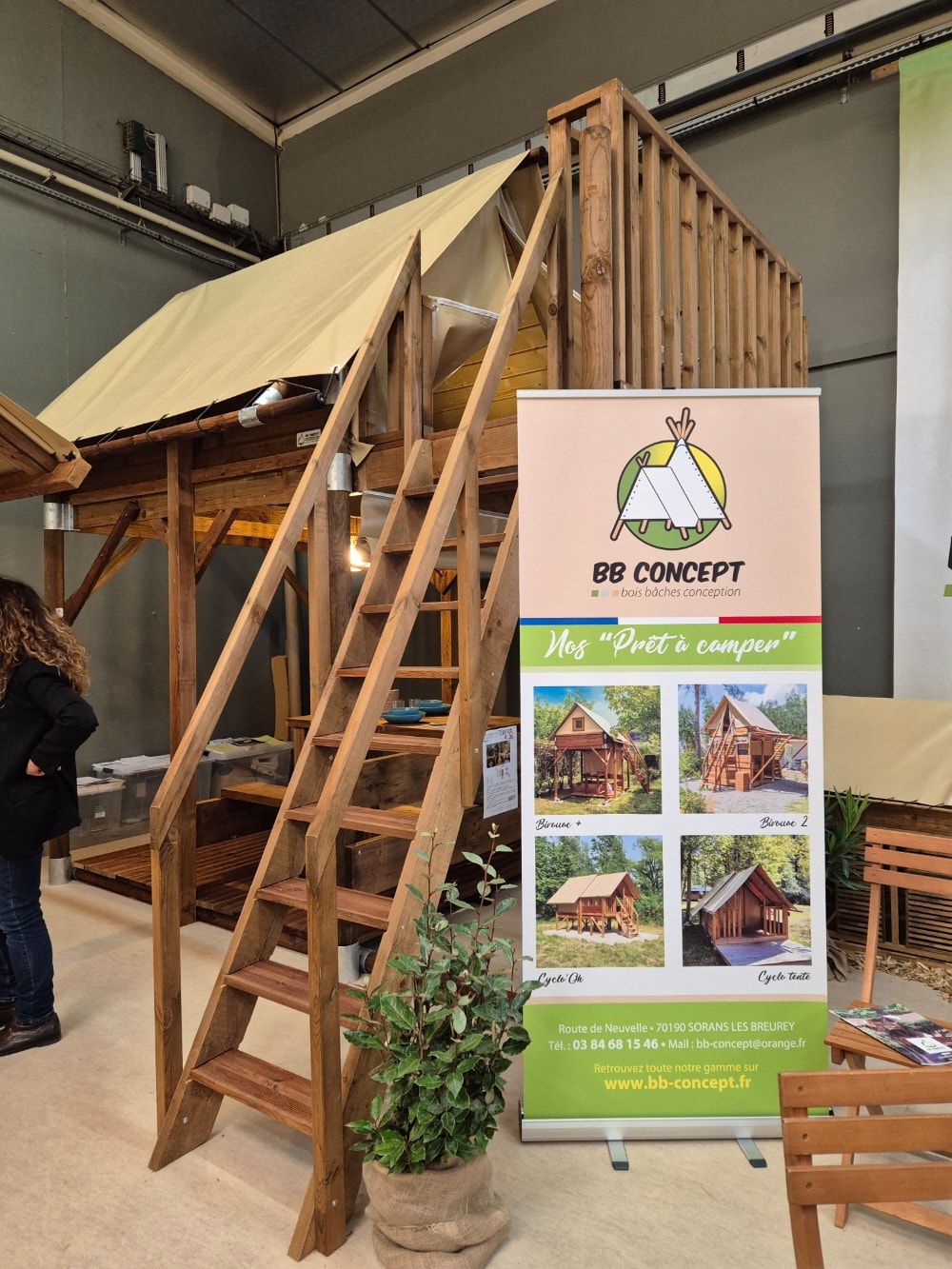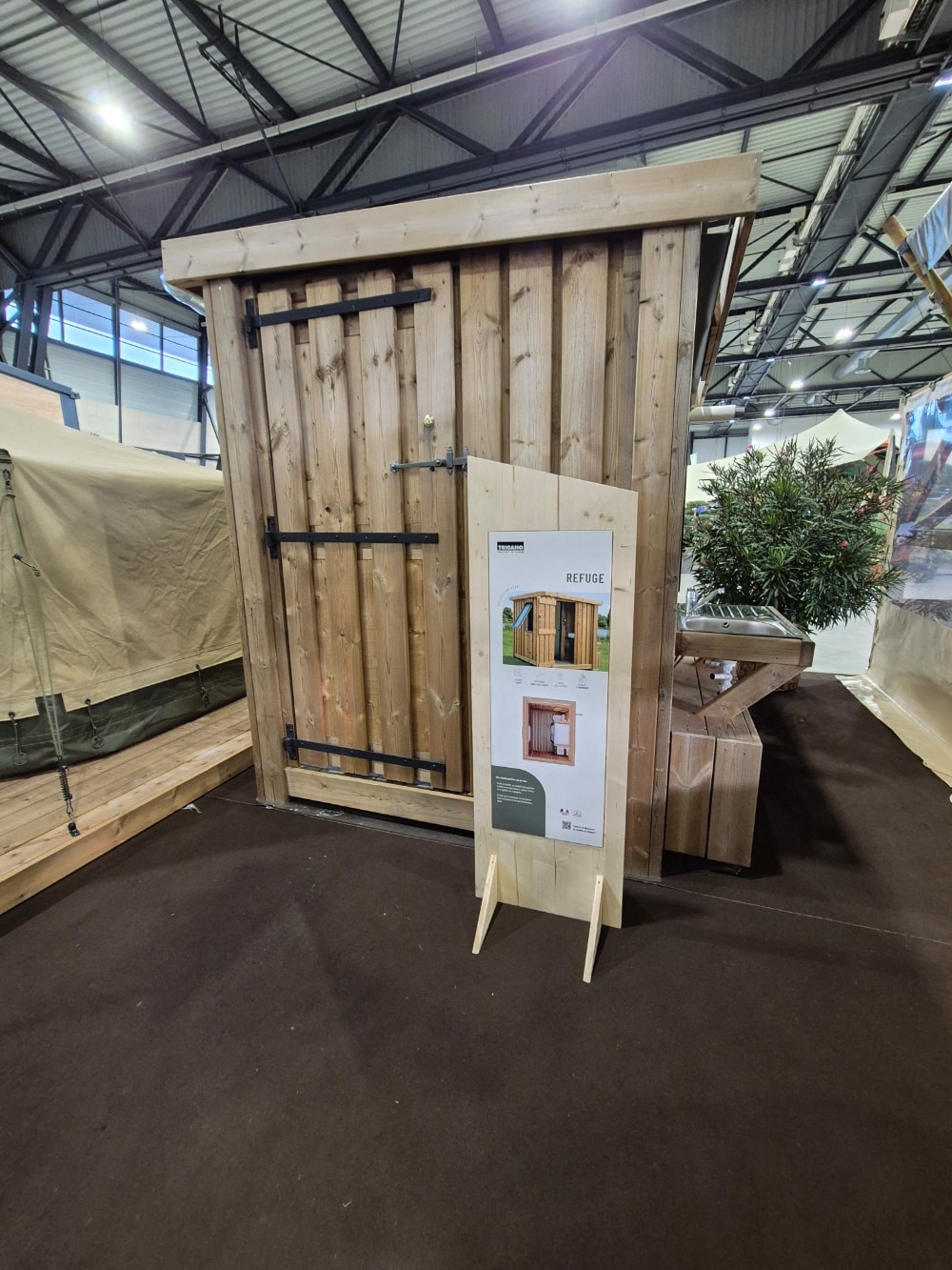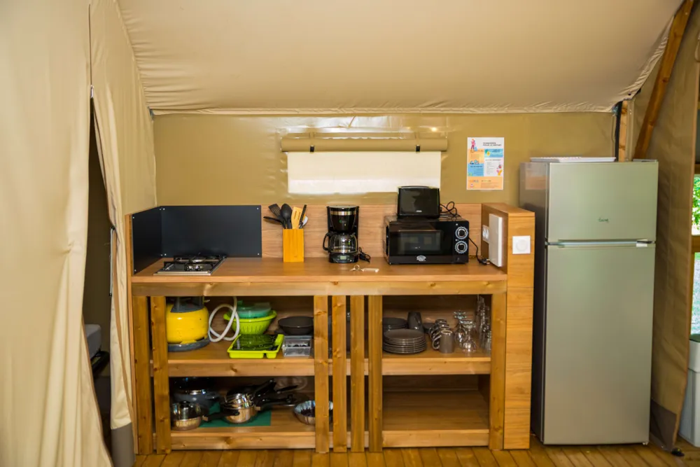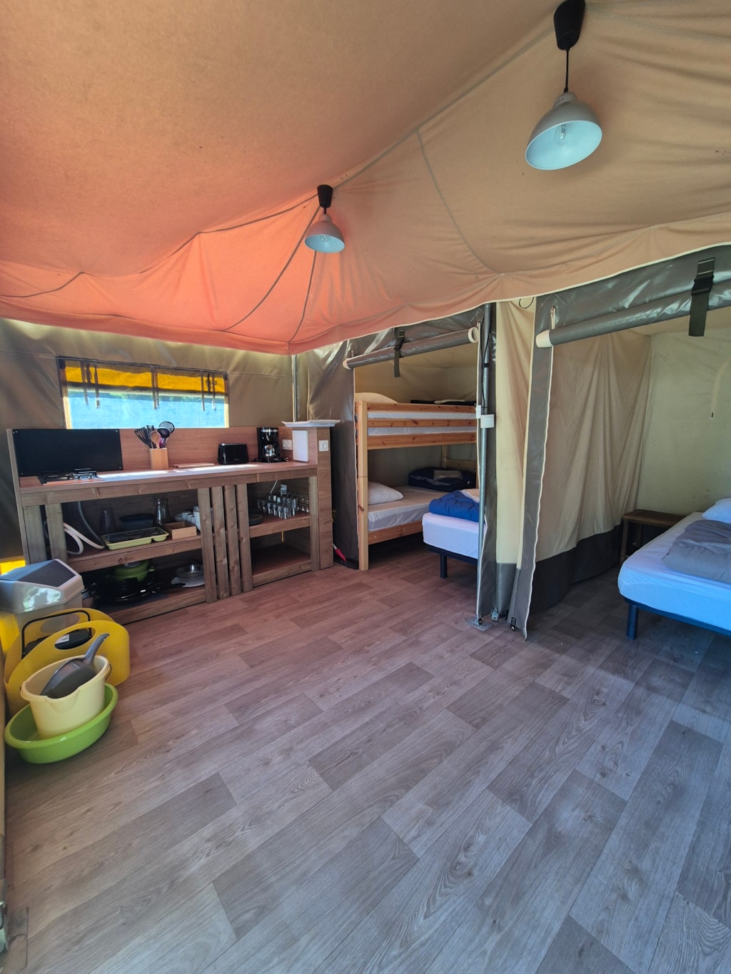 Entdecken Sie unser Biwakzelt auf Stelzen, eine Kombination aus Holz und Segeltuch. Es verfügt über ein 5 m² großes Schlafzimmer mit zwei 80 cm breiten Betten und Zugang zu einer 2 m² großen, schwebenden Terrasse mit Liegestühlen.