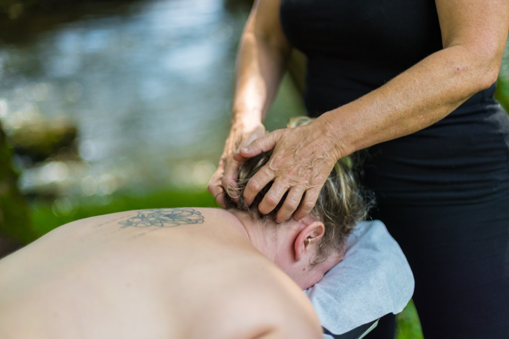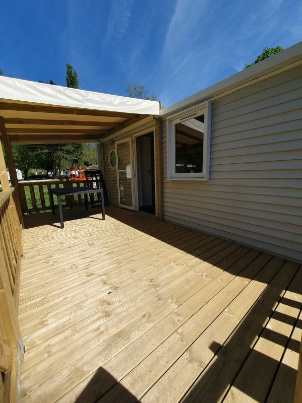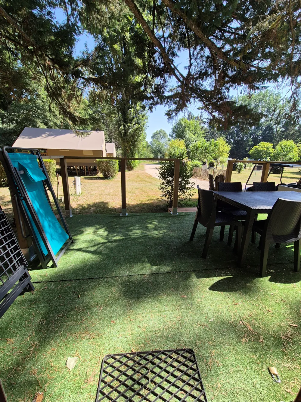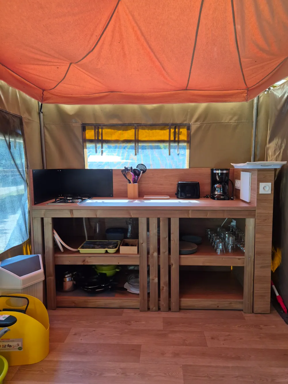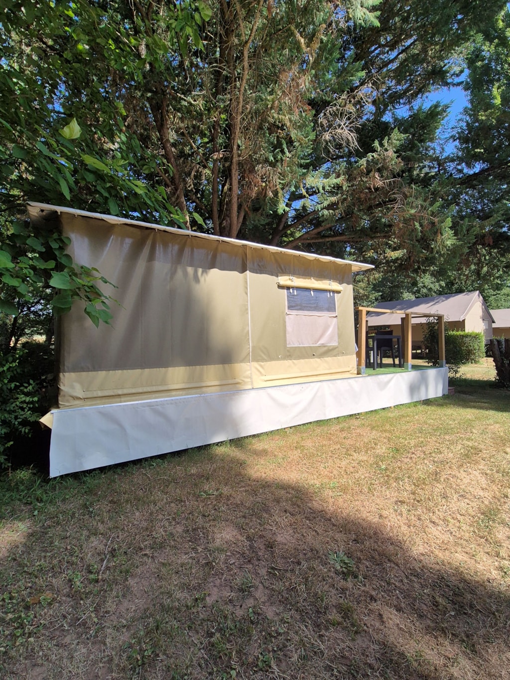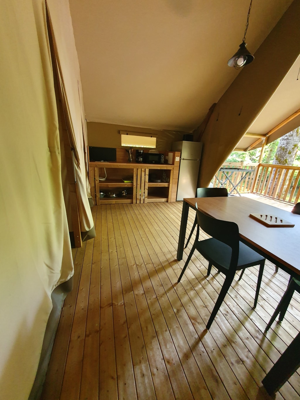 Unter dem Zelt befindet sich eine überdachte Terrasse mit Holztisch und Bänken für entspannte Pausen. Das Zelt hat zwar kein eigenes Bad, bietet aber Zugang zu den Gemeinschaftssanitäranlagen des Campingplatzes.
