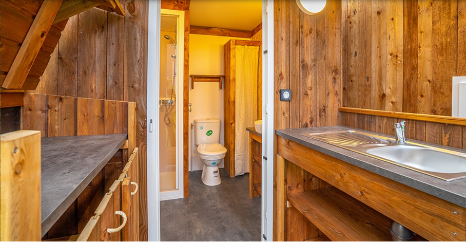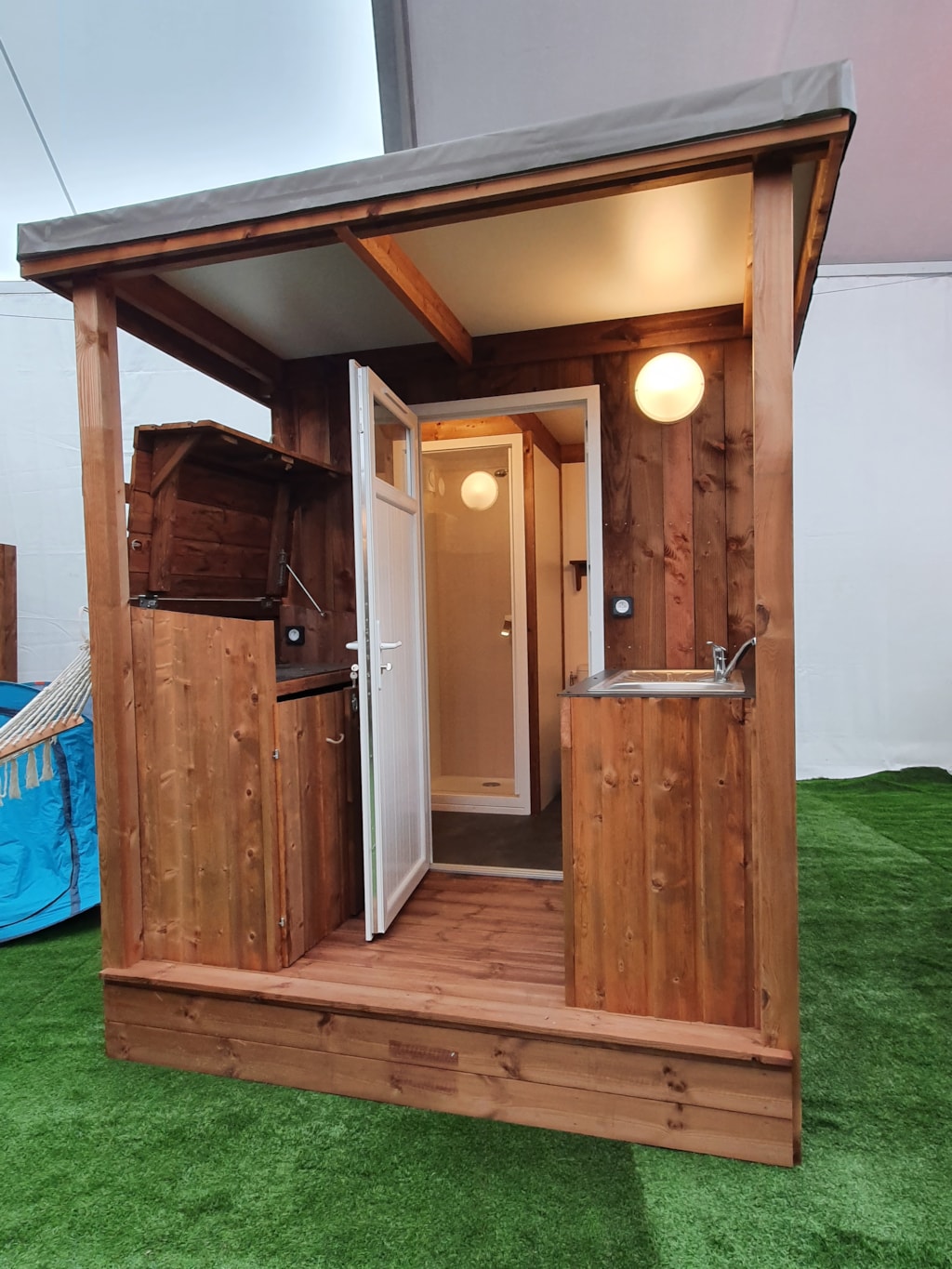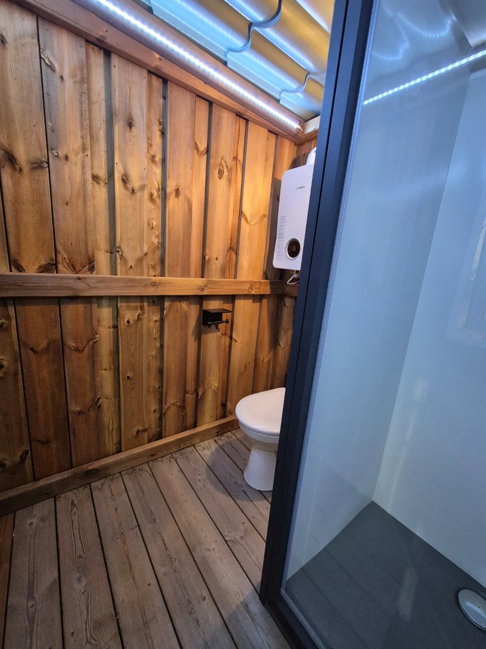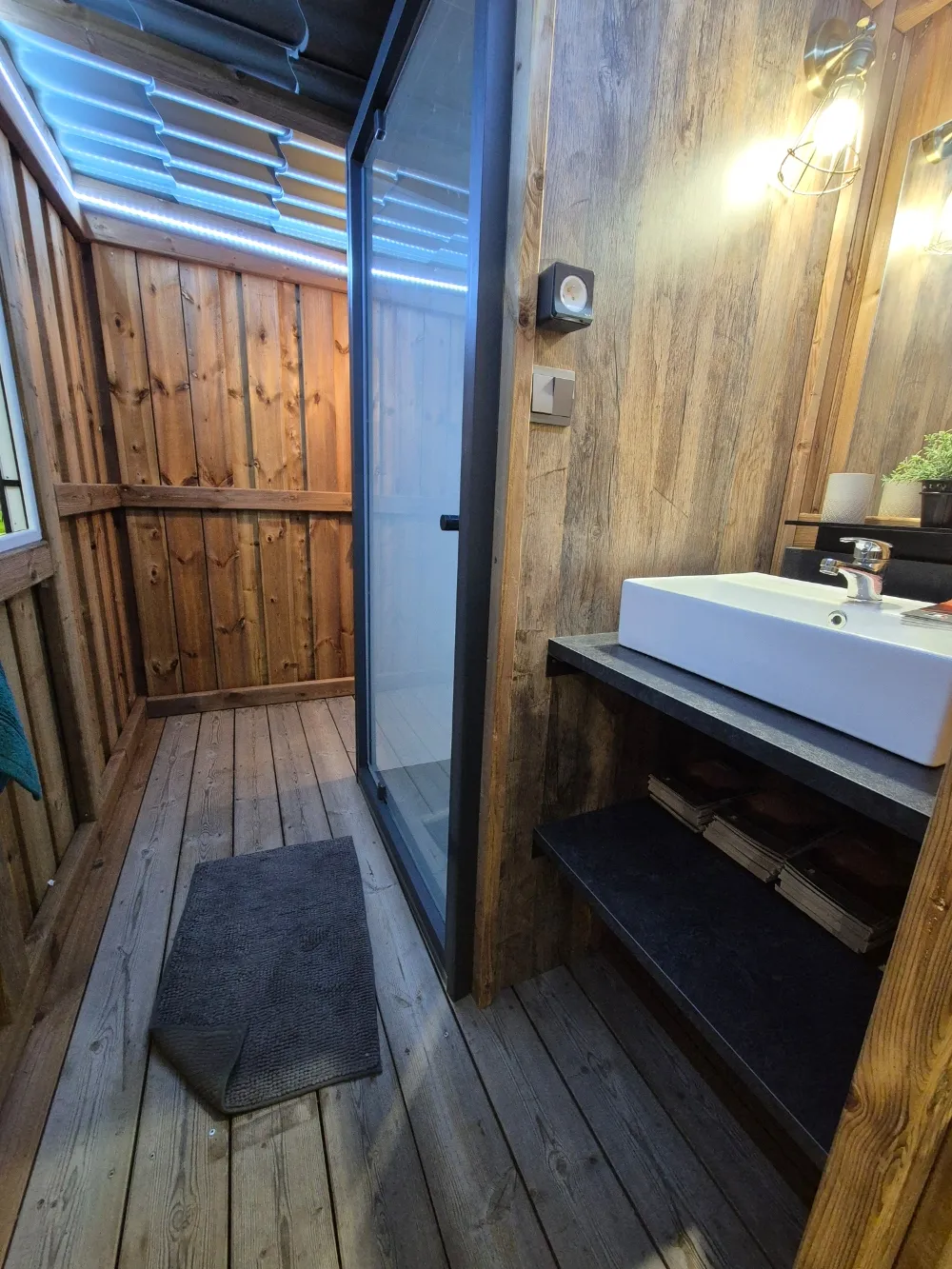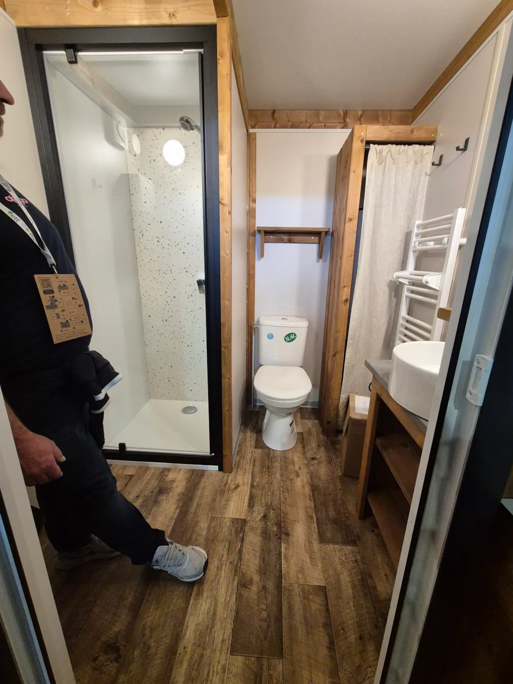 Entdecken Sie unsere Stellplätze mit eigenem, 4 m² großen Holzbad, ausgestattet mit Waschbecken, 80x80 cm großer Dusche, WC und Handtuchwärmer für optimalen Komfort.