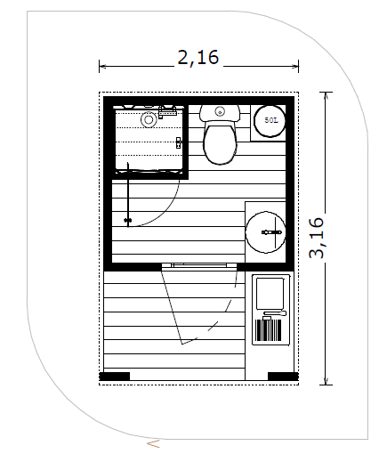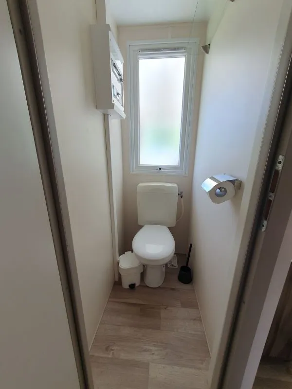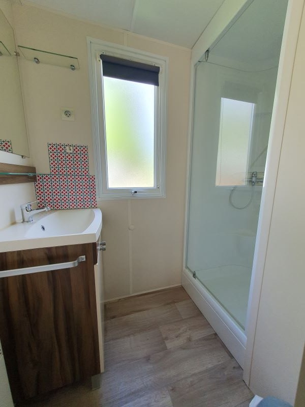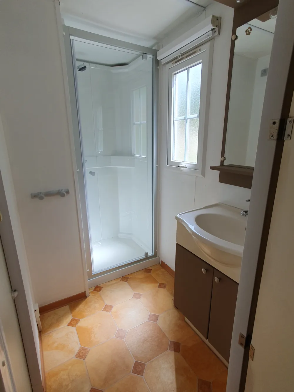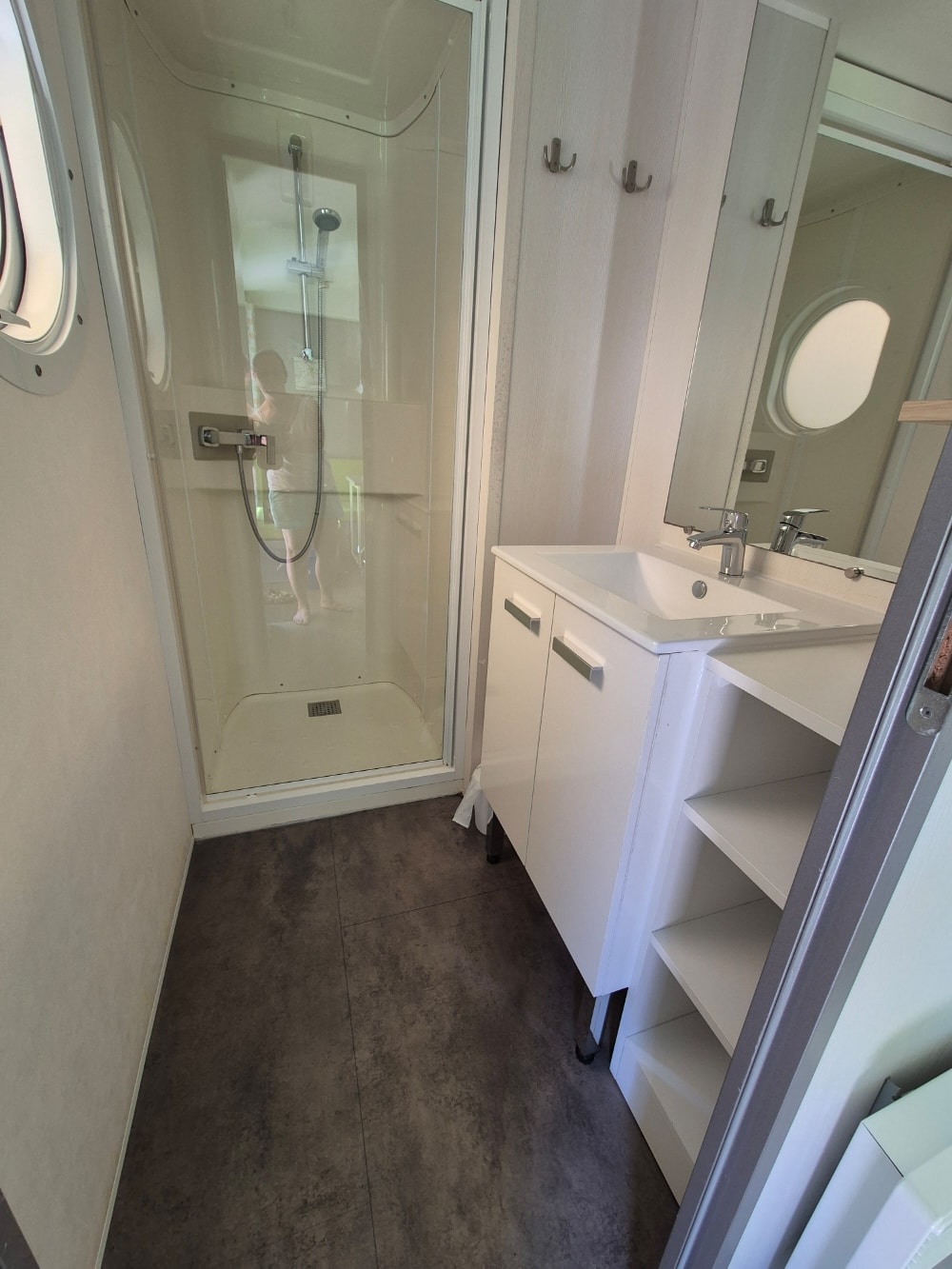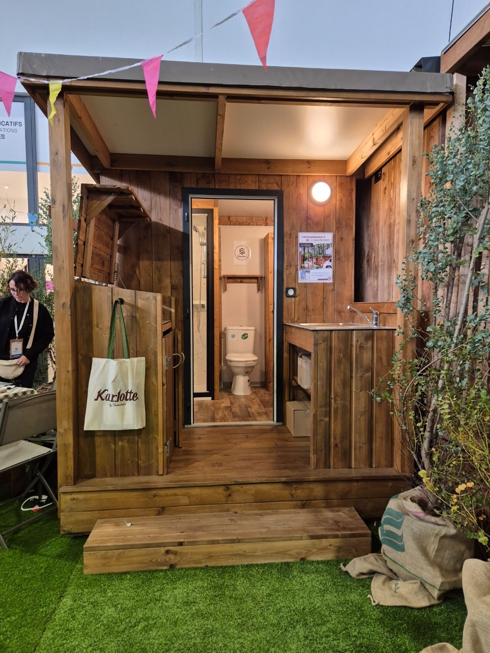 Entdecken Sie unsere Stellplätze mit eigenem, 4 m² großen Holzbad, ausgestattet mit Waschbecken, 80x80 cm großer Dusche, WC und Handtuchwärmer für optimalen Komfort.