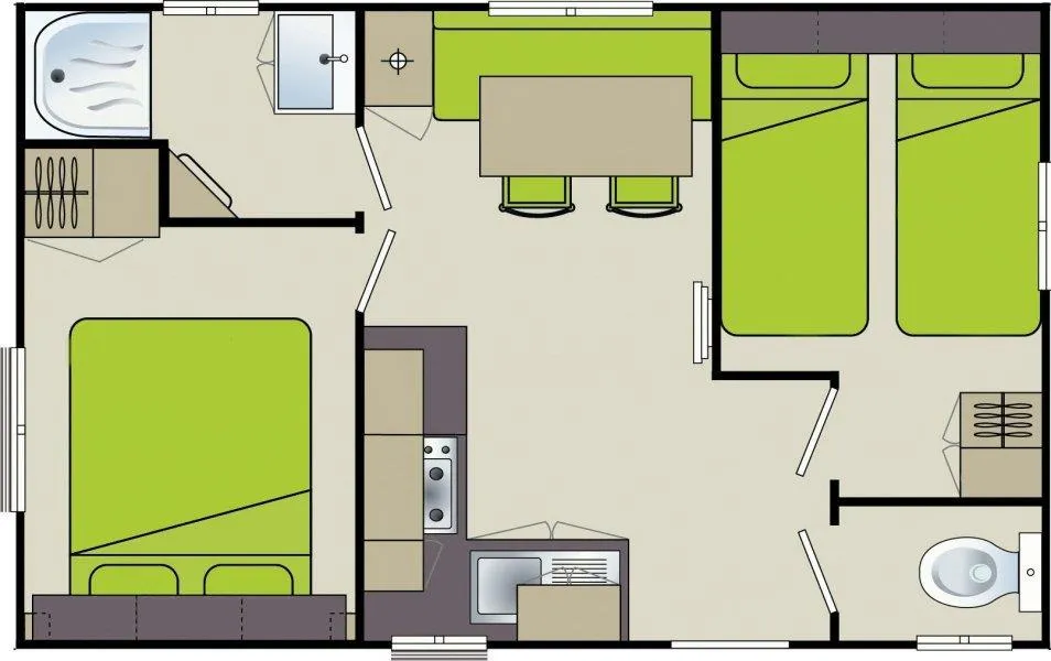 Das Mobilheim verfügt über : 1 Zimmer mit 1 Doppelbett 140X190cm. 1 Zimmer mit 2 Einzelbetten 80X190 cm. 1 Badezimmer mit Dusche, Waschbecken und separatem WC. 1 Küche mit Kühlschrank, Gasherd mit 4 Kochstellen, Mikrowelle, Kaffeemaschine. 1 Wohnzimmer mit einem Tisch, Stühlen und einer ausziehbaren Bank für 2 Personen (130x140 cm). 1 Terrasse mit Gartenmöbeln, Liegestühlen / Chiliennes. Infos: Bettdecken oder Steppdecken, Kopfkissen werden gestellt. Bettwäsche, Handtücher und Pflegeprodukte werden nicht bereitgestellt. Sonnenschirm zur Verfügung, wenn die Terrasse nicht überdacht ist. Nicht vertragliche Fotos