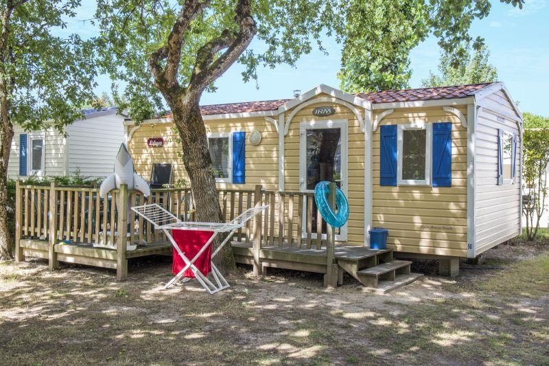 Our Mobile Home has : 1 Bedroom with 1 double bed 140X190cm. 1 Bedroom with 2 single beds 80X190cm. 1 Bathroom with shower, washbasin, WC. 1 Kitchen equipped with a fridge, 4 burner gas cooker, microwave, electric coffee maker. 1 Living room with table, chairs and convertible sofa for 2 people 120X190cm. 1 Wooden terrace with garden furniture, parasol, deckchairs. Infos : Blankets or duvets and pillows are provided. Bed linen, towels and cleaning products are not included.