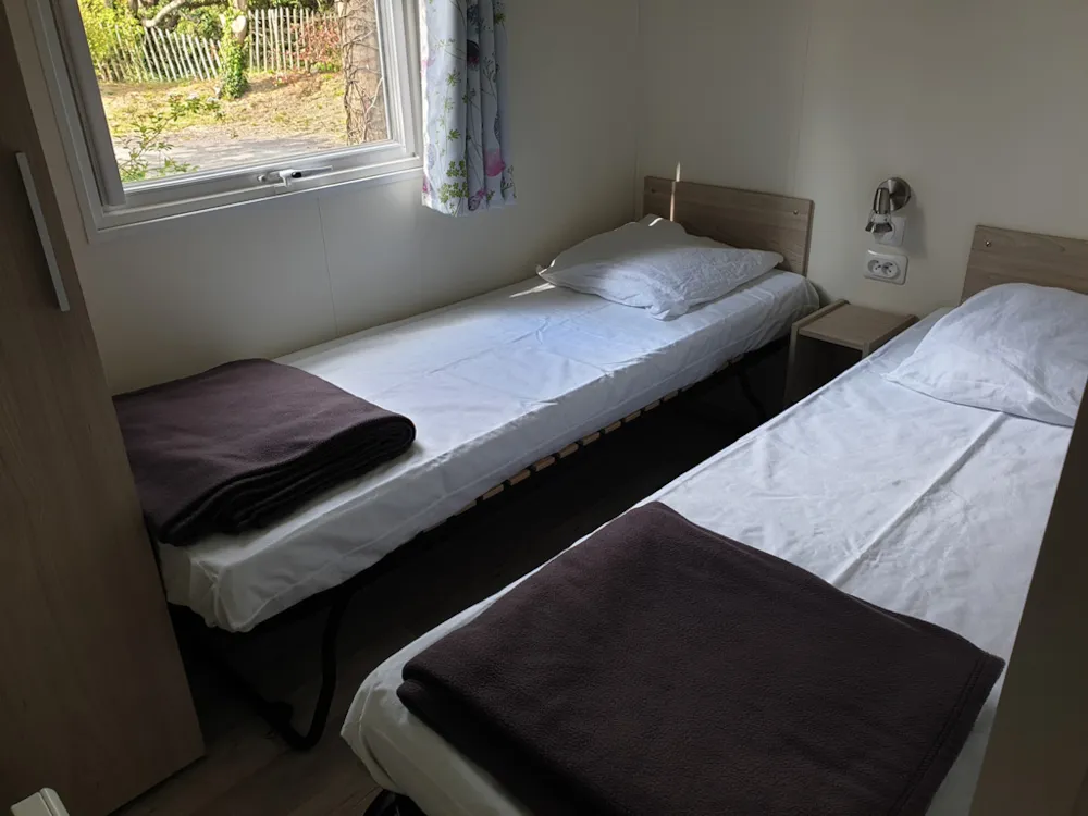 Our Mobile Home has : 1 Bedroom with 1 double bed 140X190cm. 1 Bedroom with 2 single beds 80X190 cm. A bathroom with shower, washbasin and WC. 1 Kitchen equipped with a fridge, 4 burner gas cooker, microwave, electric coffee maker, living room. The living room has a table with chairs and a bench. a wooden terrace with garden furniture and deckchairs. More info : Blankets or duvets and pillows are provided. However, bed linen, towels and cleaning products are not included.