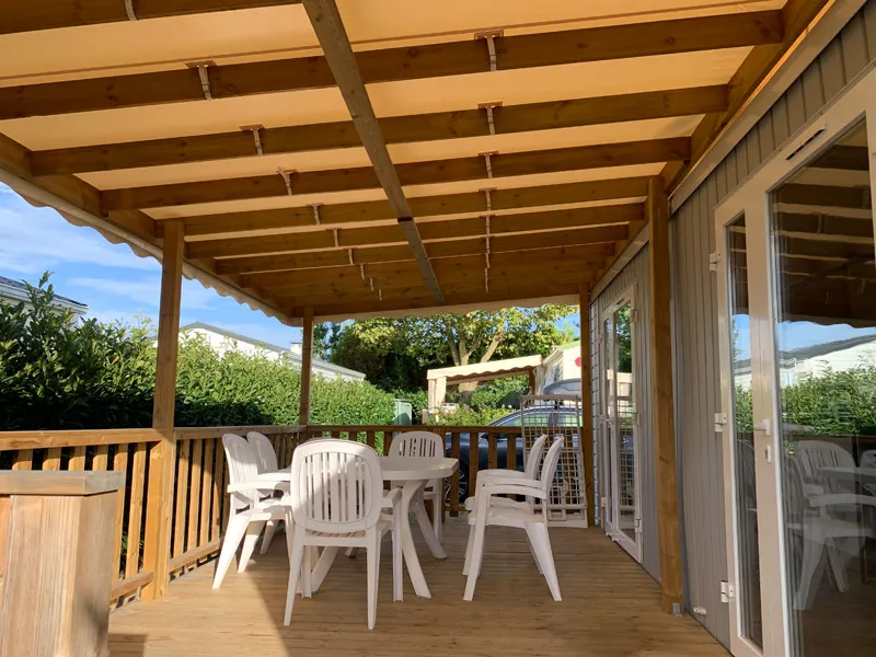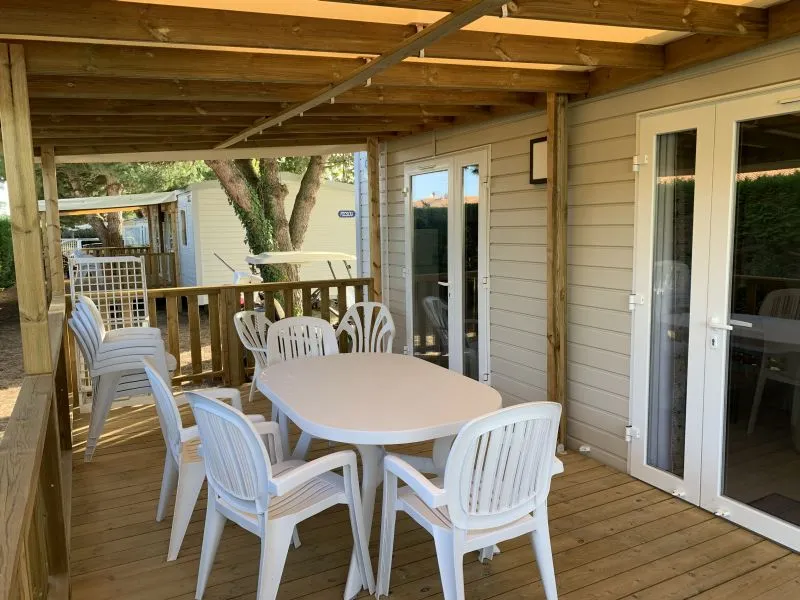 Our "Méditerranée" Mobile Home has : 1 Bedroom with 1 double bed 160X200cm, a TV, a shower and a washbasin. 1 Bedroom with 2 single beds 80X190cm. 1 Bathroom equipped with a shower, washbasin, WC. 1 independent Wc. 1 Kitchen equipped with a fridge, hob, microwave, dishwasher, Nespresso coffee machine. 1 Living room with table, chairs, bench and 1 TV. 1 Wooden terrace covered with a sail, garden furniture, deckchairs. 1 Plancha or BBQ. Infos : Blankets or duvets and pillows are provided. You also have the sheets provided for the stay, the change of sheets will be charged. Bathroom linen and cleaning products are not included.