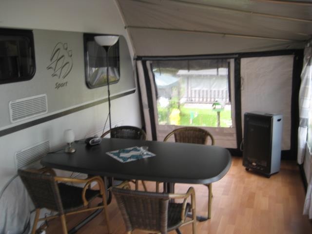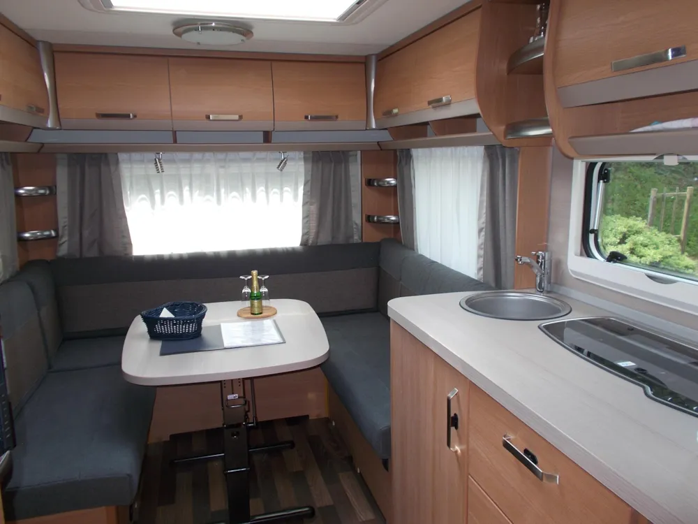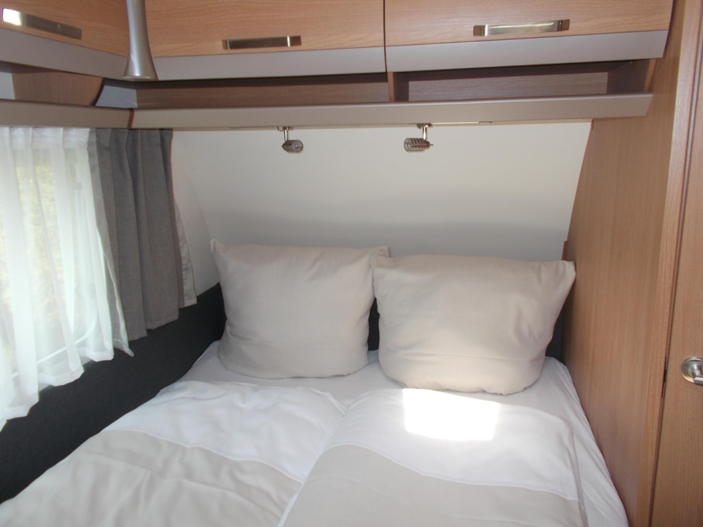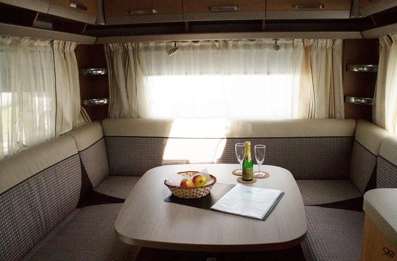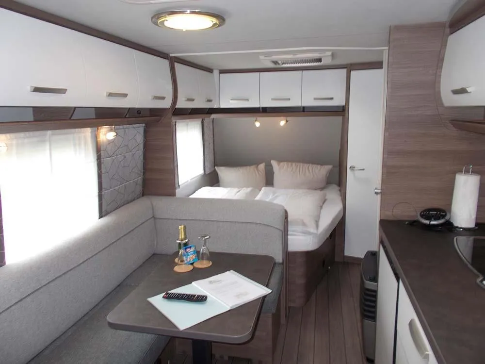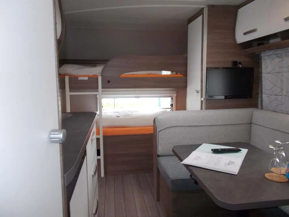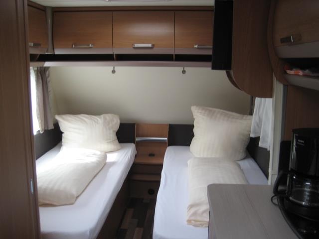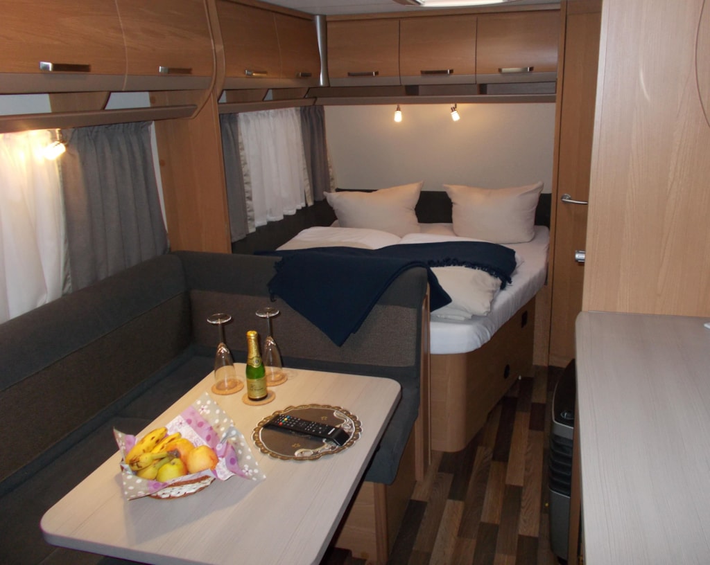 Unser neuwertiger Wohnwagen verfügt über eine Wohnfläche von 20qm inkl. Vorzelt, 1 Doppelbett (198 x 155), 2 Doppelstockbetten für Kinder (max. 60kg) (223 x 72 , 223 x 76) und eine Rundsitzecke (kein Umbau möglich).