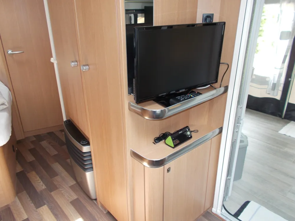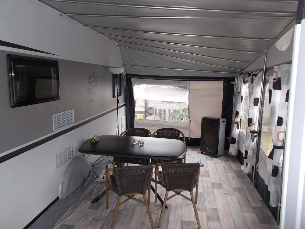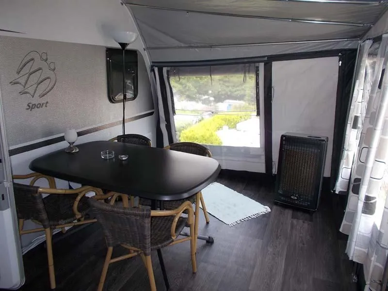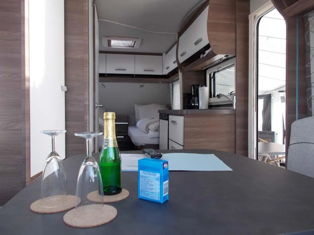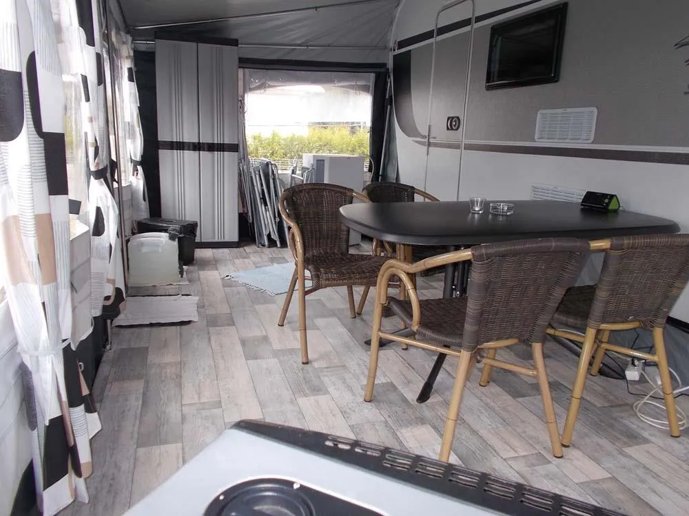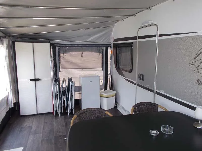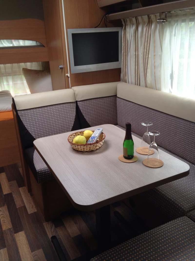 Unser neuwertiger Wohnwagen verfügt über eine Wohnfläche von 20qm inkl. Vorzelt, 1 Doppelbett (198 x 155), 2 Doppelstockbetten für Kinder (max. 60kg) (223 x 72 , 223 x 76) und eine Rundsitzecke (kein Umbau möglich).