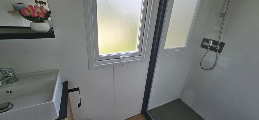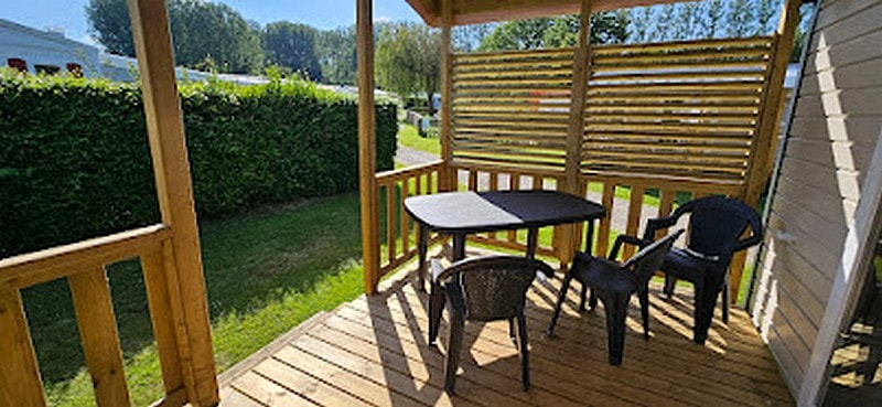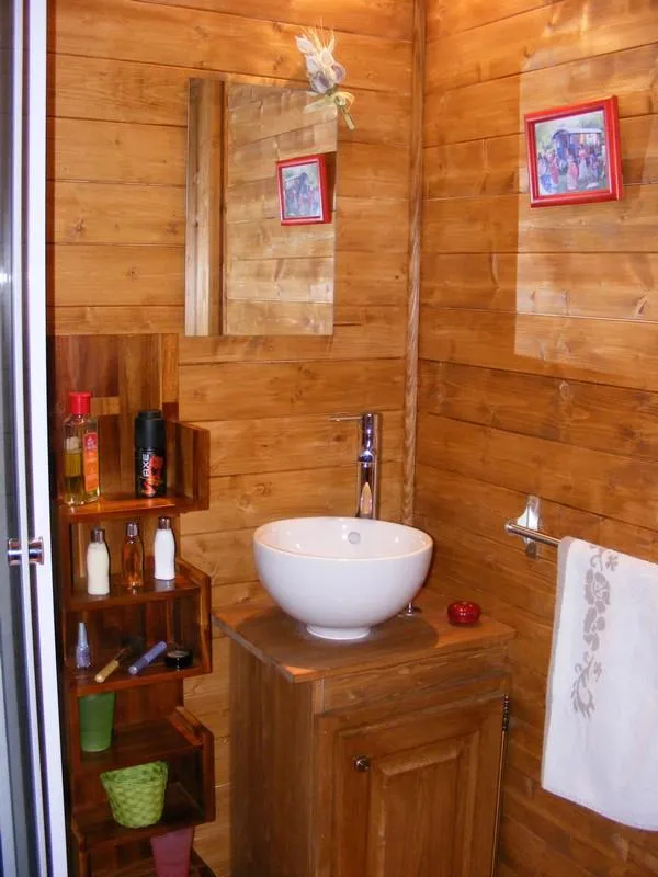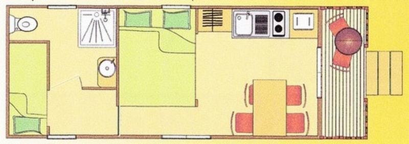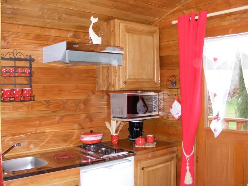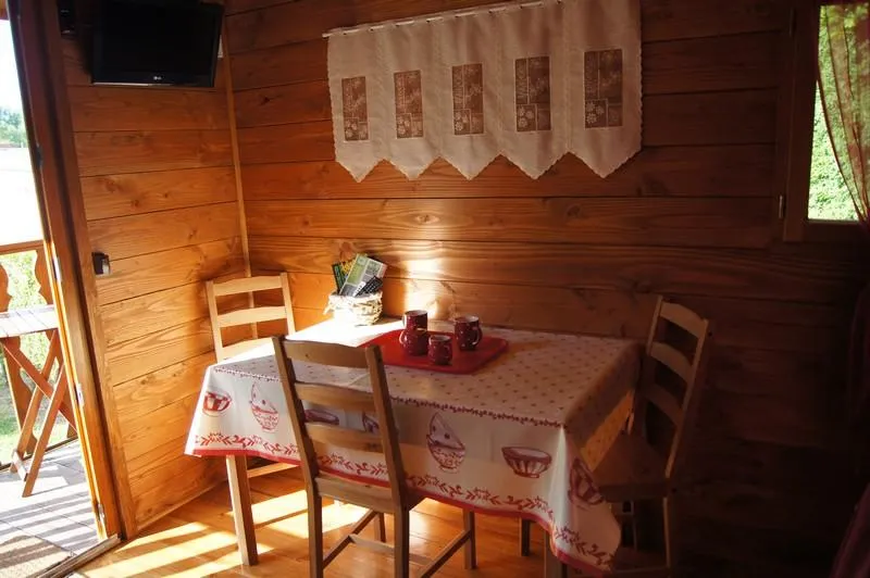 Ambiance chaleureuse du bois massif, aménagement et décoration soignés. Equipée confortablement pour 4 personnes. Kitchenette comprenant : évier, réfrigérateur, 2 plaques cuisson, hotte, four micro-ondes, vaisselle, cafetière électrique, grille pain…Placards. Grand lit en alcôve (1.40 x 2.00 m), 2 lits superposés (0.90 x 1.90 m). Penderie. Salle d’eau avec lavabo, douche, wc. Chauffage électrique. TV. Table pique-nique, parasol, barbecue. Horaires d’arrivée et de départ : Séjour SEMAINE du samedi à partir de 15h00 au samedi suivant au plus tard 10h00 Séjour WEEK-END 2 nuitées et COURT SEJOUR 2, 3,4 ou 5 nuitées (hors juillet et août) : arrivée à partir de 18h00 - départ au plus tard 17h00 Séjour petite semaine (hors juillet et août) : arrivée le lundi 10h00 départ le vendredi 17h00