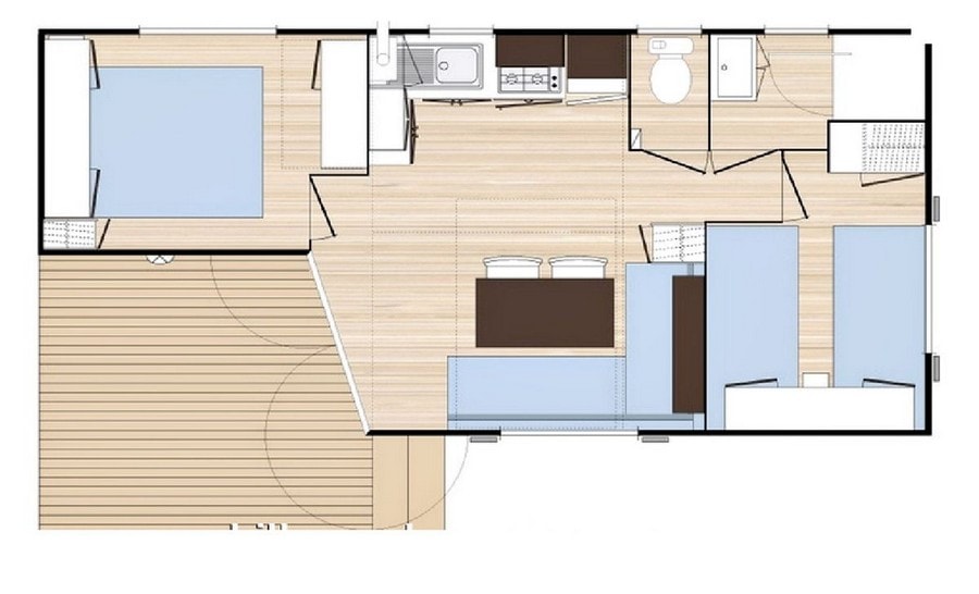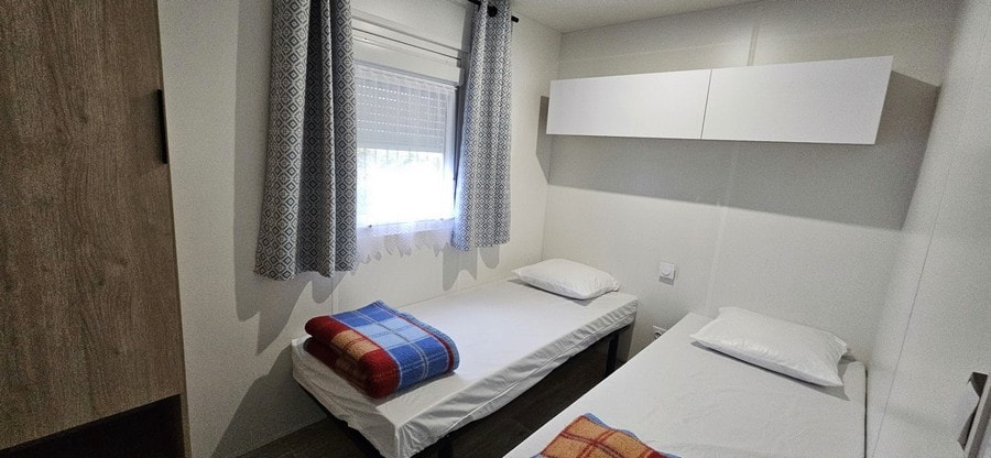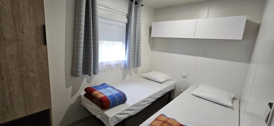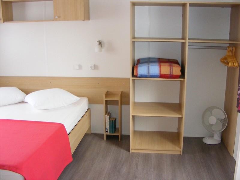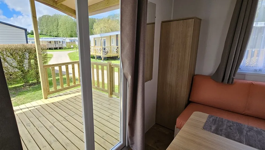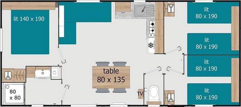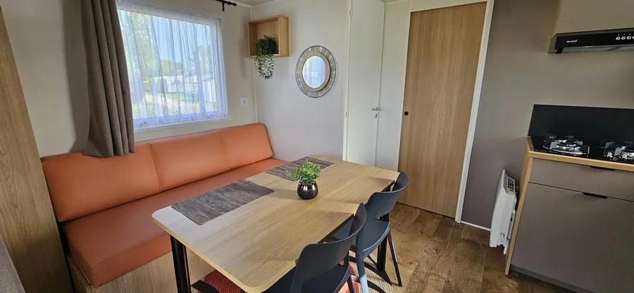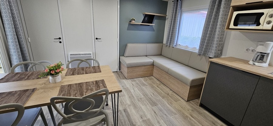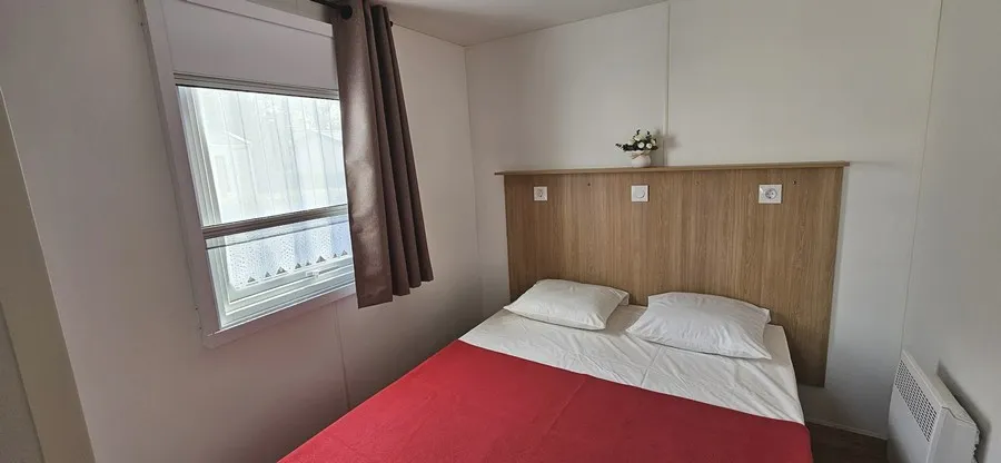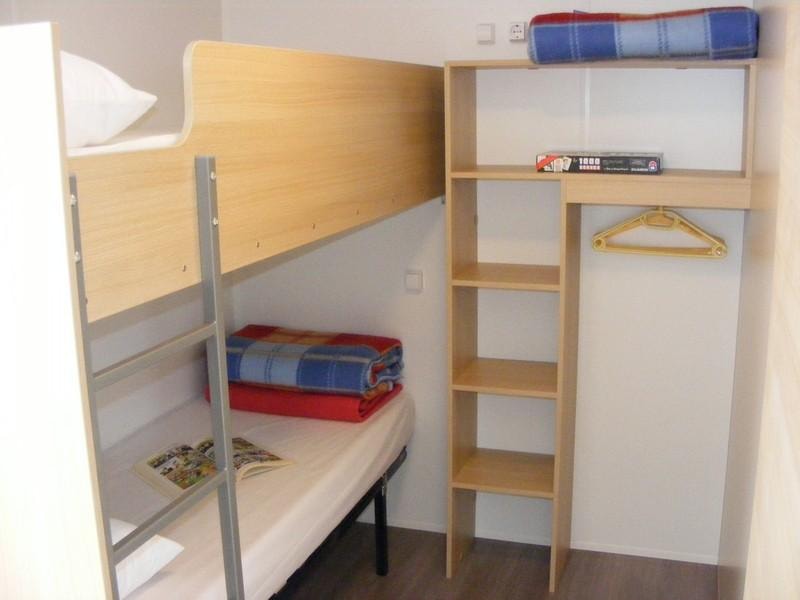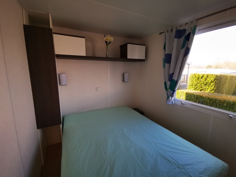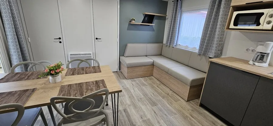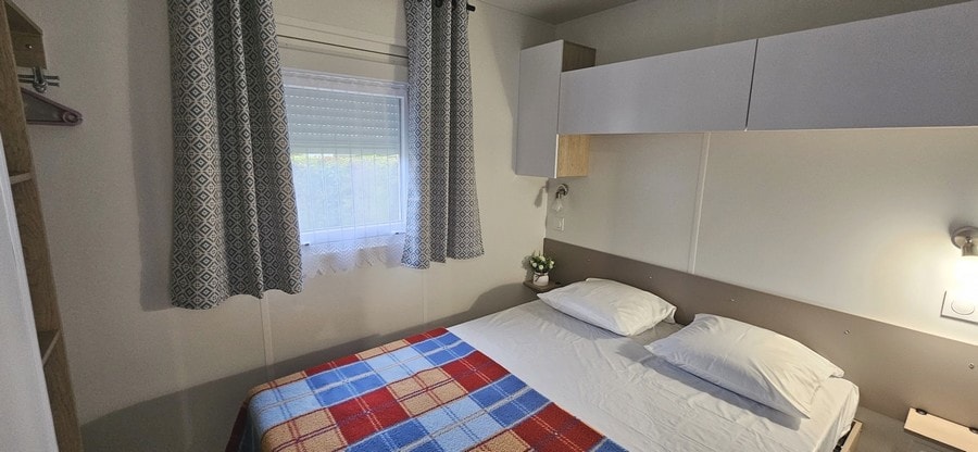 2 chambres : l’une avec 1 lit 2 pers (140cm), l’autre avec 2 lits 1 pers superposés (80 cm pour le lit en hauteur et 70 cm pour le lit bas). Etagères, penderies. Séjour avec banquette convertible 2 pers. Couvertures + oreillers. Salle d’eau avec lavabo, douche (avec rideau) et Wc. Cuisine avec évier, plaques de cuisson, hotte, réfrigérateur/congélateur, four micro-ondes, cafetière électrique, grille pain, vaisselle pour 6 personnes. Sèche cheveux. Télévision. Portes intérieures coulissantes. Terrasse adaptée au PMR, salon de jardin, parasol, barbecue.