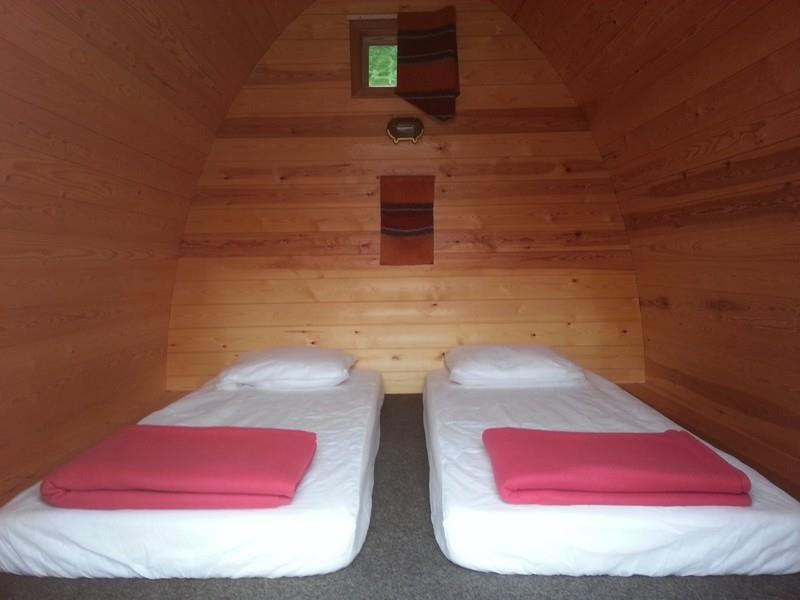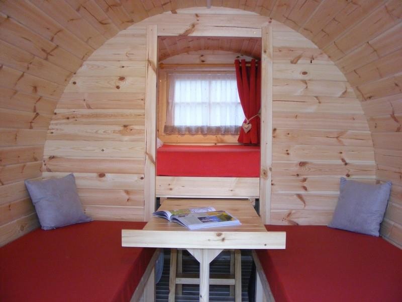 Tout en douceur, tout en rondeur, pour se ressourcer dans une bulle… Le Tonneau Nature Lodge permet le campement jusqu’à 4 personnes. Il comprend un espace nuit avec un lit double 140 x 190 cm, deux banquettes transformables en couchage, table rétractable, réfrigérateur table top, four micro ondes, petit kit vaisselle pour 4 personnes, couvertures, oreillers. Chauffage électrique, éclairage/prises électriques. Table pique-nique couverte, barbecue à charbon de bois. Les sanitaires du Camping (lavabos, douches, wc, laverie) se situent à environ 80 m, douche avec monnayeur temporisé : 1 € / 5 mn