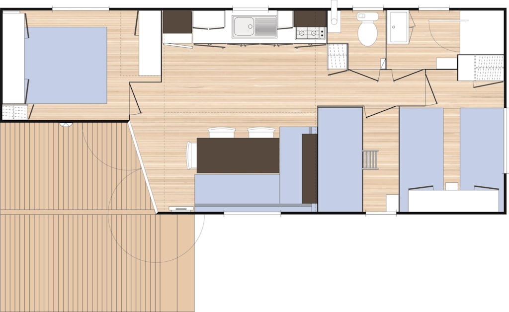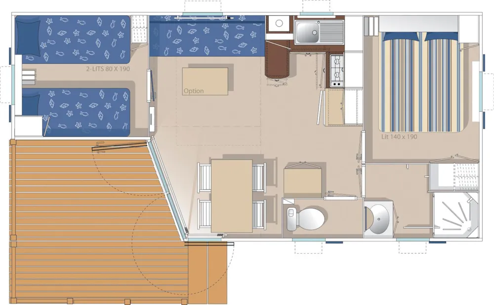 • 1 ausgestatteter Innenraum mit 2 Einzelbetten (80x200, können zusammengefügt werden) Für maximal 2 Personen jeden Alters (1 Kind = 1 Person). Nicht empfohlen für kleine Kinder