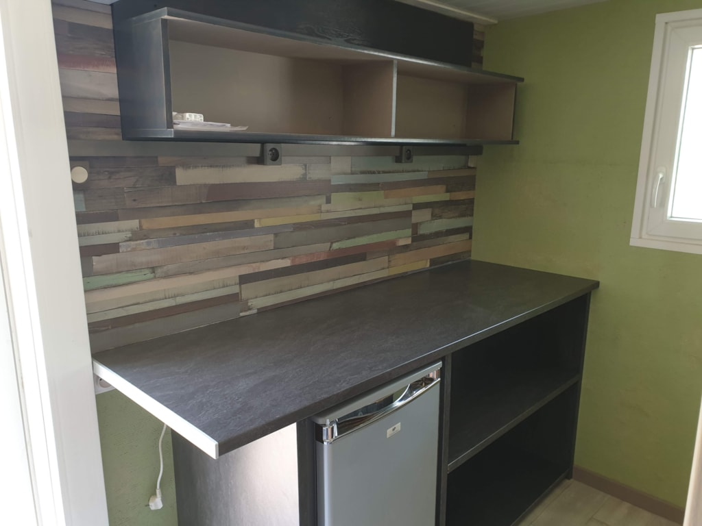 - Coin cuisine équipé (frigo table top, plaque gaz, vaisselle, micro-ondes…).