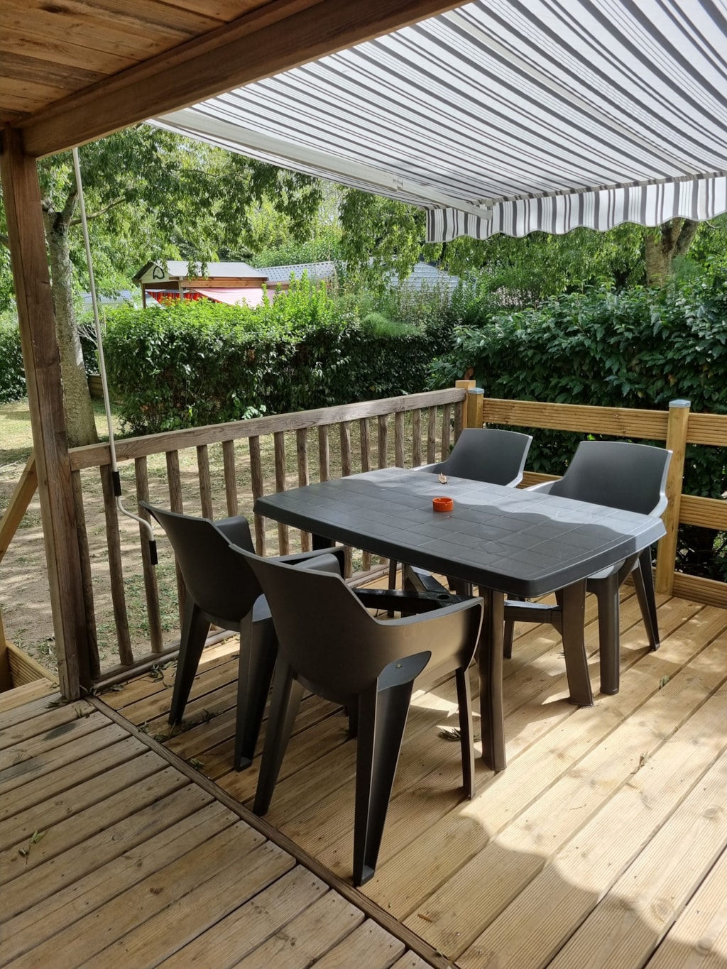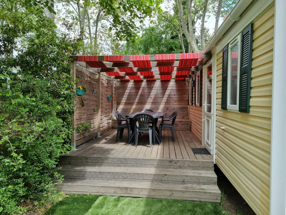 ● Grande Terrasse en bois semi-couverte avec salon de jardin (table + chaises)