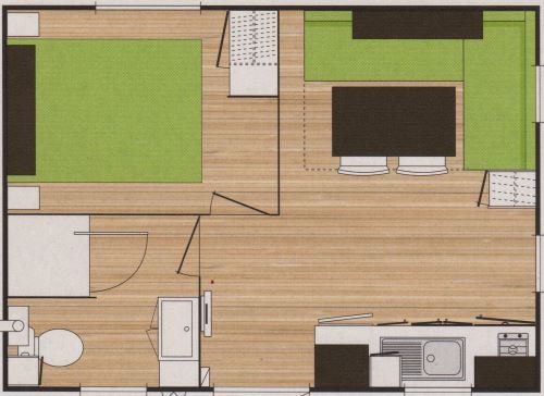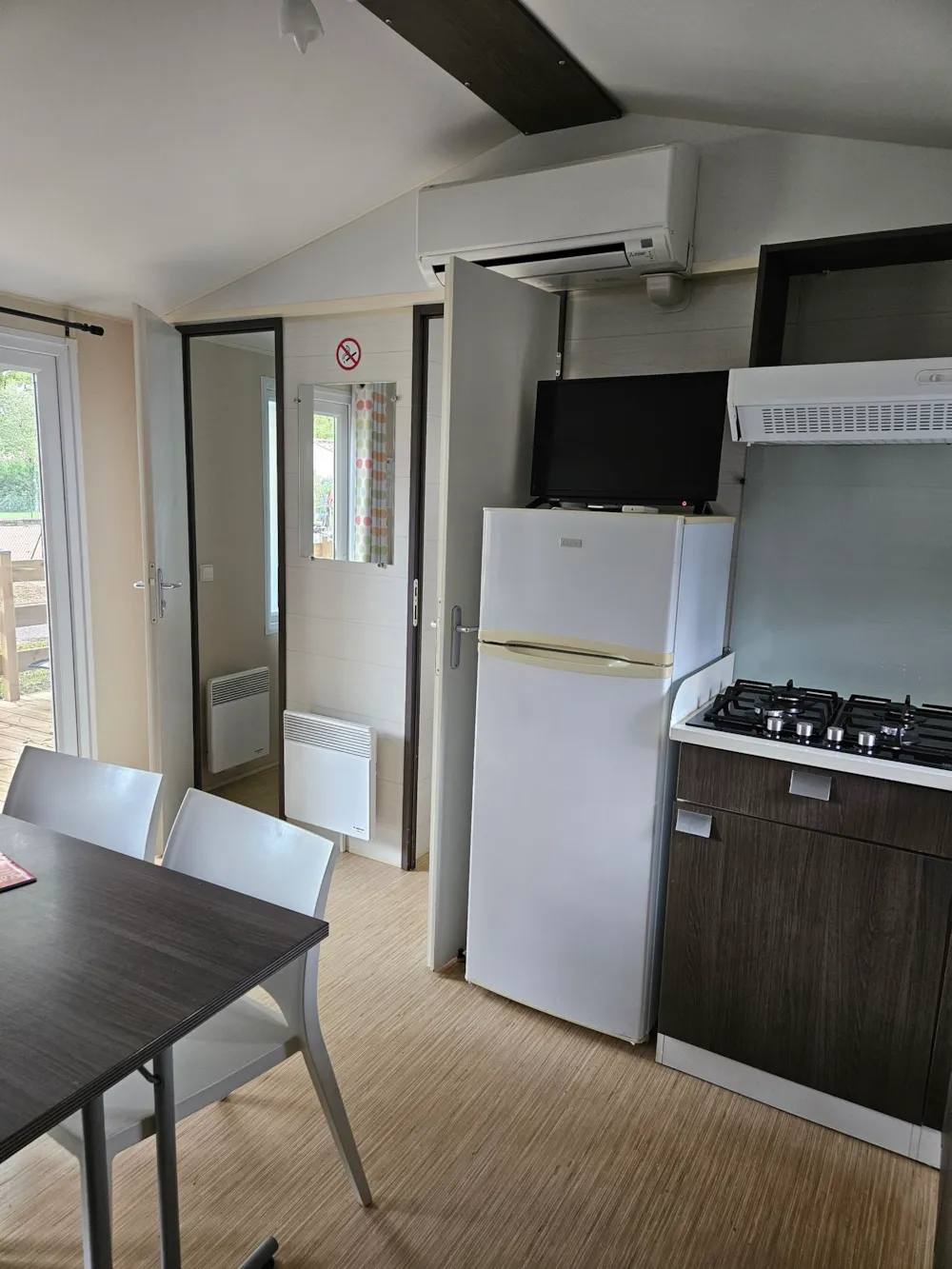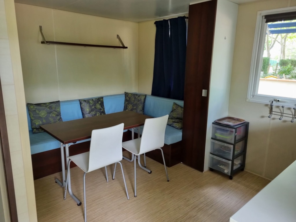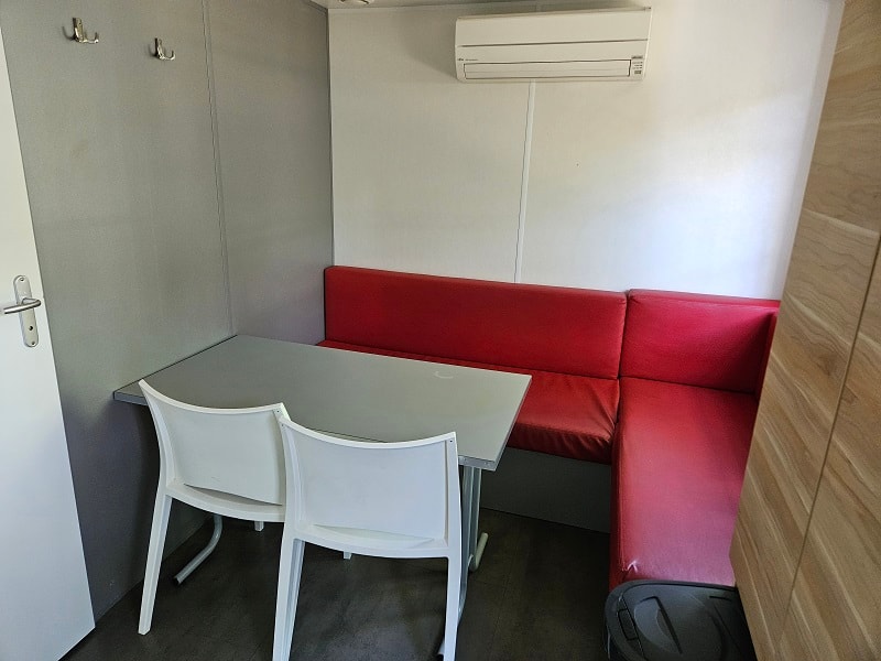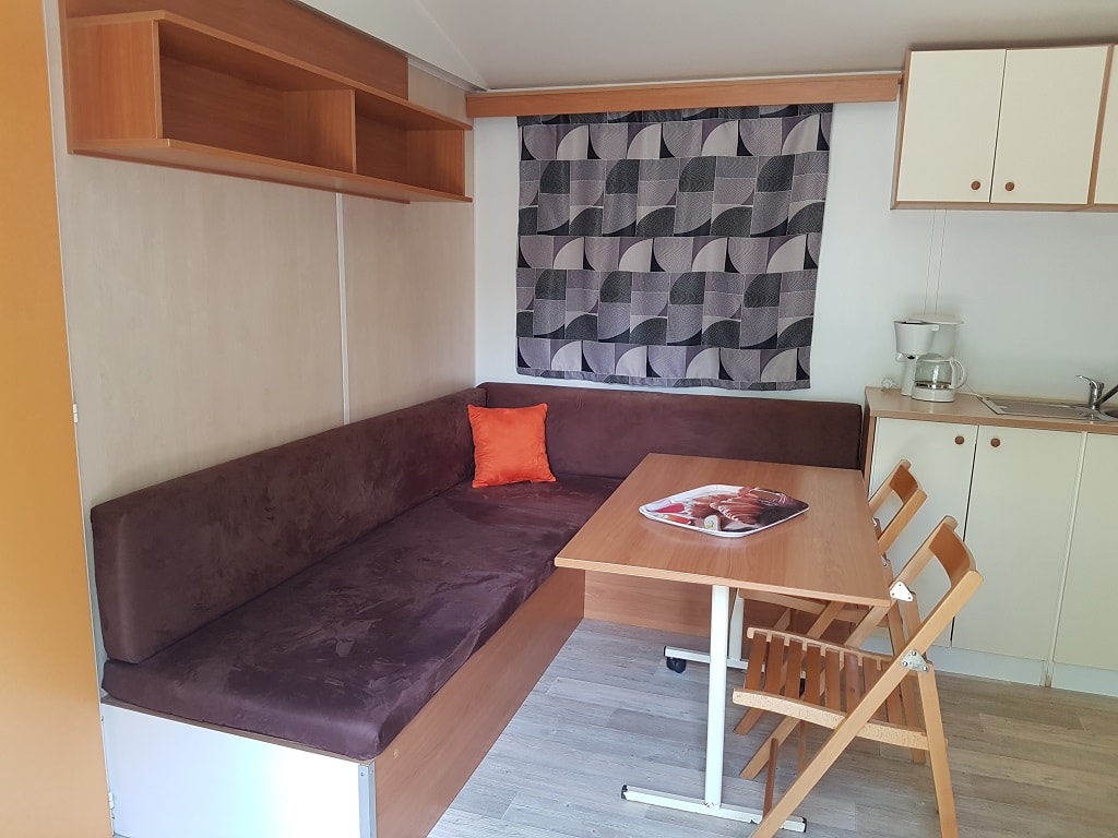 ● Dans la pièce à vivre banquette avec cinqième couchage, table grande dimension, télévision inclus