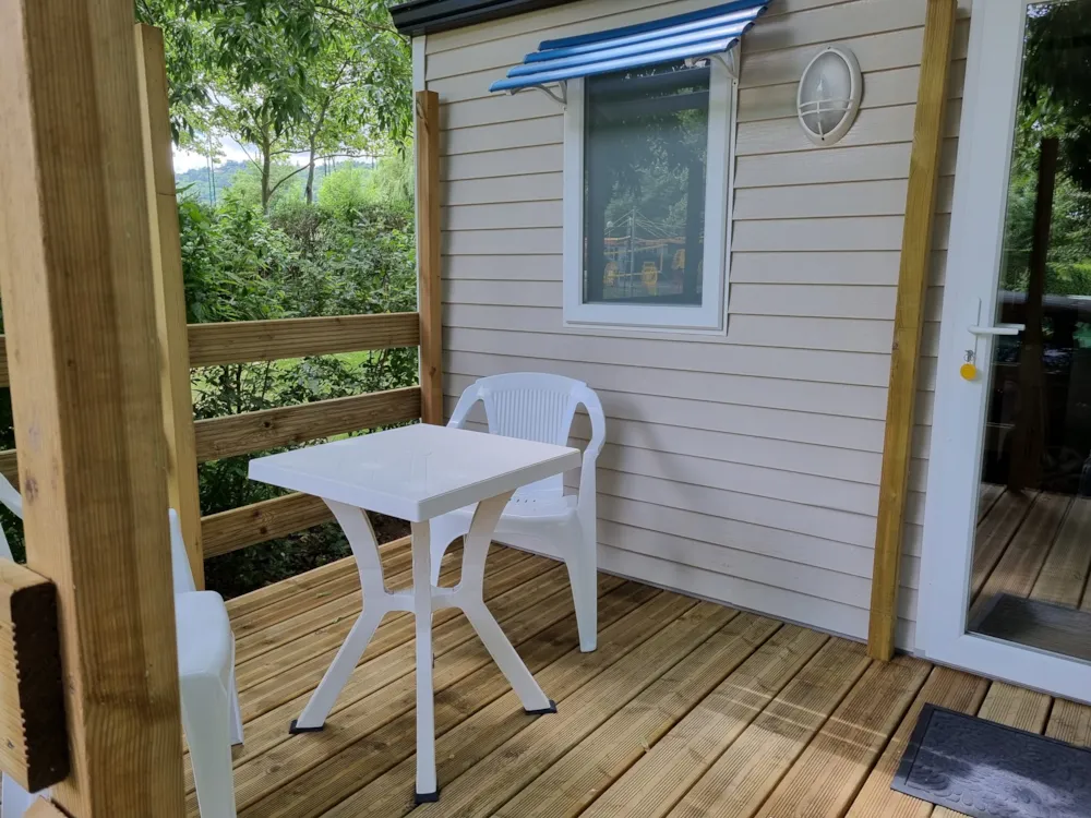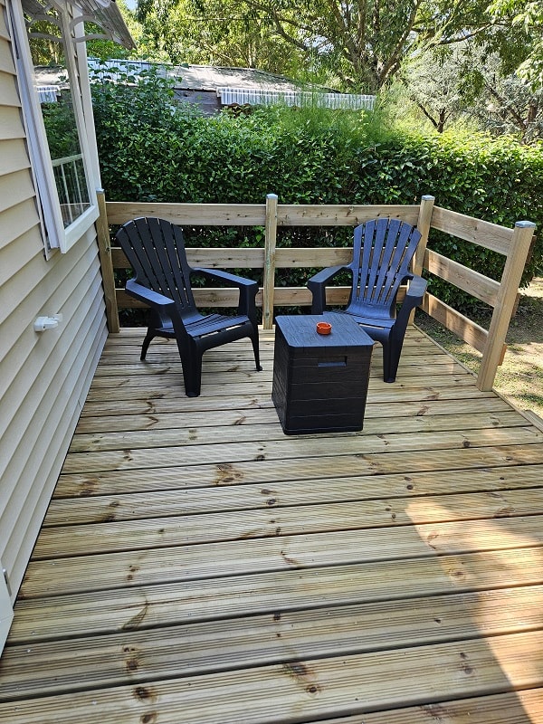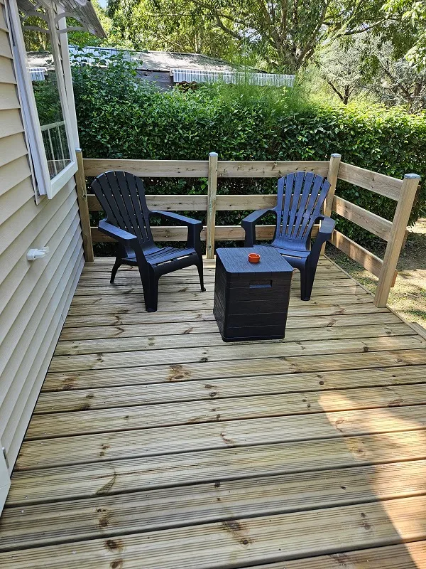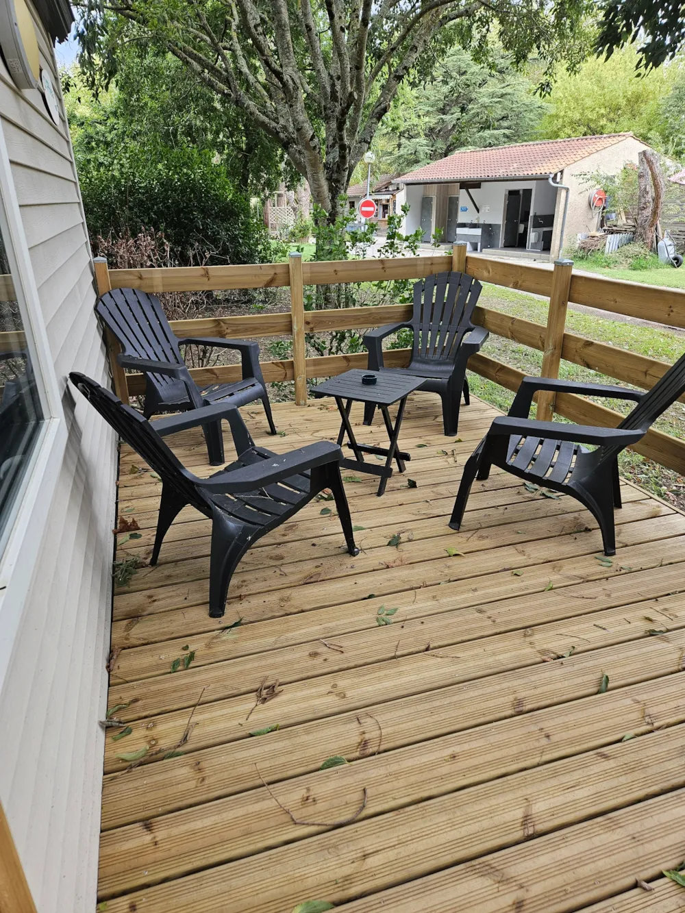 - Terrasse en bois non couverte avec salon de jardin (table + chaises).