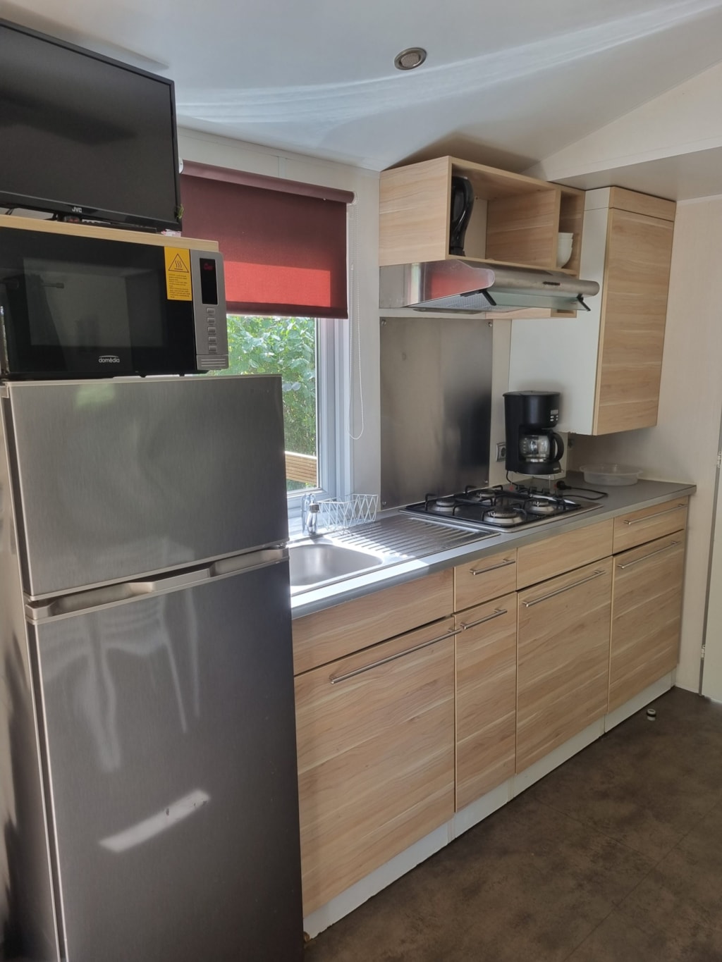 - Coin cuisine (frigo/congélateur, plaque gaz + hotte, vaisselle, micro-ondes…).