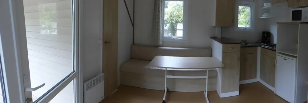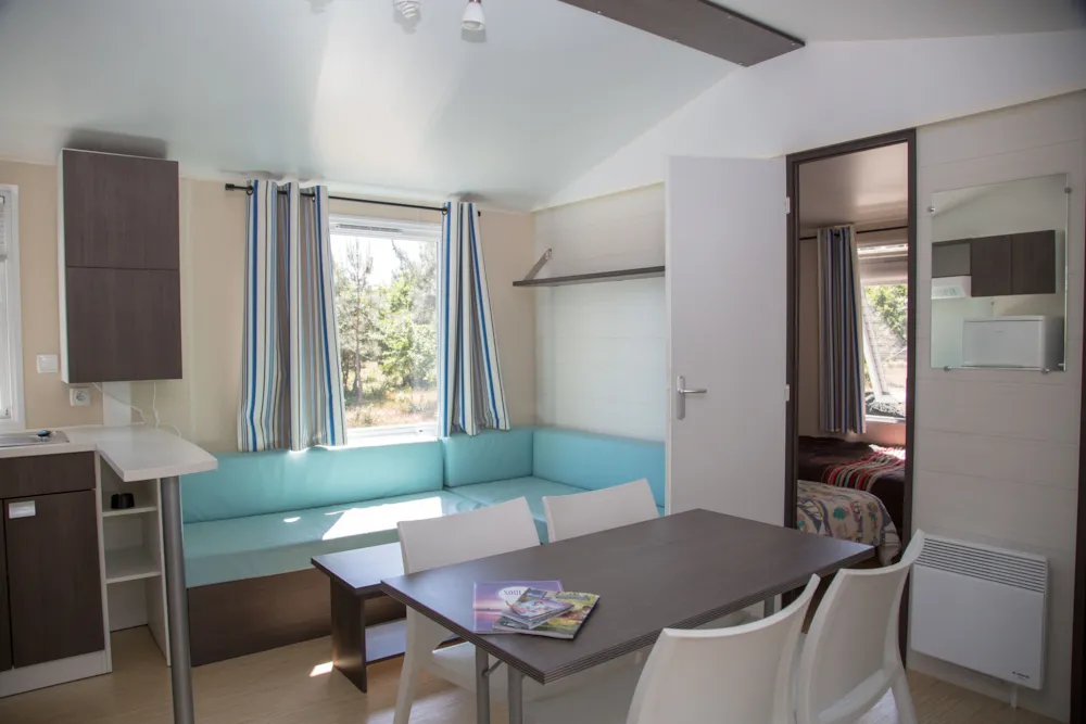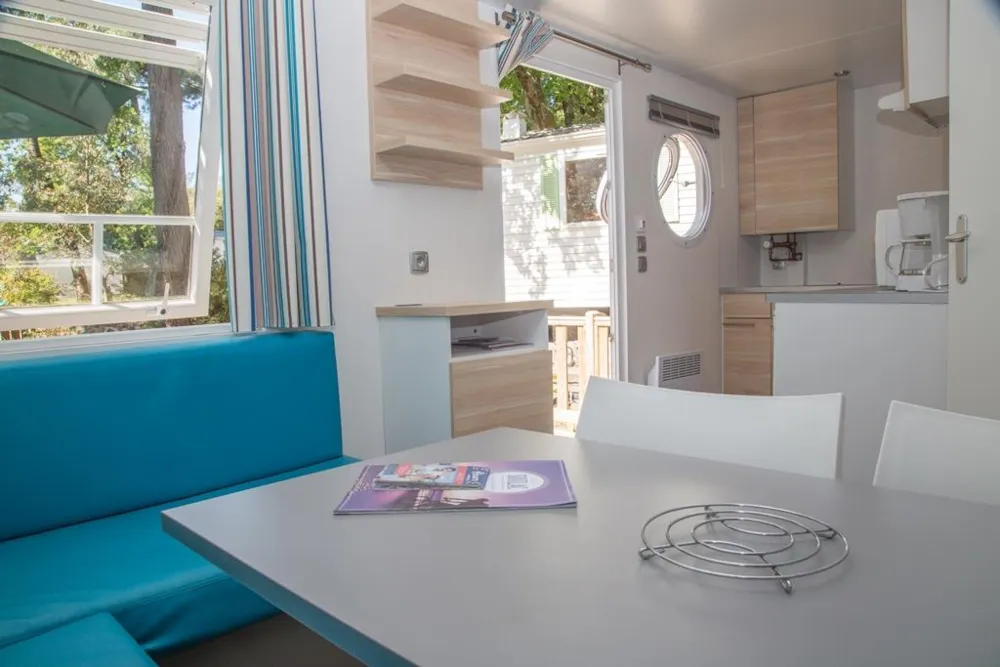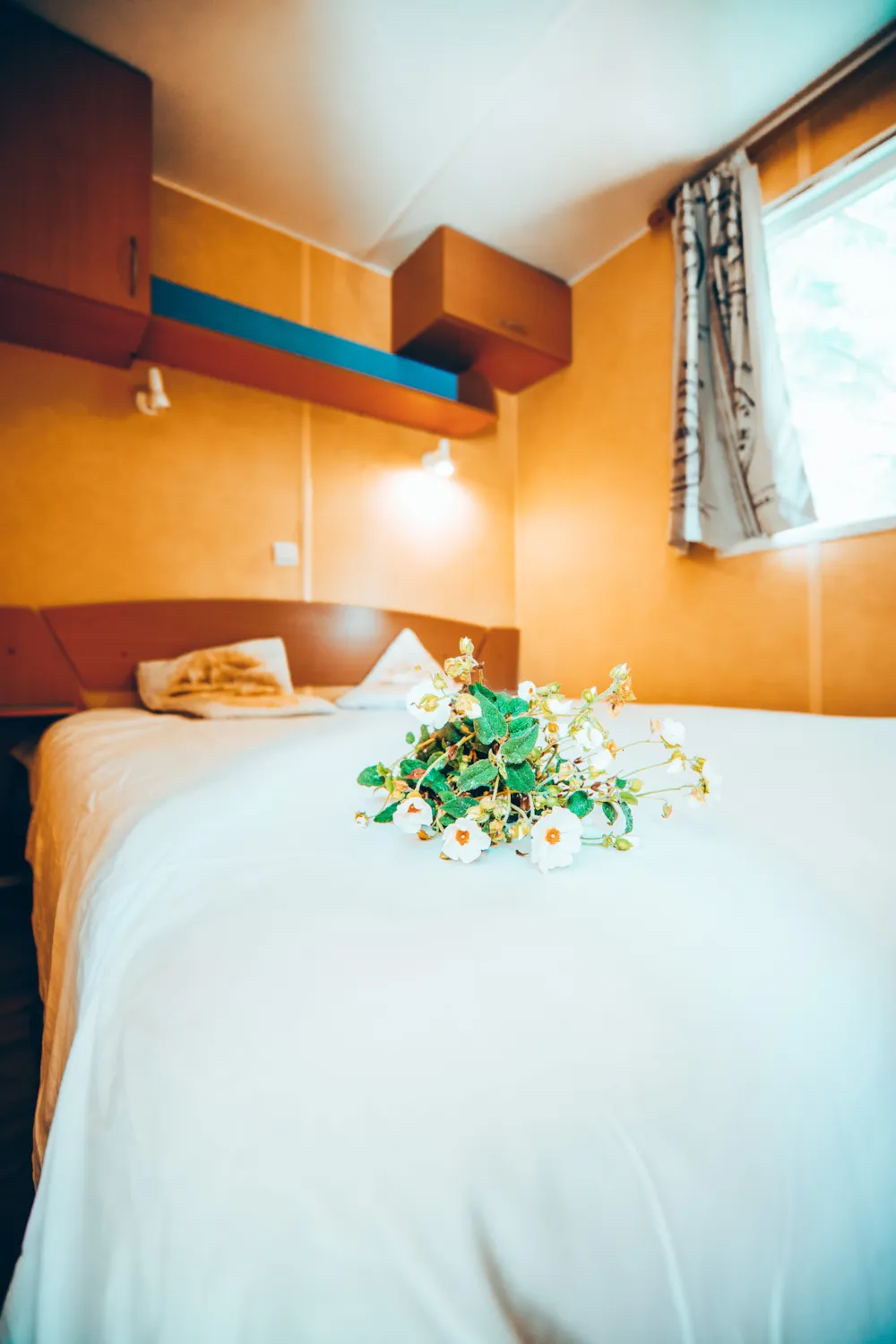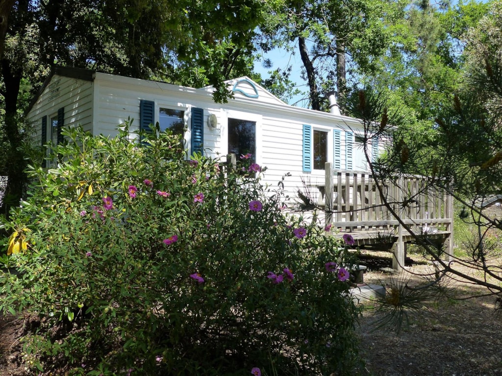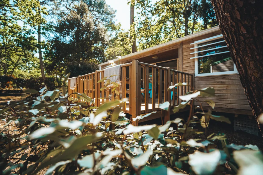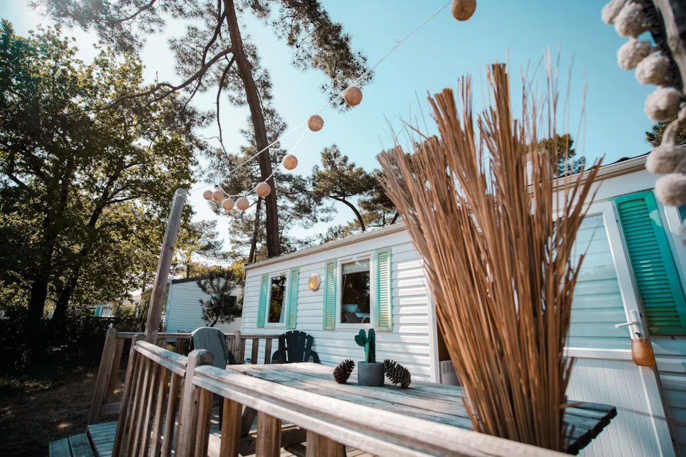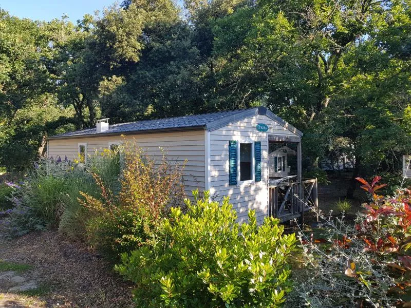 Der Campingplatz ist Fußgängerzone, der Parkplatz befindet sich draußen. Dieses komfortable und traditionelle Mobilheim mit überdachter Terrasse wird von der ganzen Familie geschätzt.