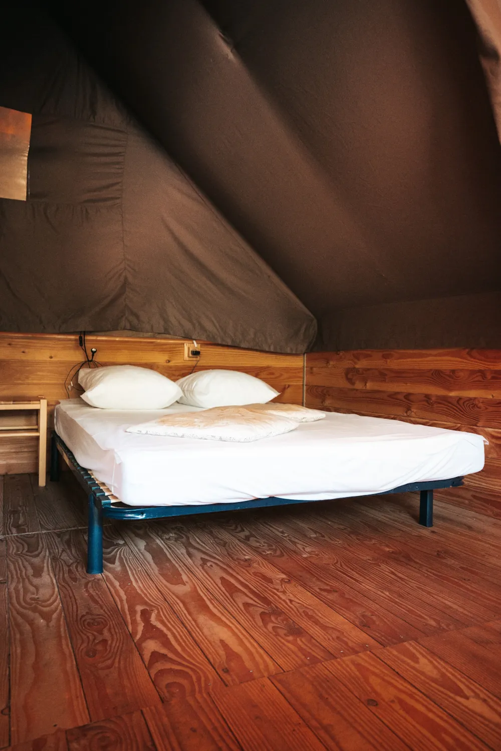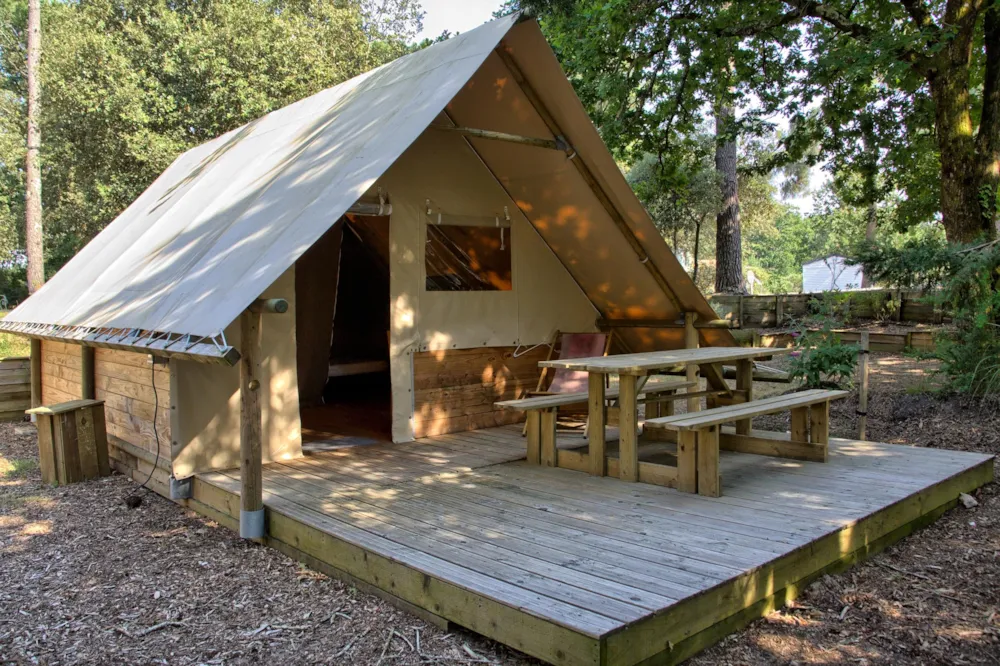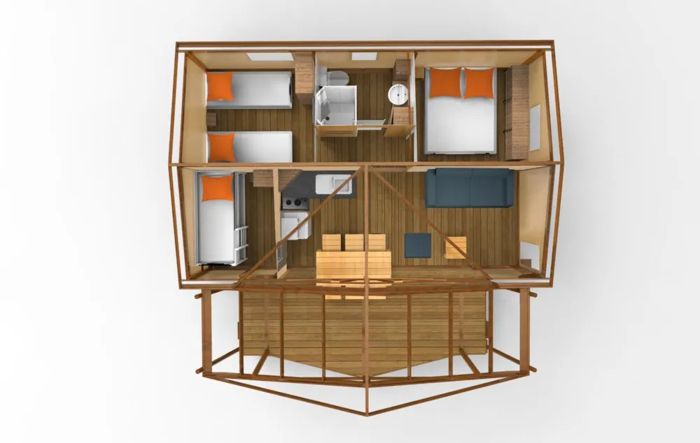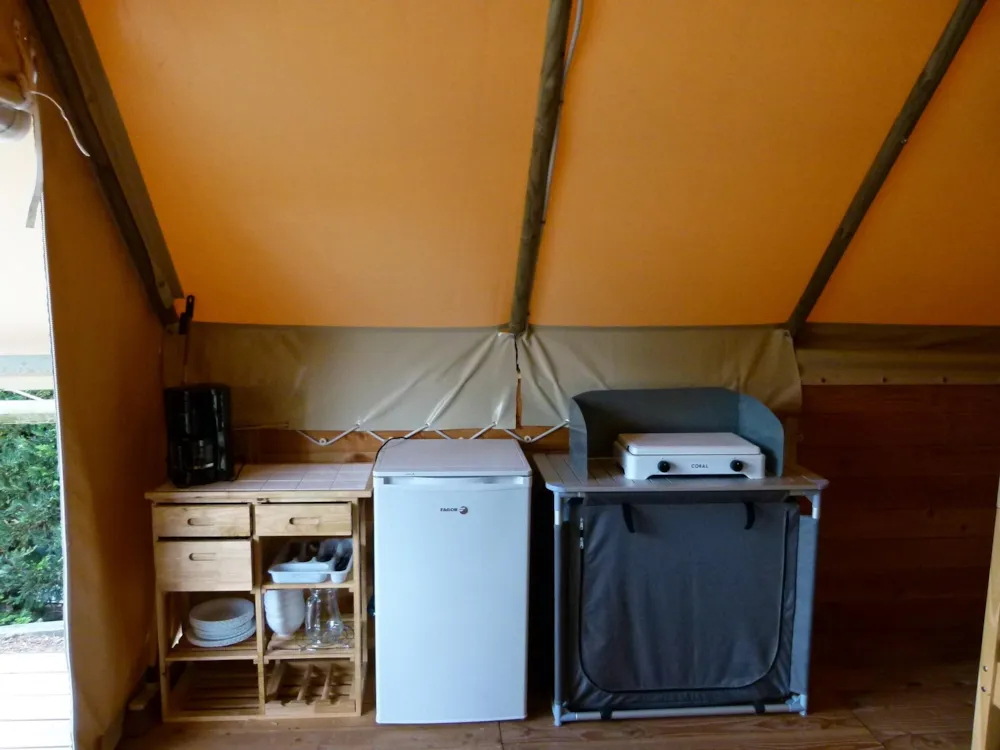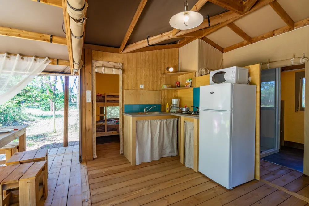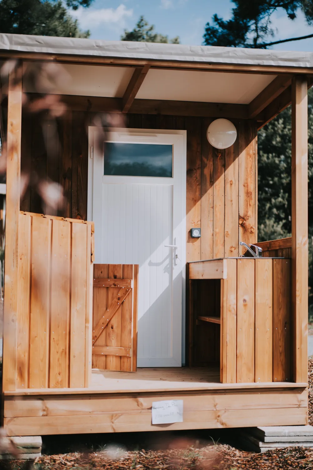 Das AMAZONE caban bietet eine ausgestattete Küche und 2 Doppelzimmer, eines davon mit Etagenbett. Ein Wassertank ist verfügbar. Für die Dusche und Toiletten benutzen Sie die Sanitäranlagen des Campingplatzes. Terrasse 8 m².