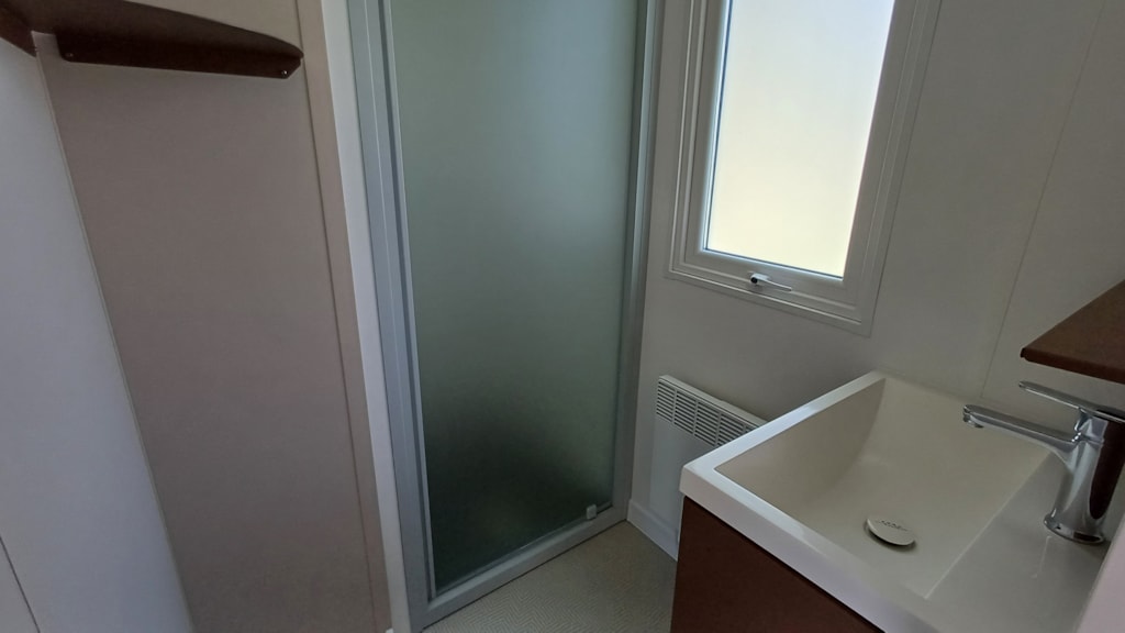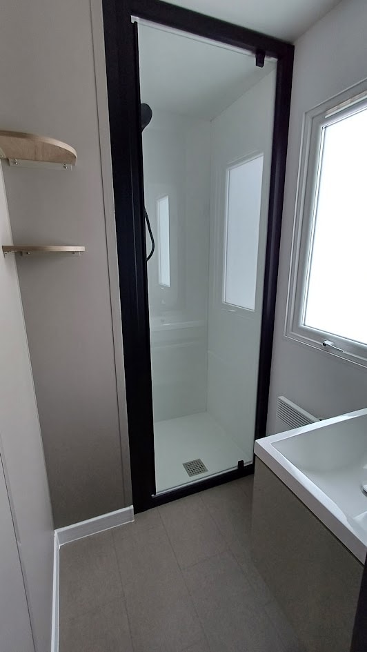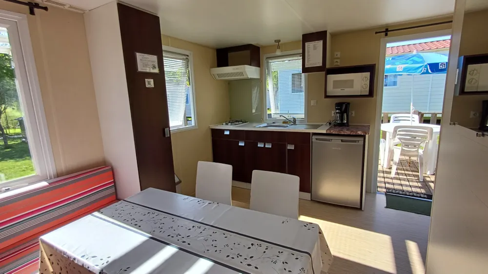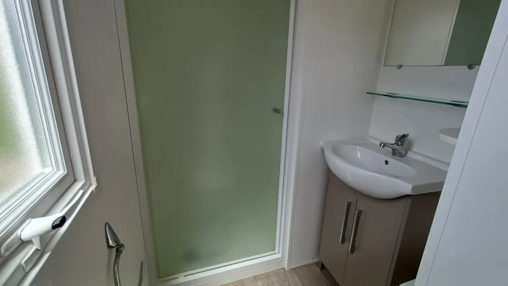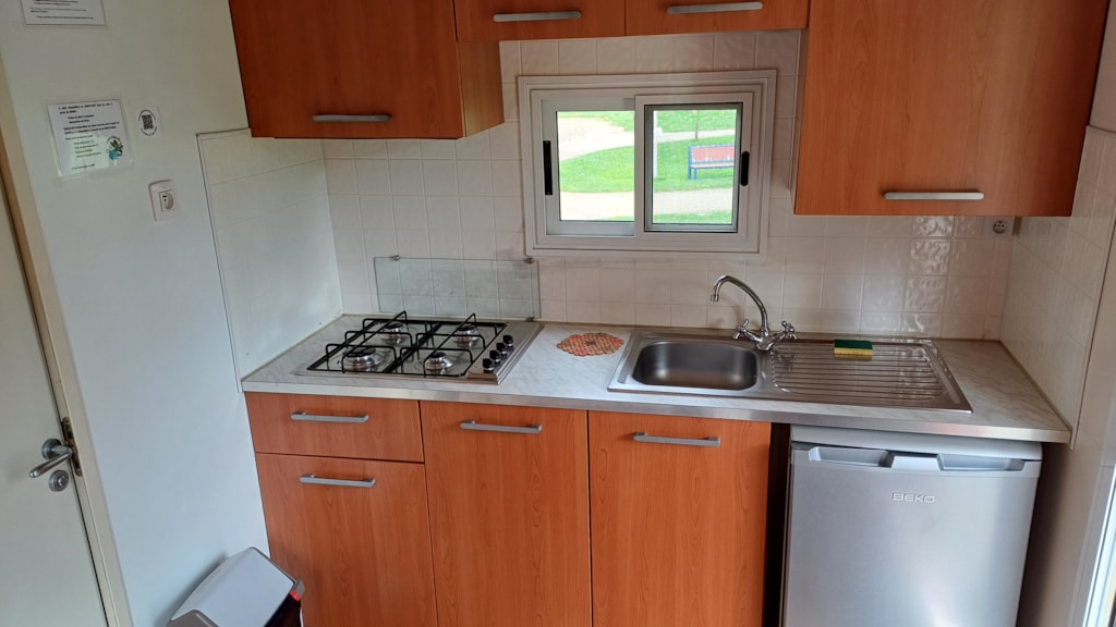 Der Campingplatz verfügt über 2 Mobilheime mit Terrasse für 6 Personen. davon 1 Schlafzimmer mit Doppelbett 140x190, 2 Schlafzimmer mit 2 Einzelbetten 80x190, Küche mit Gasherd, Mikrowelle, Kühlschrank, Geschirr, elektrische Kaffeemaschine, Bett- und Fleecedecken vorhanden, separates WC, Bad mit Dusche. Bettwäsche, Kissenbezüge, Bettbezüge werden nicht gestellt - Miete oder Kauf von Einwegbettwäsche möglich. Ein Waschraum mit Waschmaschine und Trockner steht Ihnen zur Verfügung.