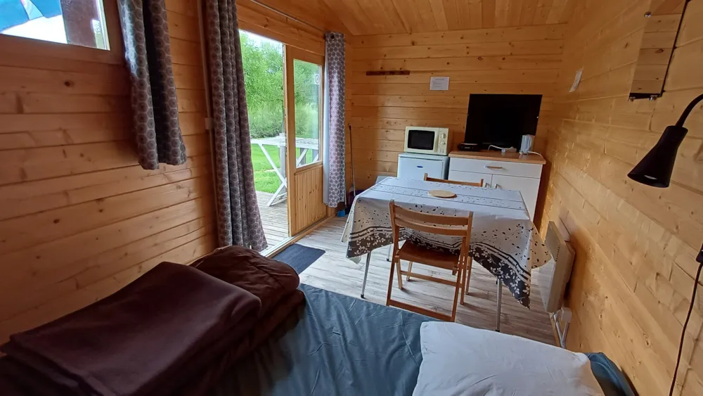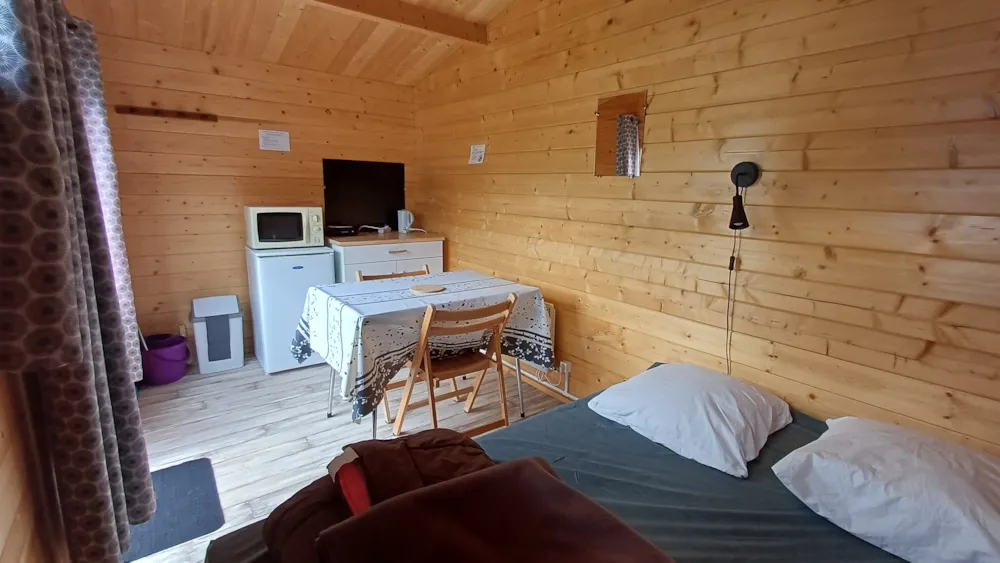 Chalet für 2 Pers. Ohne sanitäre Einrichtungen, einschließlich Doppelbett 140x190, Küchenbereich mit Mikrowelle, Kühlschrank, Geschirr, Bettdecke und Fleecedecke. Bettwäsche und Haushaltswäsche werden nicht zur Verfügung gestellt. Sie haben die Möglichkeit, Einwegblätter vor Ort zu kaufen. Ein Wäschebereich mit Waschmaschine und Trockner steht zu Ihrer Verfügung.