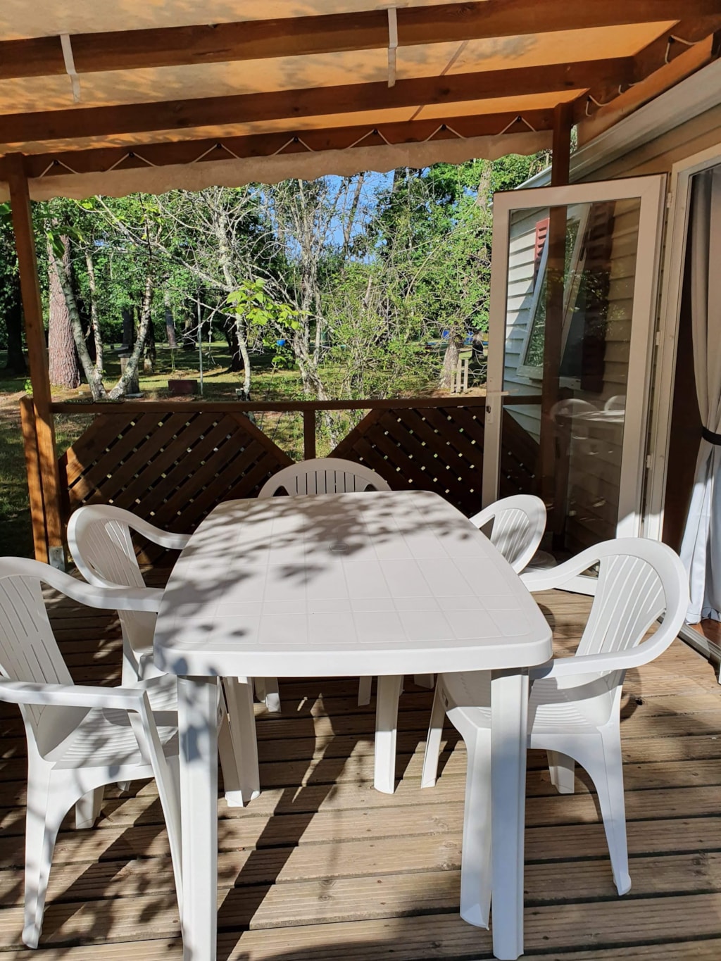 Cabane en hauteur avec sol en toile. Espace pique-nique en dessous de la tente.