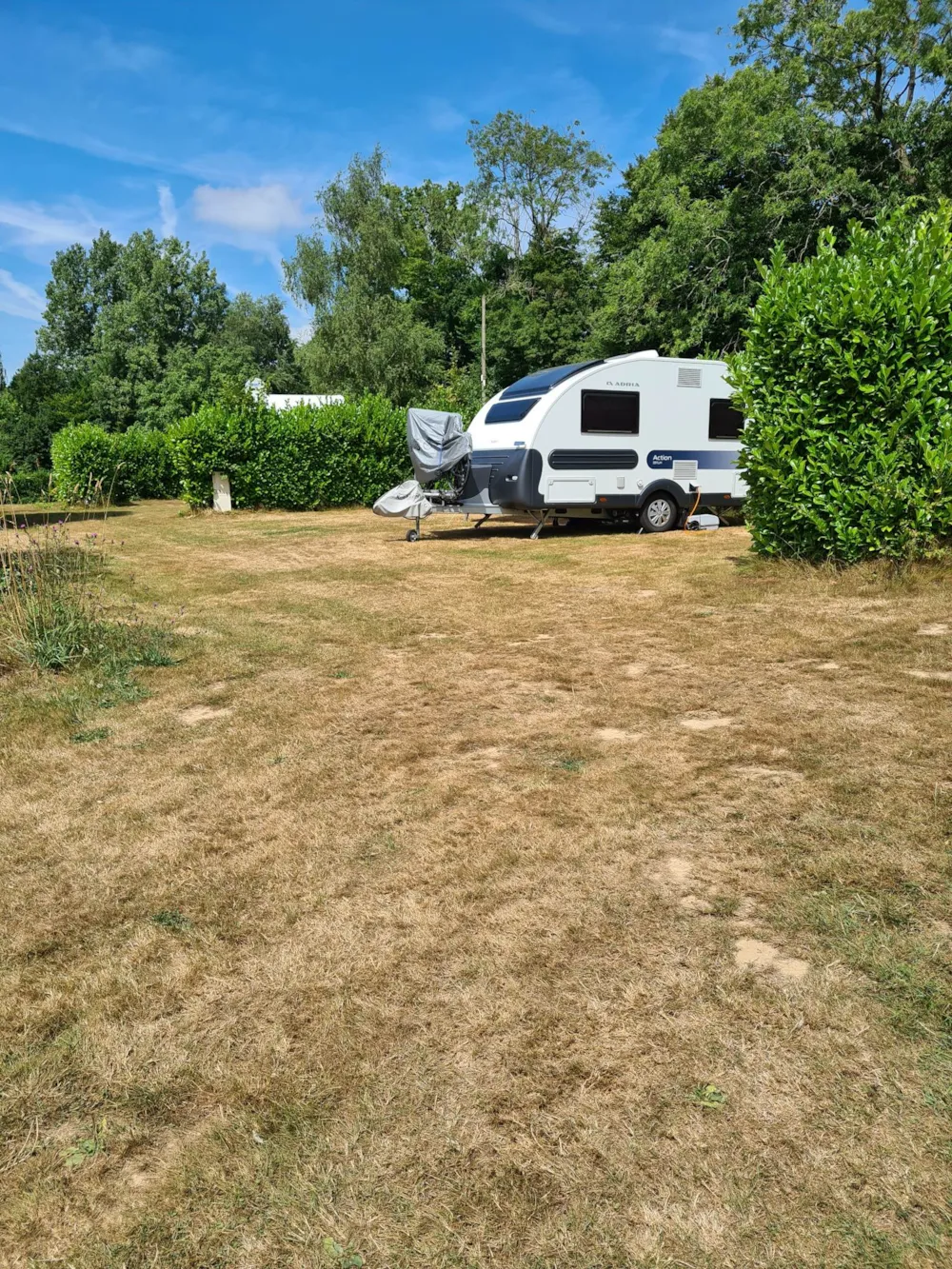 Großer, geräumiger Stellplatz, abgegrenzt durch grüne Hecken, der Privatsphäre und Ruhe bietet. Ideal für den Aufbau von Zelten, Wohnwagen oder Wohnmobilen. Hecken bieten sowohl natürlichen Schatten als auch Trennung von anderen Stellplätzen und sorgen so für eine ruhige und entspannende Atmosphäre. Das Gelände ist grasbewachsen und eignet sich für einen komfortablen Aufenthalt inmitten der Natur, aber dennoch in der Nähe der Annehmlichkeiten des Campingplatzes. Perfekt für Familien oder diejenigen, die ein wenig Abgeschiedenheit und dennoch eine freundliche Umgebung suchen.