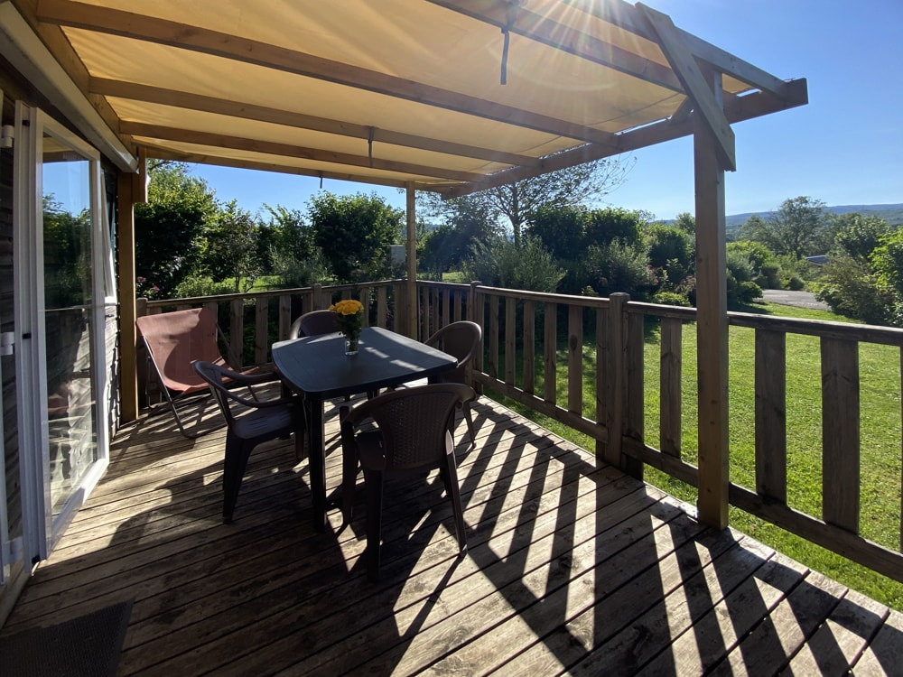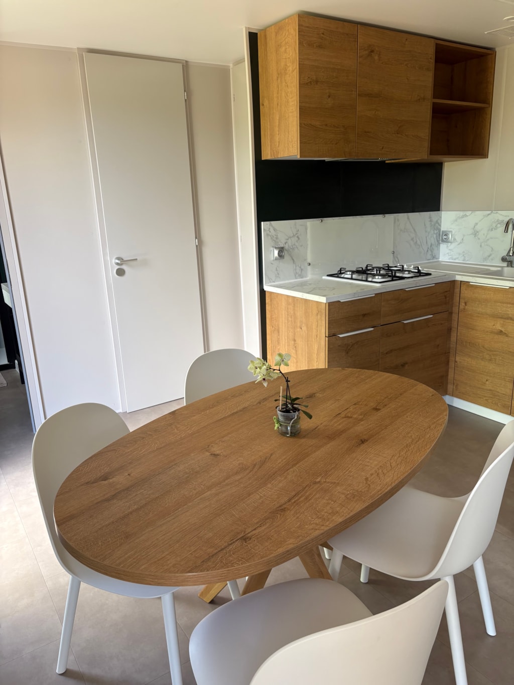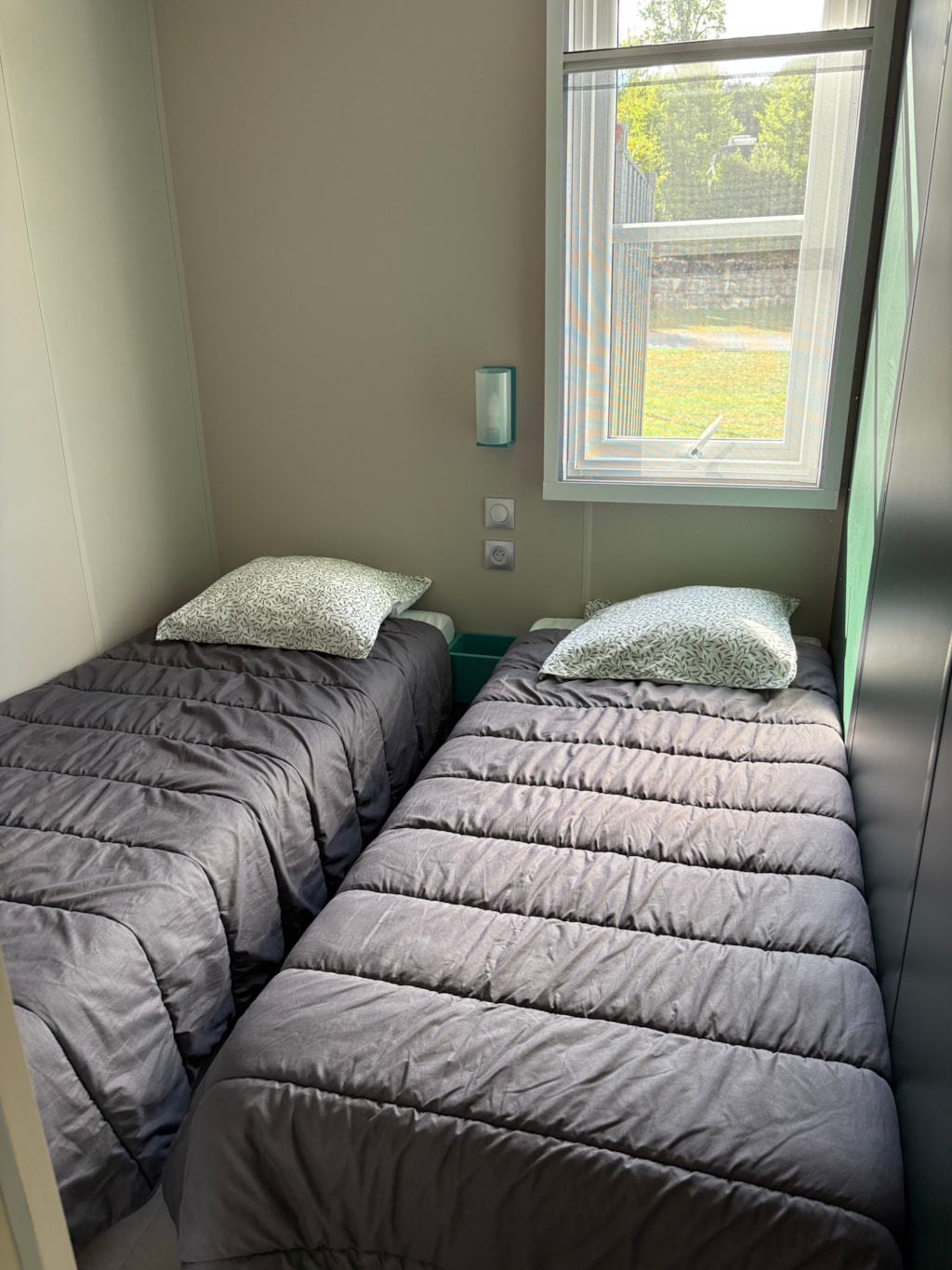 Le mobile home est situé sur les hauteurs du camping, vous offrant un beau paysage sur les couchers de soleil. Bardé de bois il s'intègre très bien à l'environnement naturel. Il est équipé d'une chambre parentale avec 1 lit 140x190 et l'autre chambre de 2 lits 80x190. La salle d'eau avec douche et lavabo dispose de 2 accès et permet ainsi un accès direct depuis la chambre parentale. Le wc est indépendant. Sur la terrasse le salon de jardin et le parasol vous permettront de prendre vos repas à l'extérieur. 1 animal accepté.