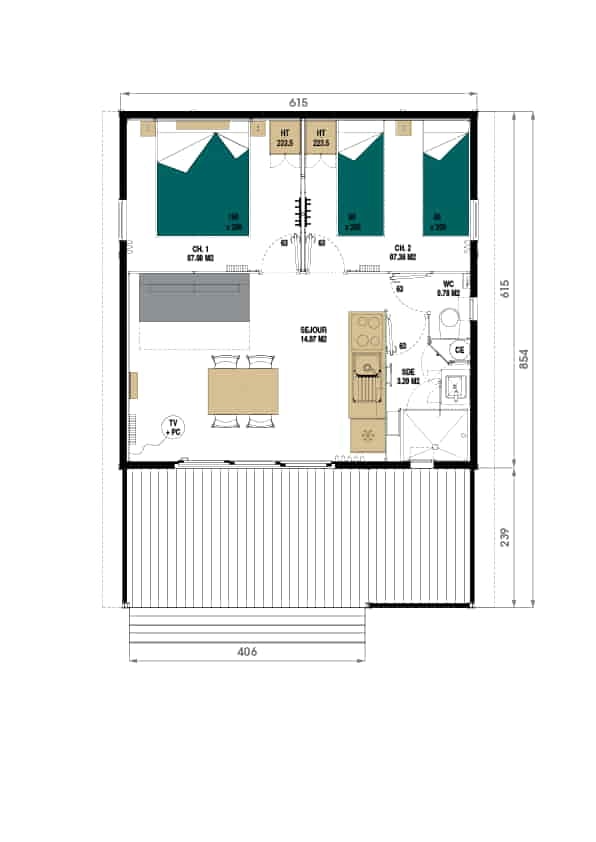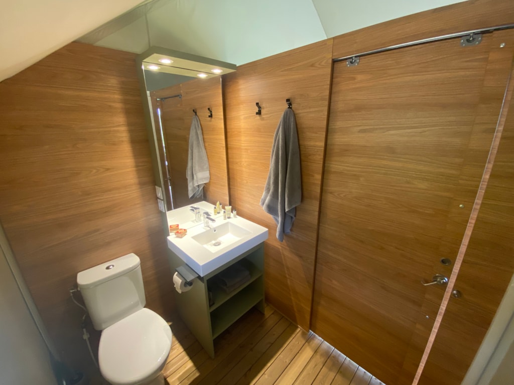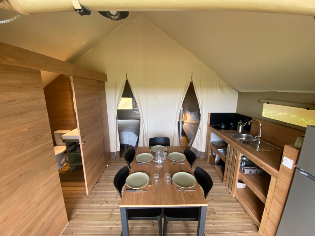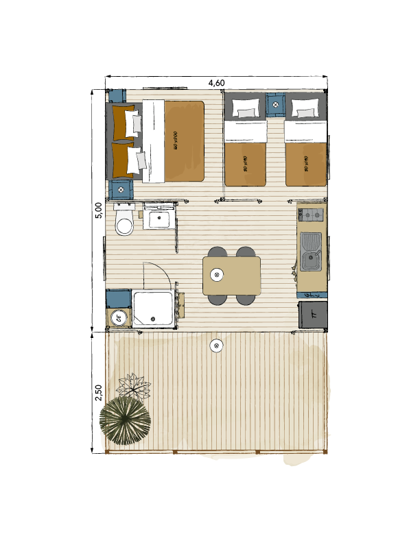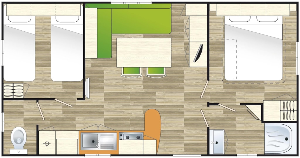 Le mobile home est situé sur les hauteurs du camping, vous offrant un beau paysage sur les couchers de soleil. Bardé de bois il s'intègre très bien à l'environnement naturel. Il est équipé d'une chambre parentale avec 1 lit 140x190 et l'autre chambre de 2 lits 80x190. La salle d'eau avec douche et lavabo dispose de 2 accès et permet ainsi un accès direct depuis la chambre parentale. Le wc est indépendant. Sur la terrasse le salon de jardin et le parasol vous permettront de prendre vos repas à l'extérieur. 1 animal accepté.