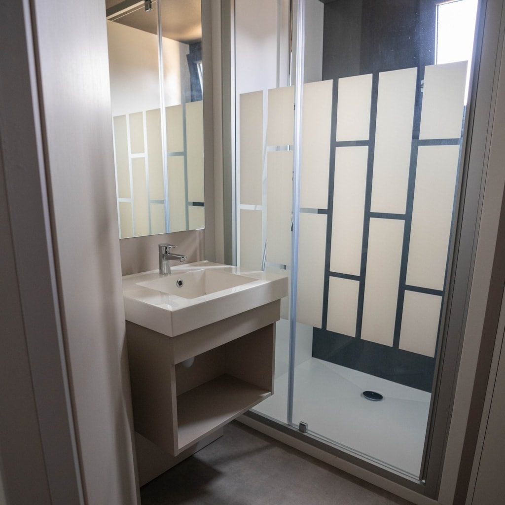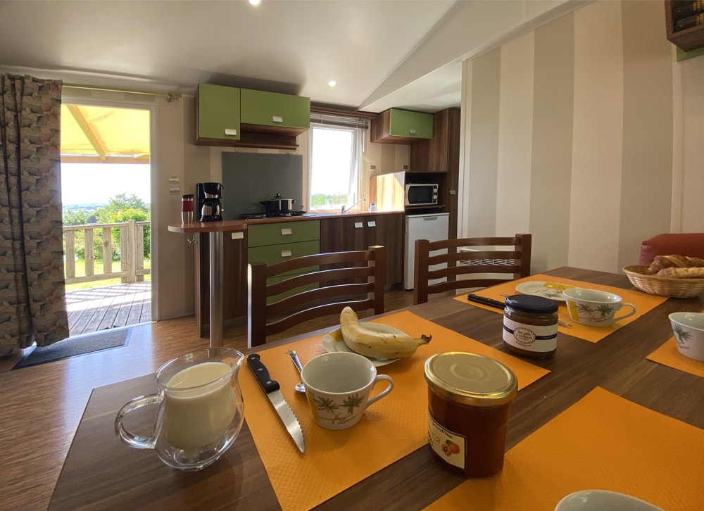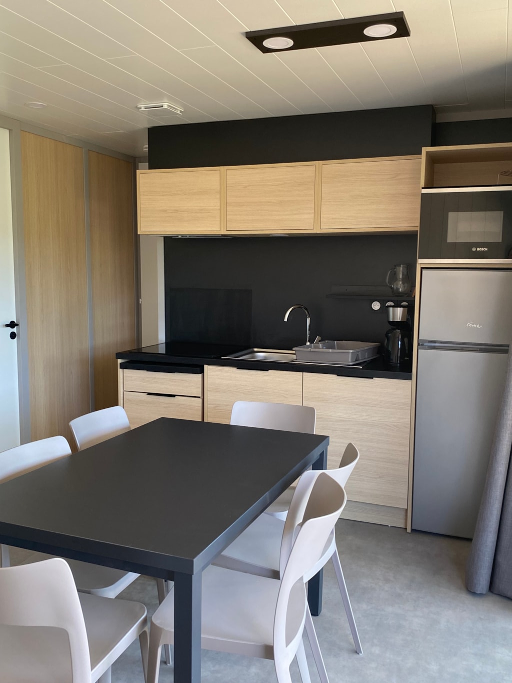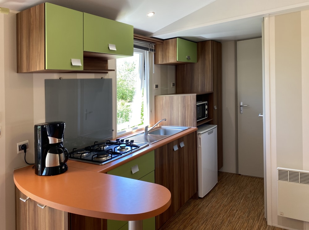 Le mobile home est situé à proximité des services du camping, vous offrant un beau paysage sur les couchers de soleil. Bardé de bois il s'intègre très bien à l'environnement naturel. Il est équipé d'une chambre parentale avec 1 lit 160x190 et l'autre chambre de 2 lits 80x190. La salle d'eau avec douche et lavabo est moderne et fonctionnelle. Le wc est indépendant. La terrasse de plein-peid avec sa pelouse privative propose un salon de jardin et le parasol vous permettant de prendre vos repas à l'extérieur.