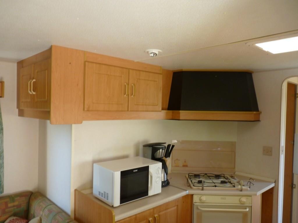 Wohnzimmer, Essbereich, Ausgestattete Küche: Gaswarmwasserbereiter, Kühlschrank, 4 Gasringe, Mikrowelle