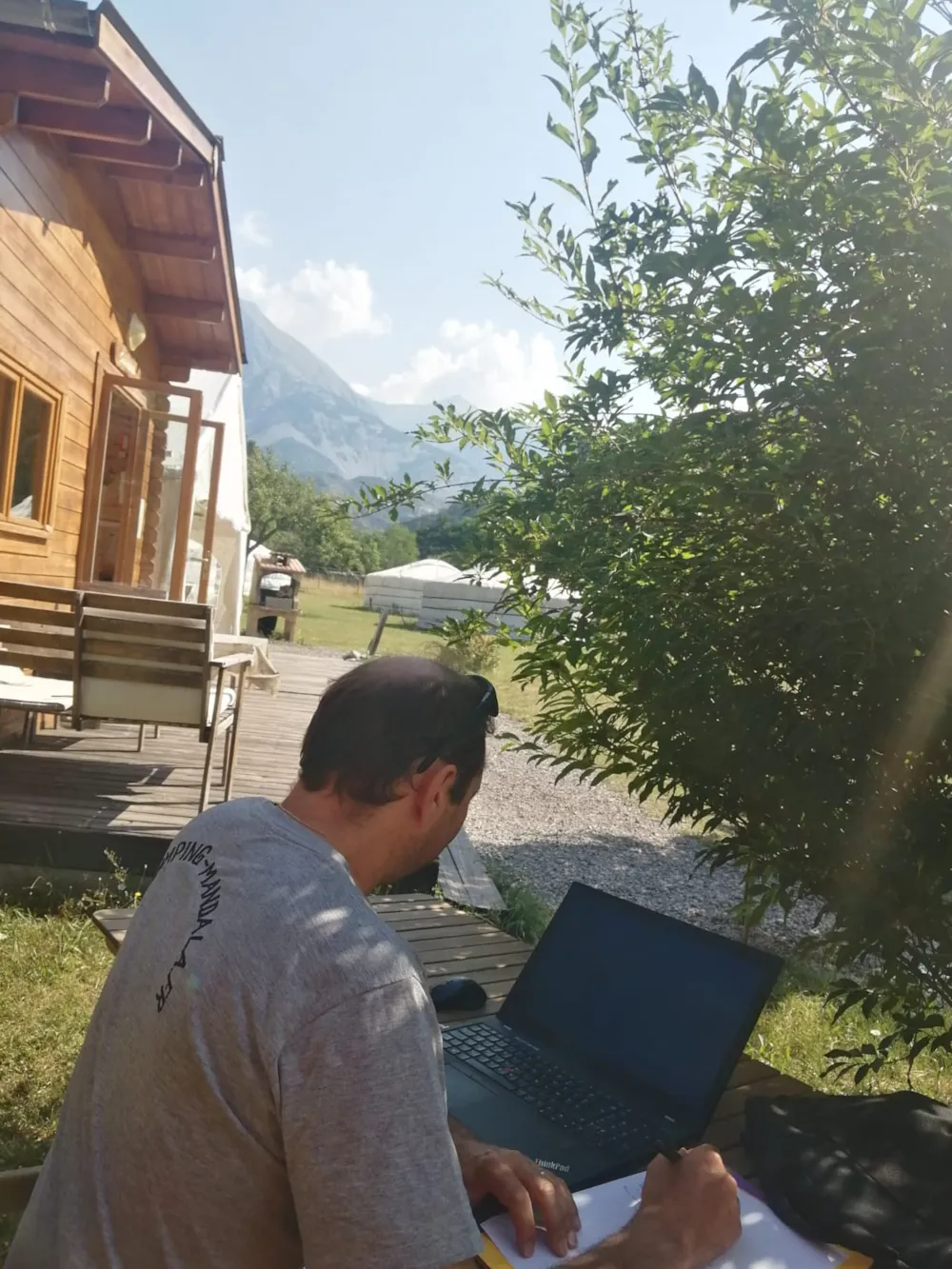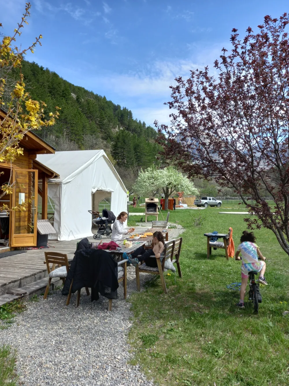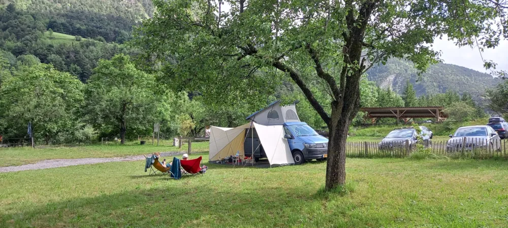 Wir bieten Ihnen geräumige Stellplätze mit Blick auf die Berge oder eingebettet im Grünen, auf Gras oder Sand, schattig oder halbschattig. Die Fahrzeuge bleiben auf einem schattigen Parkplatz in der Nähe der Stellplätze oder auf einem großen Parkplatz, wo Ihnen Handwagen zum Transport Ihrer Sachen zur Verfügung stehen.