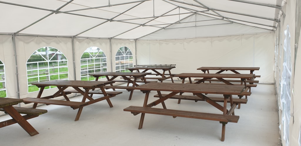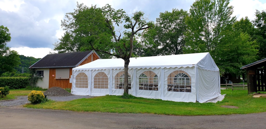 Zelt mit 1 Schlafzimmer (2 Betten 80x190cm) und mit einem bedeckten Tisch