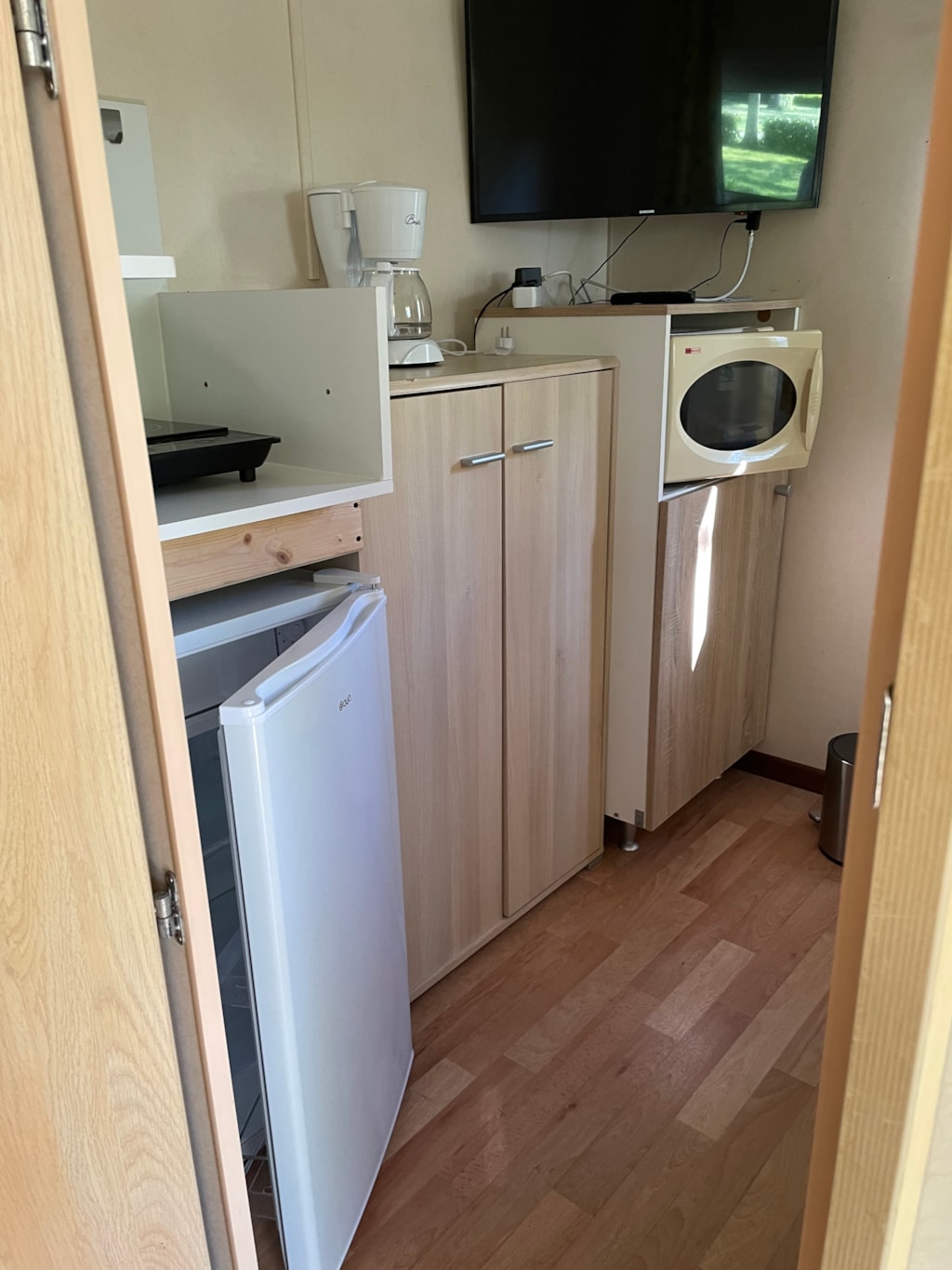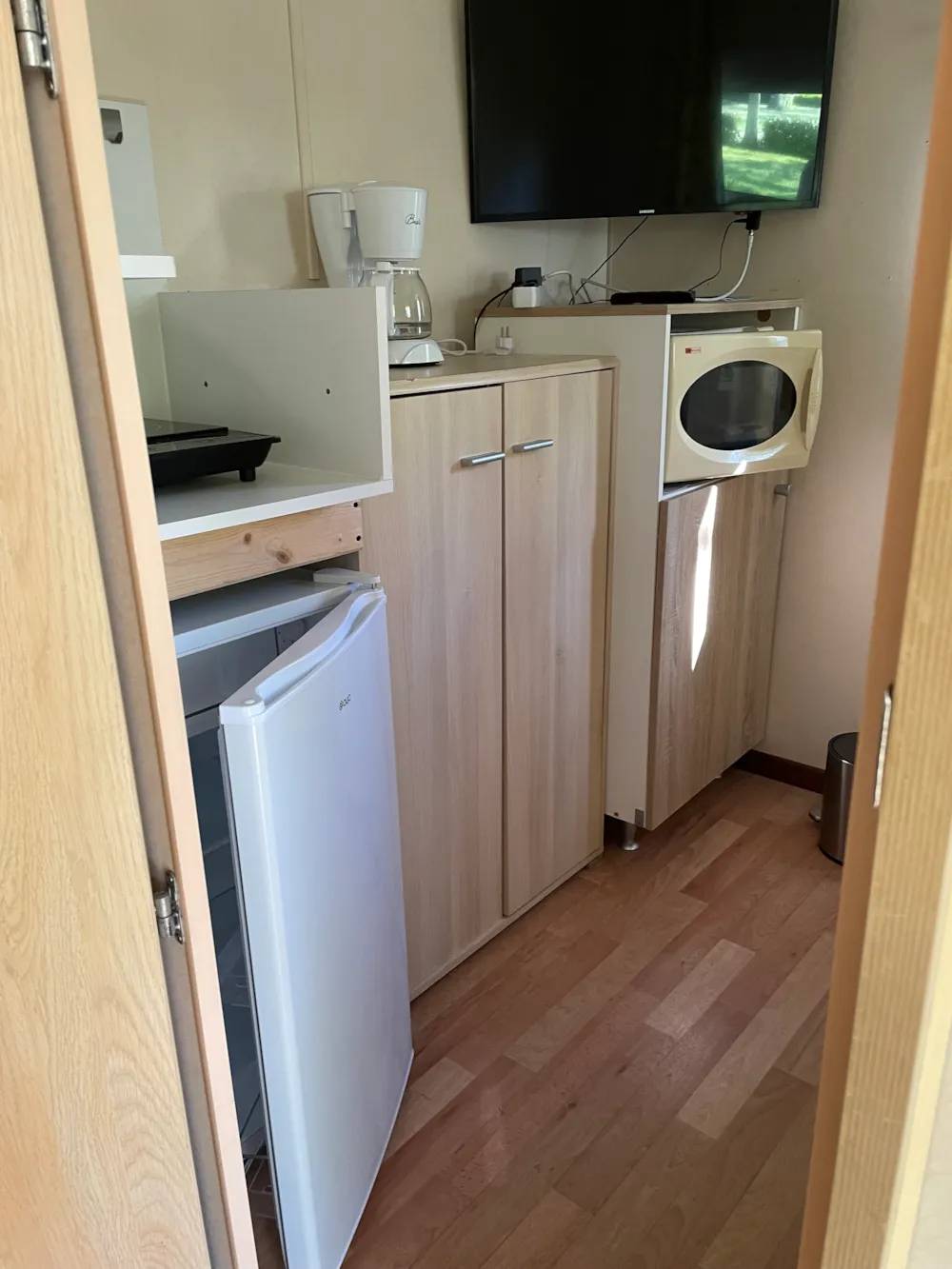 mobil home 1 chambre. La cabane :pour 1 ou 2 personne 1 chambre , 1 kitchinette toute équipée (micro-onde,plaque,frigo et vaisselles) clim reversible. Terrasse couverte.