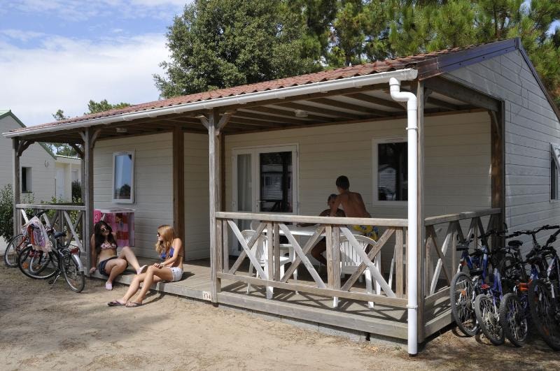 The chalet, over 7 years old, with a wooden structure, has a spacious main room with a kitchen area, a dining area with television, 2 bedrooms, one with a 140 cm wide bed for 2 people and a bedroom for children with 2 bunk beds and 1 bed (width 70 cm), and a bathroom with shower, sink and a toilet separate from the bathroom. The terrace is fully covered and is equipped with garden furniture.