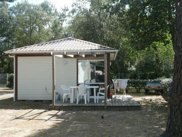 The chalet, a wooden structure, over 7 years old, has a spacious main room with a kitchen and a dining area with television, 3 bedrooms, one with a 140 cm wide bed for 2 people, one with 2 beds 80 cm wide and a third for children with 2 bunk beds and 1 single bed (width 70 to 80 cm), a toilet and a bathroom with shower. The terrace is fully covered and is equipped with garden furniture (table and chairs).