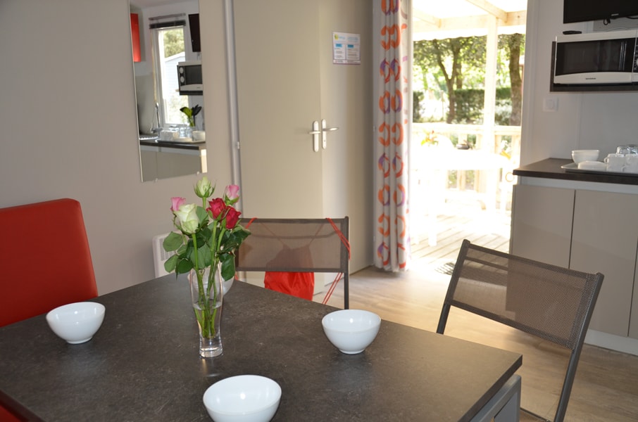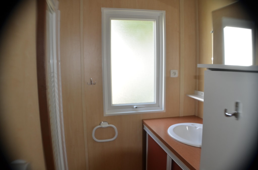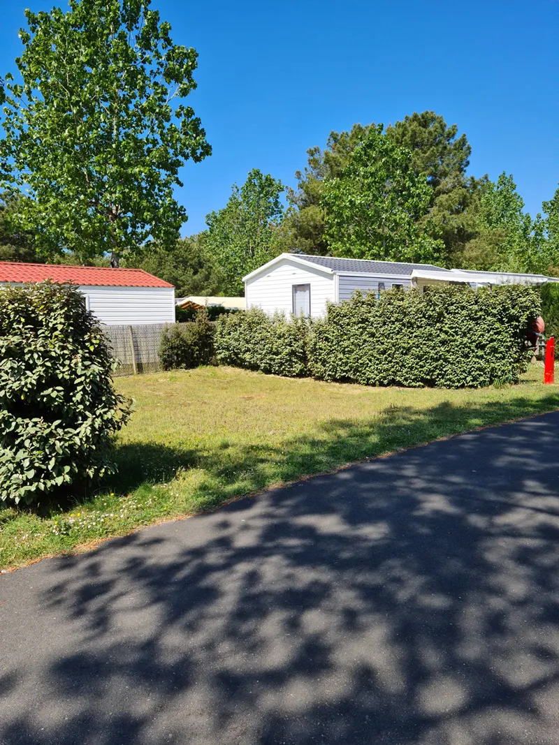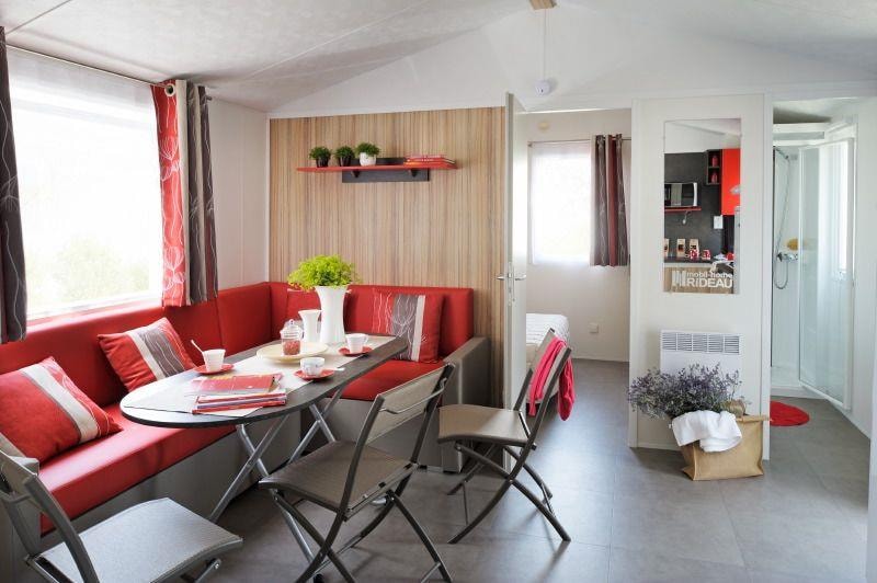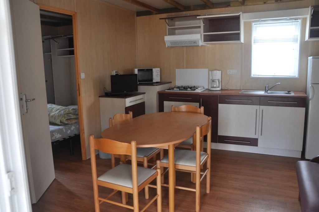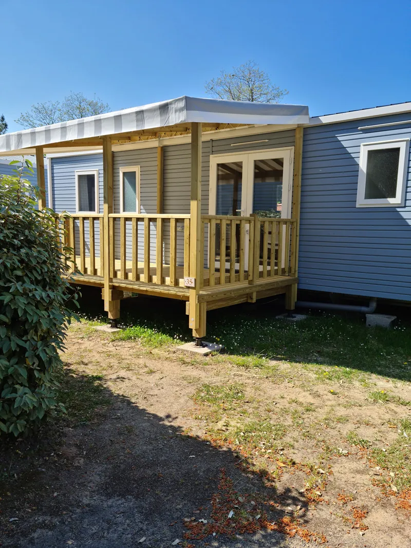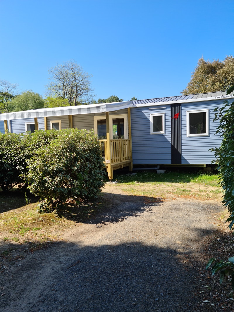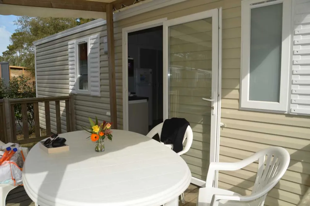 The spacious mobile home, very comfortable and well equipped. It has a large semi-covered terrace with a furnished corner (chairs and coffee table) and a dining area (table and chairs). It has a main room with a kitchen area with dishwasher, a dining area with table and chairs and a seating area with bench and TV, 2 bedrooms including 1 with a bed 160 cm wide for 2 people and another bedroom with 2 beds 80 cm wide, a toilet and a bathroom with shower