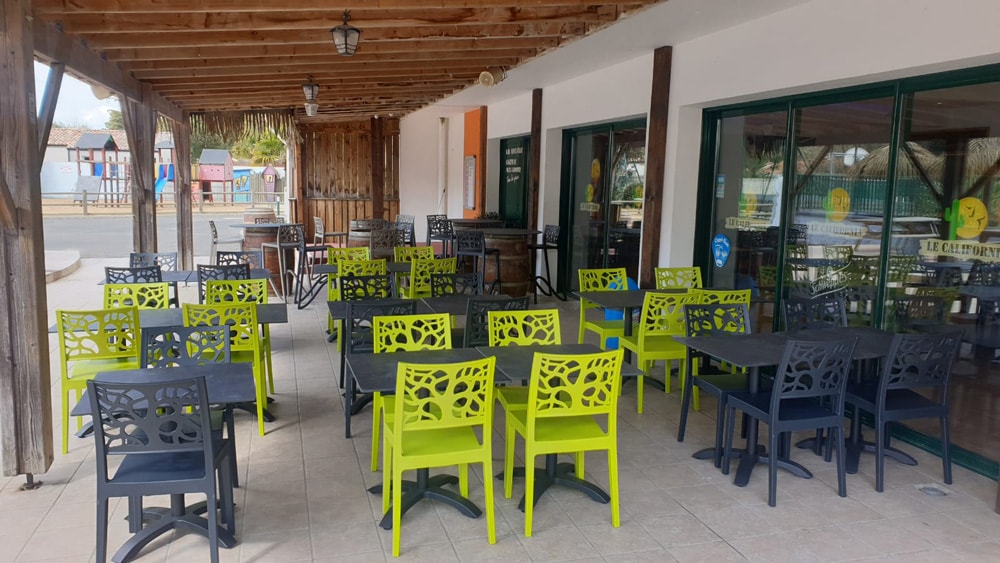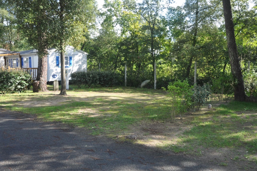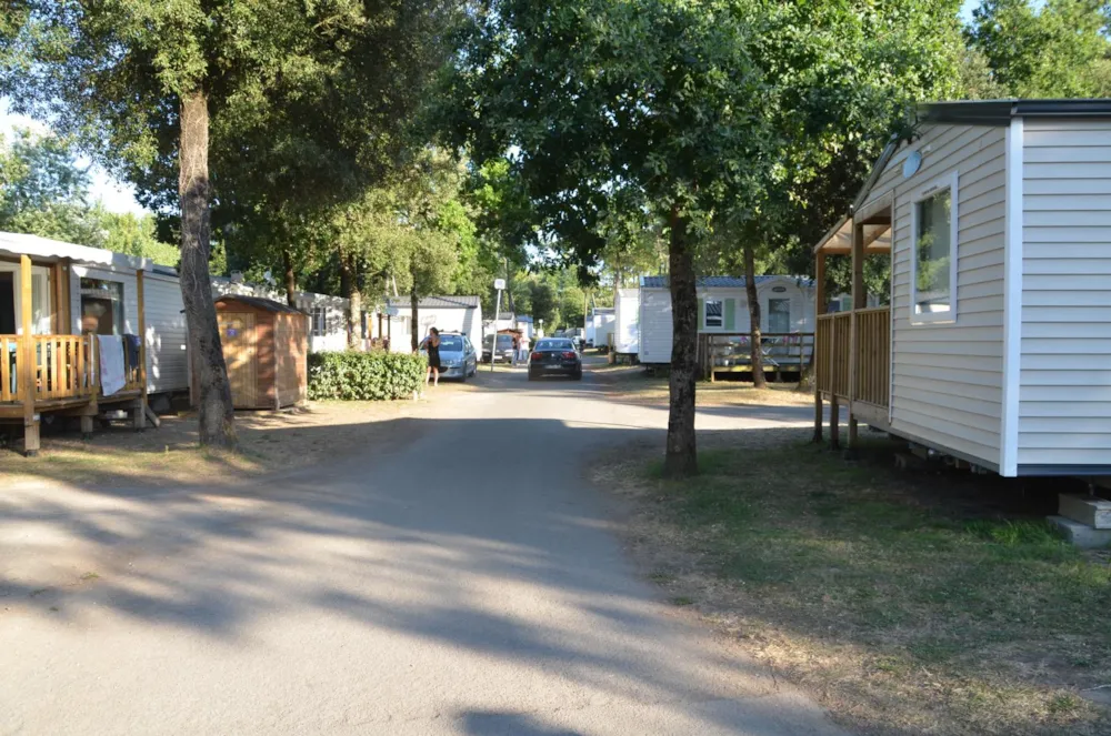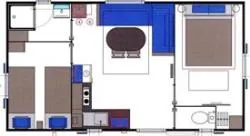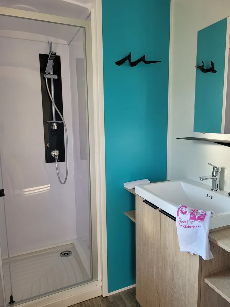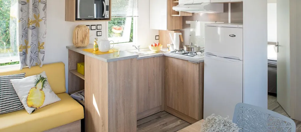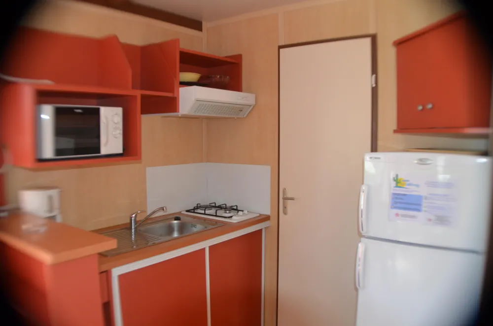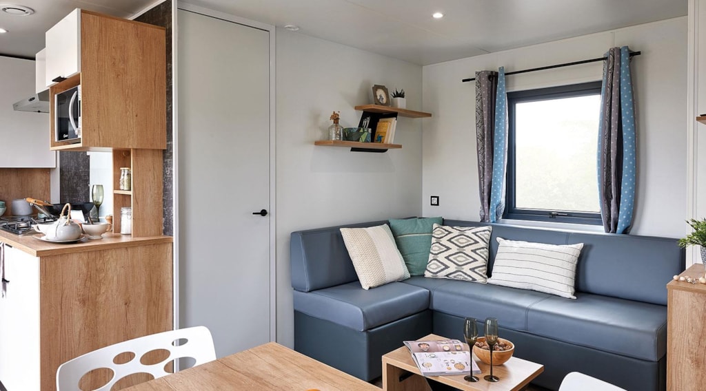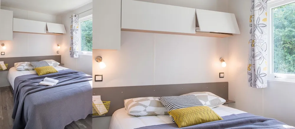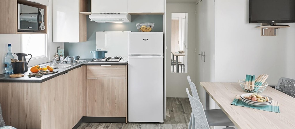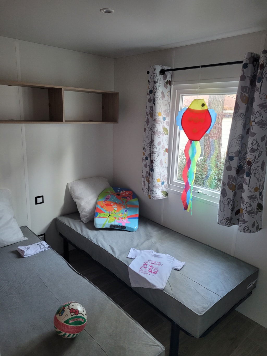 The spacious mobile home, very comfortable and well equipped. It has a large semi-covered terrace with a furnished corner (chairs and coffee table) and a dining area (table and chairs). It has a main room with a kitchen area with dishwasher, a dining area with table and chairs and a seating area with bench and TV, 2 bedrooms including 1 with a bed 160 cm wide for 2 people and another bedroom with 2 beds 80 cm wide, a toilet and a bathroom with shower
