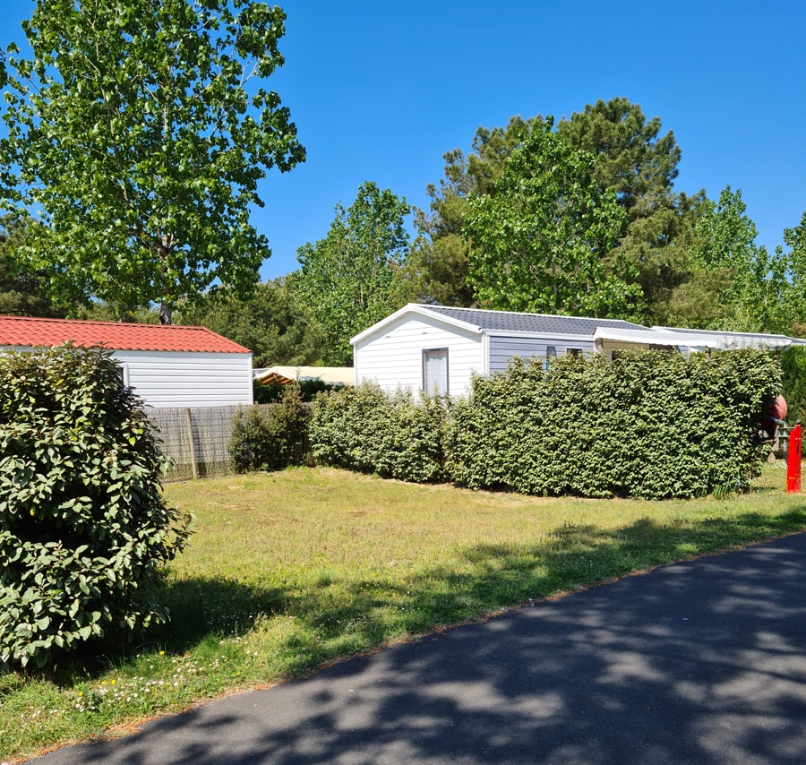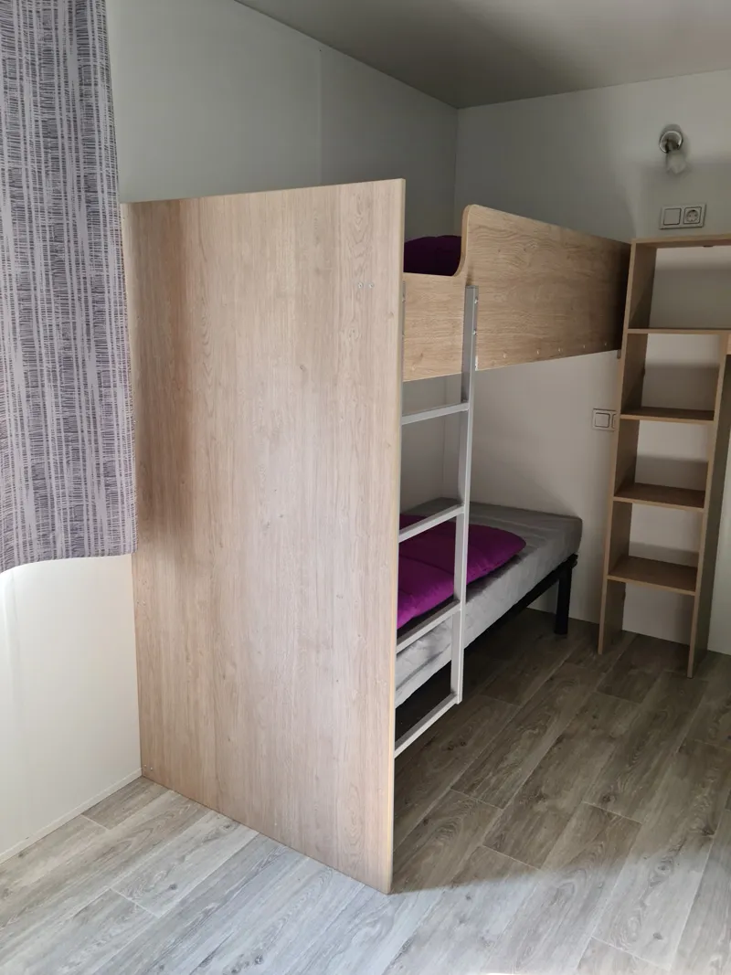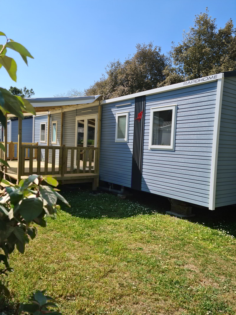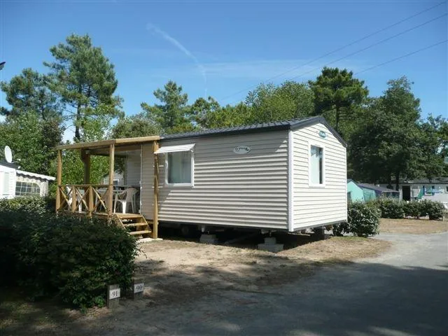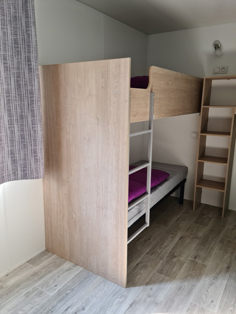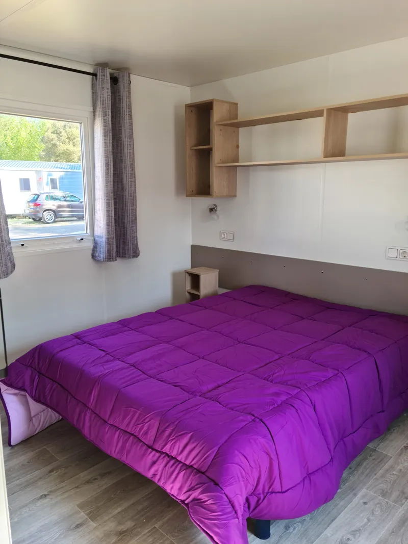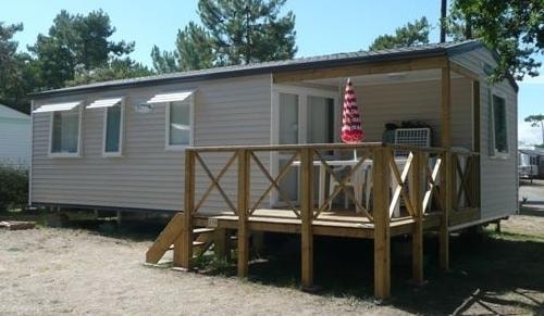 The mobile home is new, well equipped . It has a main room (with a kitchen area, a dining area and a living room with bench and TV), 4 bedrooms including 2 bedrooms with a bed 140 cm wide for 2 people and 2 other bedrooms with 2 beds 80 cm wide, a toilet and a bathroom with shower. It overlooks a semi-covered wooden terrace (table and chairs).