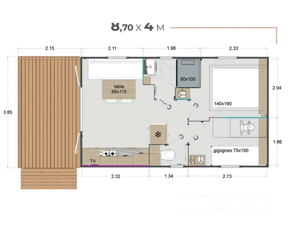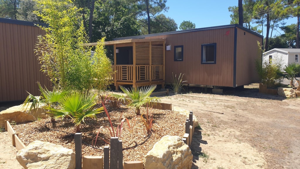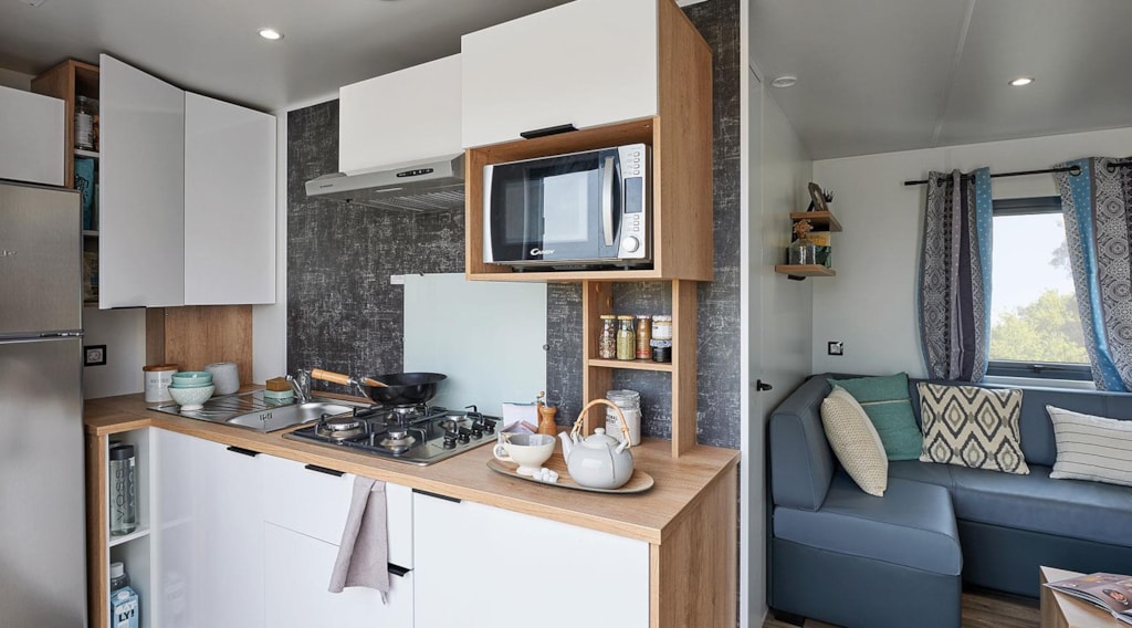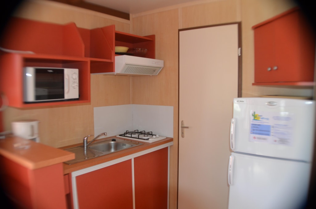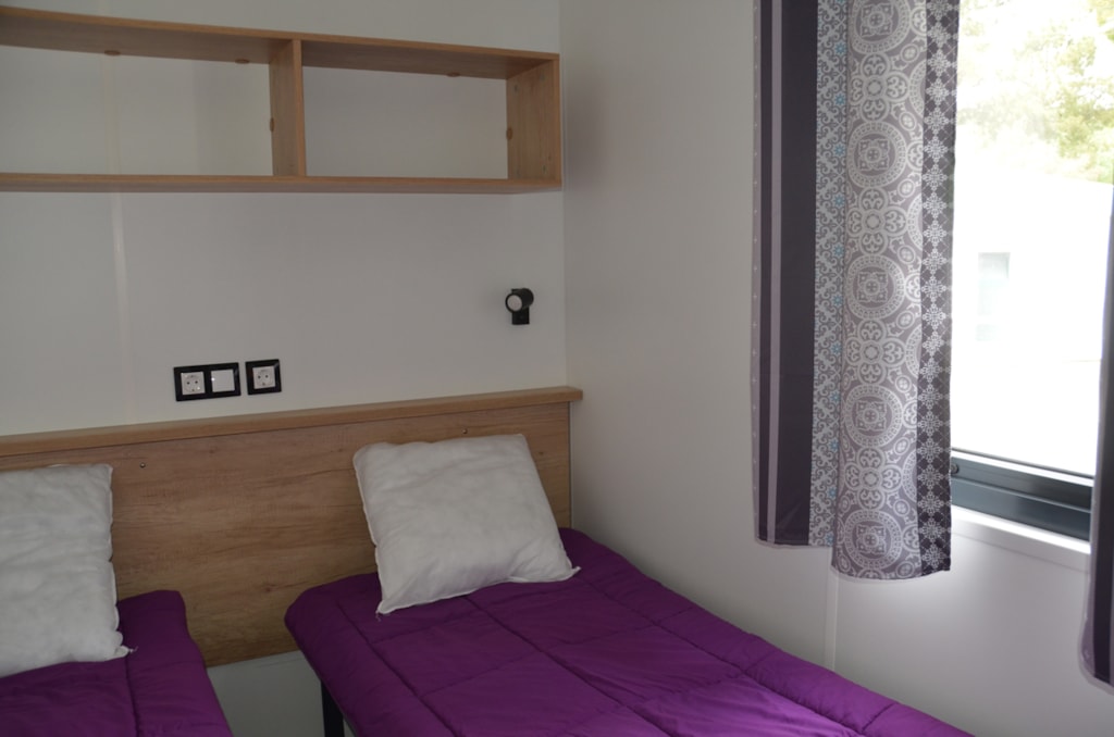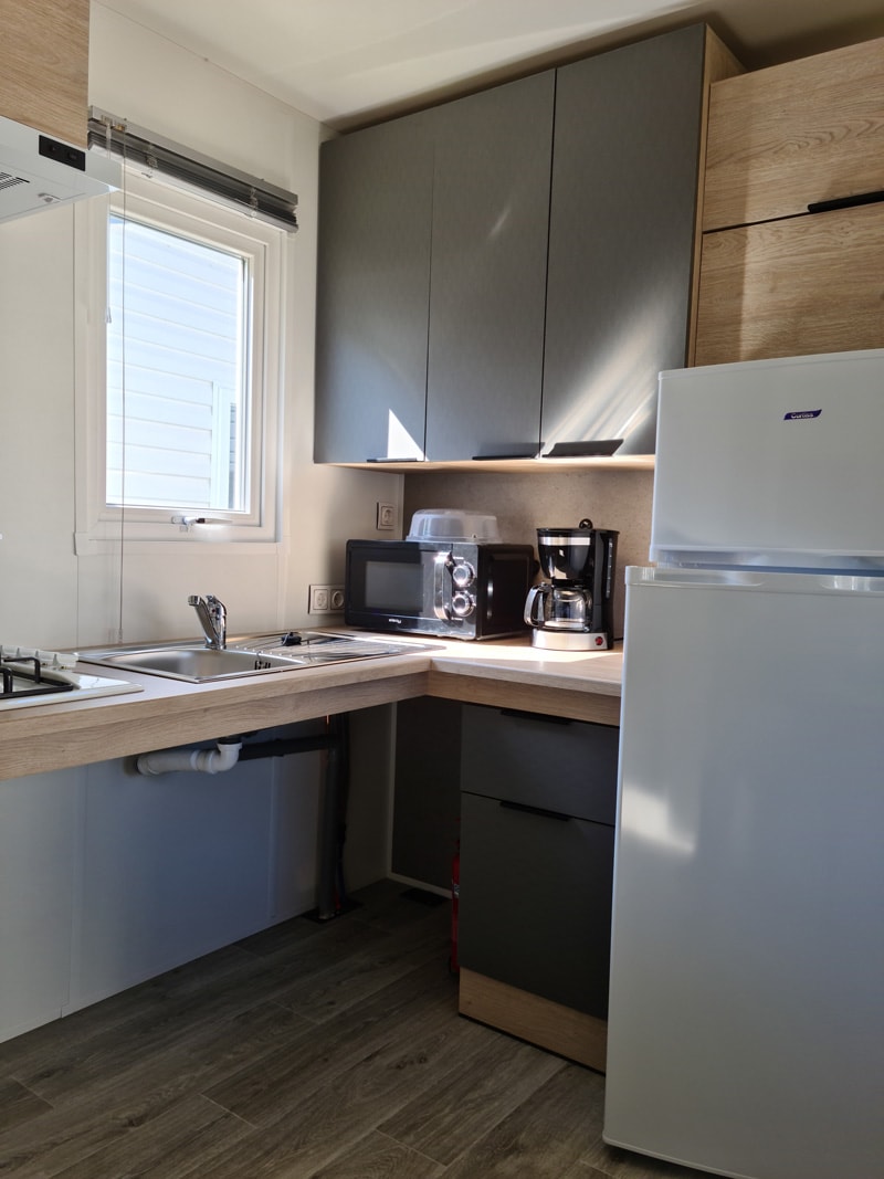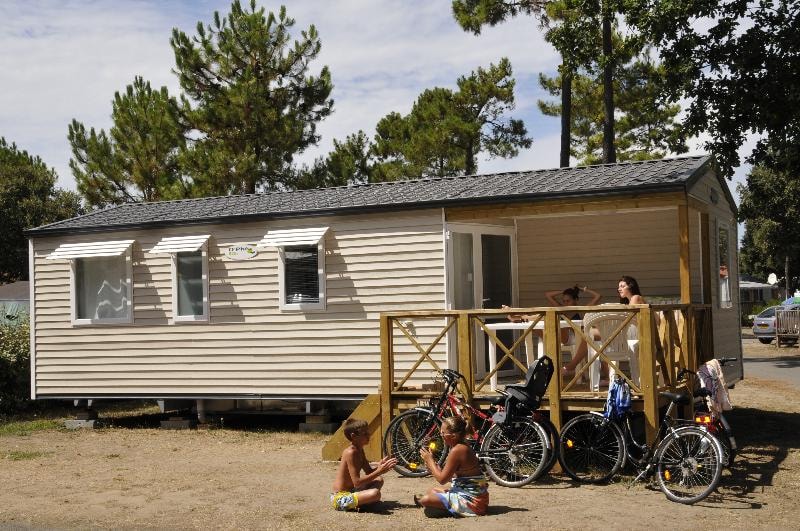 The mobile home is new, well equipped . It has a main room (with a kitchen area, a dining area and a living room with bench and TV), 4 bedrooms including 2 bedrooms with a bed 140 cm wide for 2 people and 2 other bedrooms with 2 beds 80 cm wide, a toilet and a bathroom with shower. It overlooks a semi-covered wooden terrace (table and chairs).
