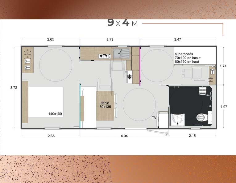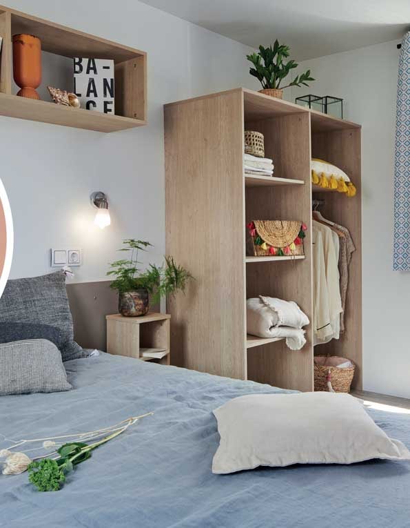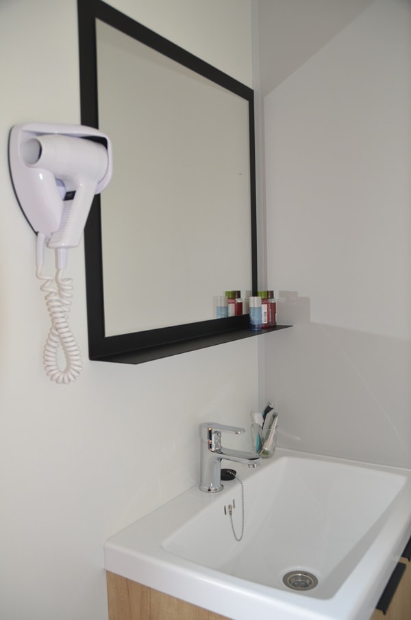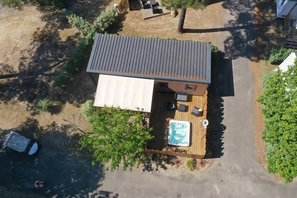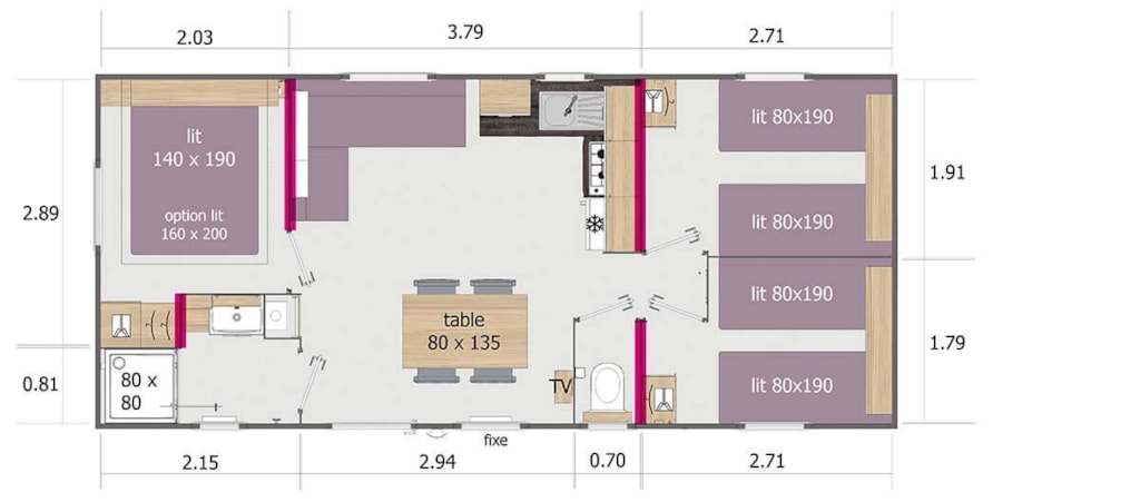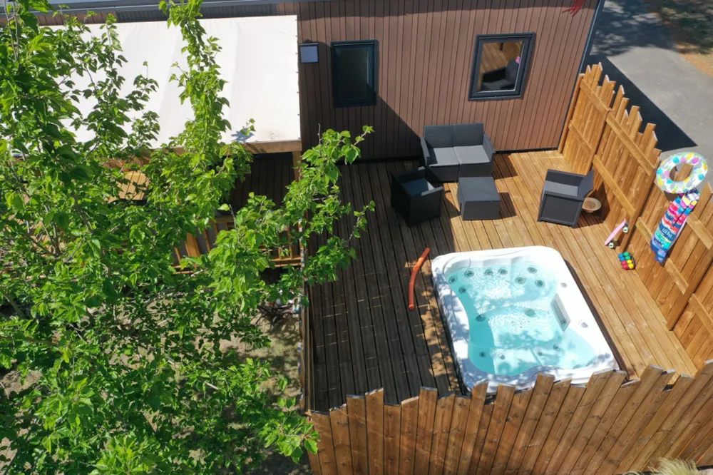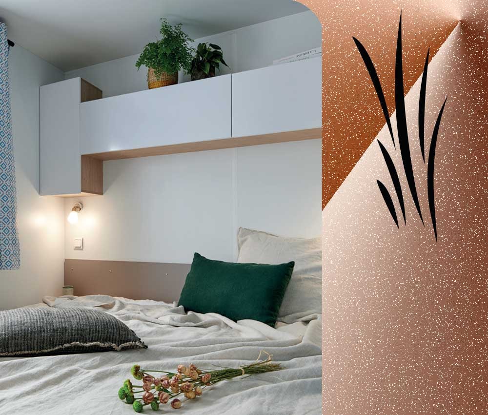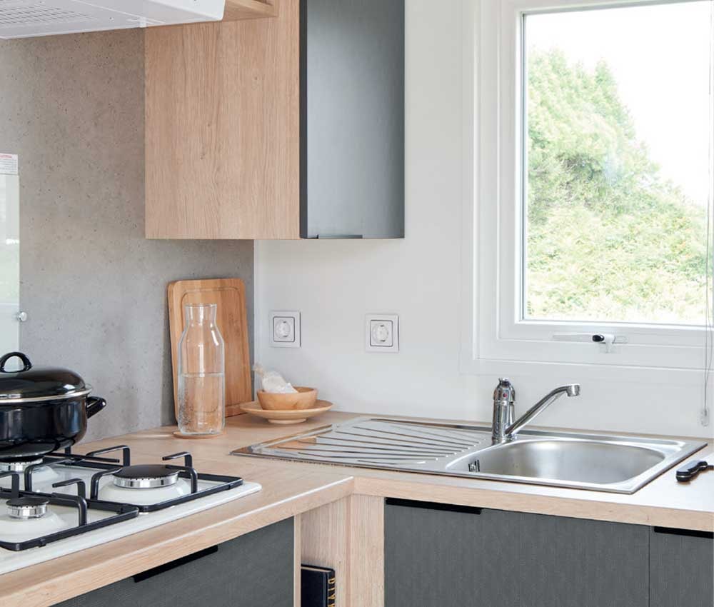The mobile home is new, well equipped . It has a main room (with a kitchen area, a dining area and a living room with bench and TV), 4 bedrooms including 2 bedrooms with a bed 140 cm wide for 2 people and 2 other bedrooms with 2 beds 80 cm wide, a toilet and a bathroom with shower. It overlooks a semi-covered wooden terrace (table and chairs).