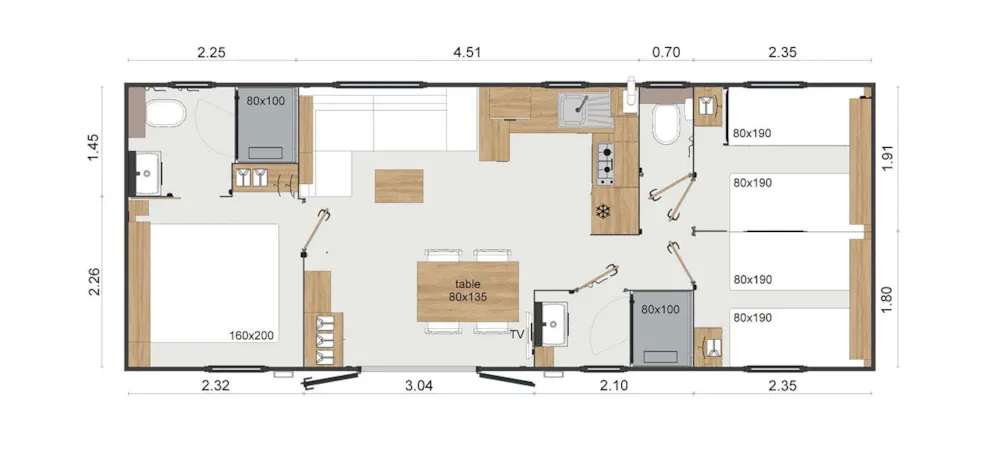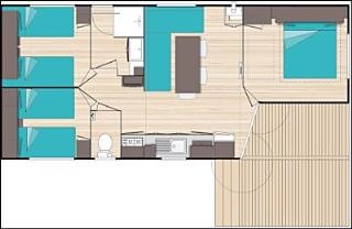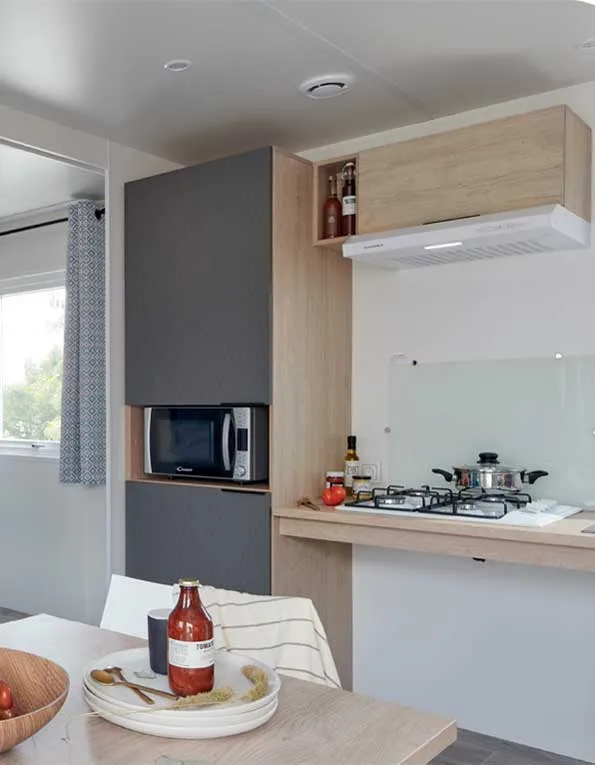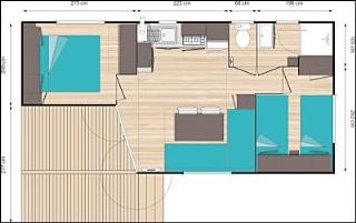 This mobile home can accommodate 4 people. The distribution of rooms allows the movement of people with reduced mobility
