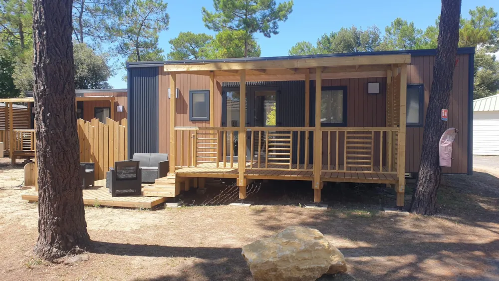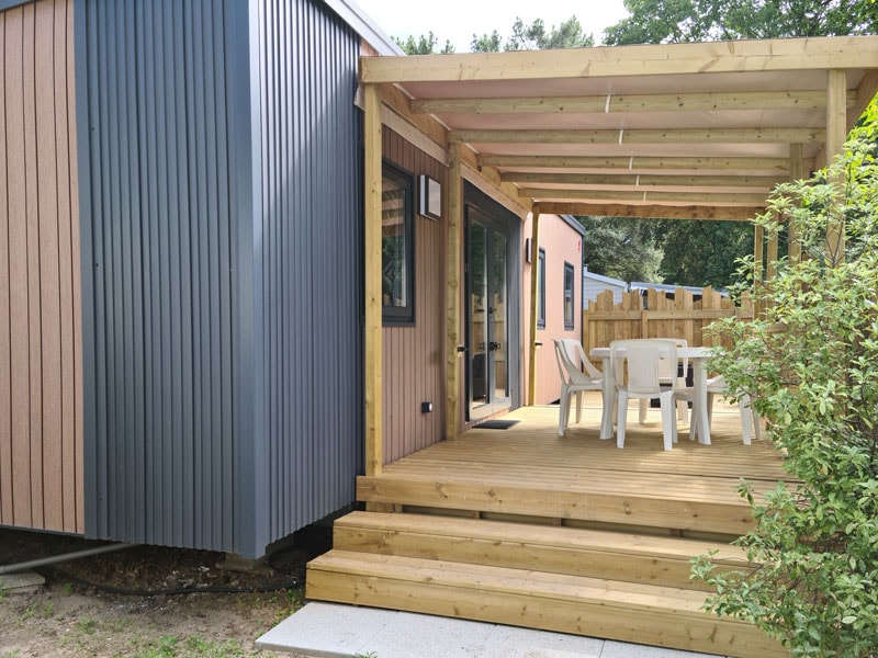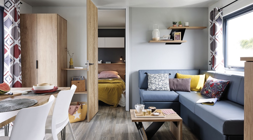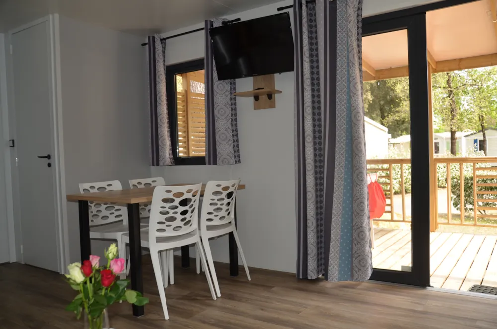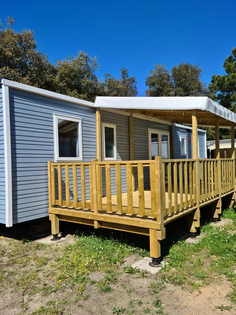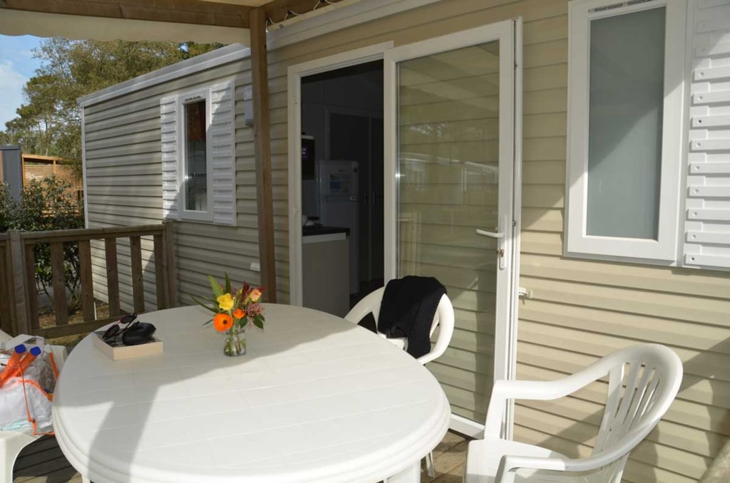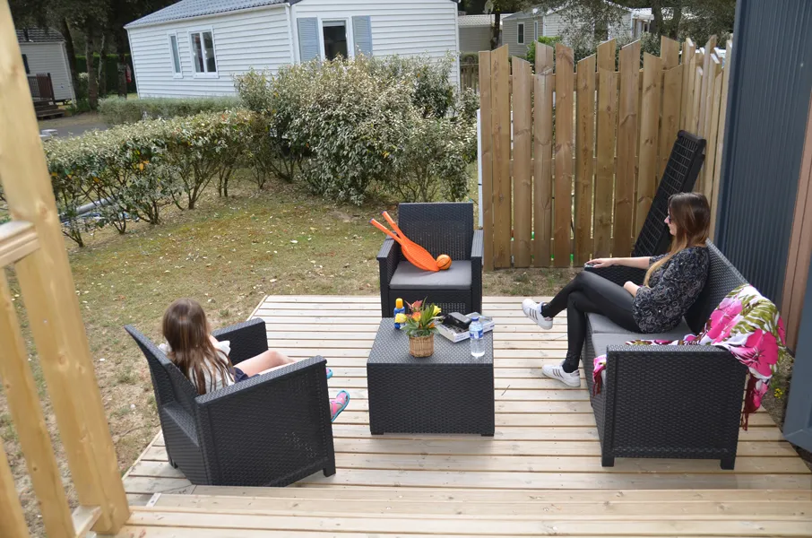 Mobile home standing equipped with 3 bedrooms, 2 bathrooms, a living room with a lounge area with television, a dining area, a kitchen area with dishwasher and a semi-covered terrace with garden furniture