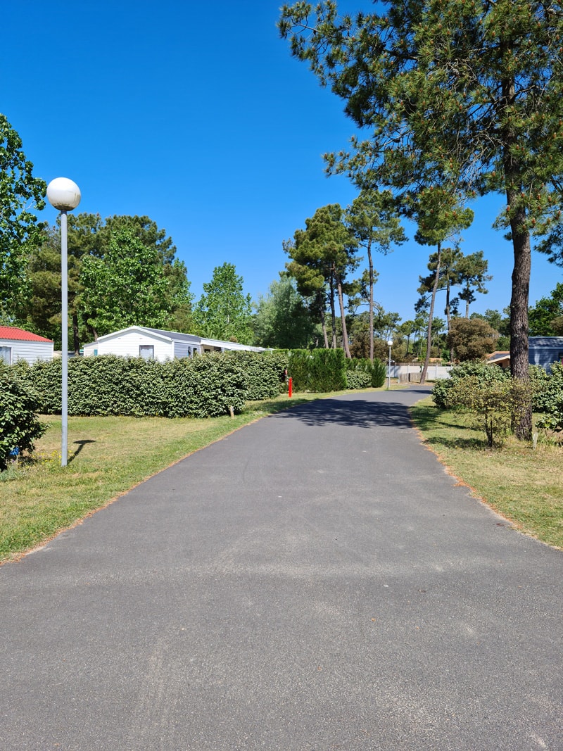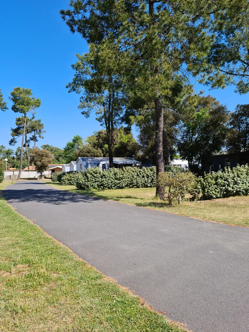 The spacious mobile home, very comfortable and well equipped. It has a large semi-covered terrace with a furnished corner (chairs and coffee table) and a dining area (table and chairs). It has a main room with a kitchen area with dishwasher, a dining area with table and chairs and a seating area with bench and TV, 3 bedrooms including 1 with a bed 160 cm wide for 2 people and 2 other rooms with 2 beds 80 cm wide, a toilet and a bathroom with shower